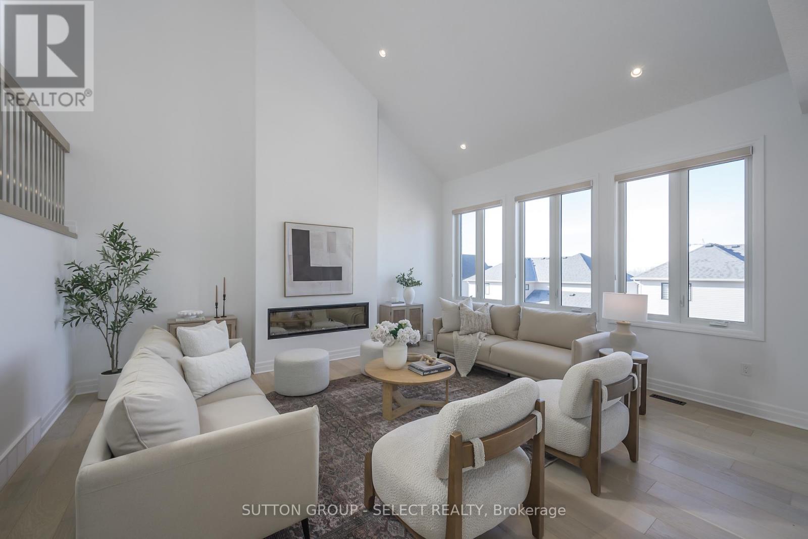 Architectural presence defines this customized Sifton-built residence in Riverbend's Upper West. Offering 2,697 sq ft above grade with a true walk-out lower level, the home delivers scale, proportion, and a level of completion that positions it confidently against new construction options. A raised elevation, stone façade, and covered front porch create balanced, welcoming curb appeal. Inside, a soaring vaulted ceiling commands the great room, anchored by a sleek linear fireplace and framed by a sculptural switchback staircase with an oversized mid-level landing and contemporary railing detail. Impressive windows draw natural light across the primary living areas. The landing introduces architectural drama rarely seen in this category. A soft, organic palette and white oak flooring throughout the main and second levels create warmth and cohesion. The kitchen was customized to enhance storage and flow. Quartz perimeter surfaces frame the space, while a contrasting granite island anchors it with depth and presence. Full-height cabinetry includes a glass-front display section, complemented by stainless steel appliances, pendant lighting, and a walk-in pantry. Expanded cabinetry improves everyday functionality while maintaining clean, modern lines. A private main floor office, separate dining room, and dedicated main floor laundry room enhance function & convenience. Upstairs, four generous bedrooms are supported by three full bathrooms - an increasingly essential configuration in executive homes of this scale. The primary suite offers lounge space, a walk-in closet, and a refined ensuite with soaker tub and glass shower. The comfort of the expansive covered deck extends the main level outdoors, creating meaningful three-season living space. Stairs lead to the fully fenced backyard below. The bright walk-out lower level provides 1,398 sq ft of future flexibility. Finished. Composed. Architecturally distinctive - turn-key living from day 1. (id:64974)