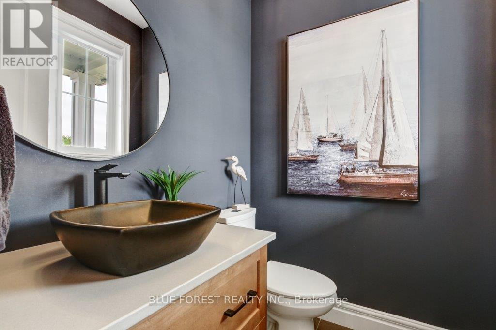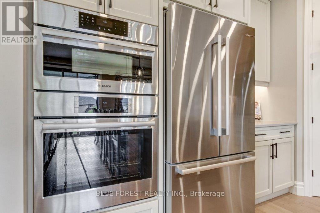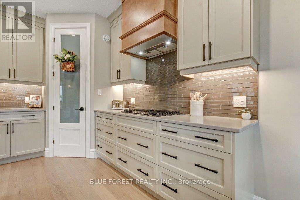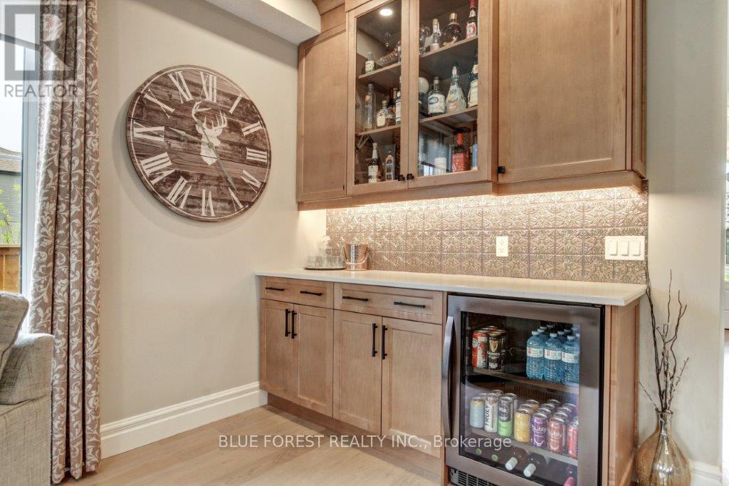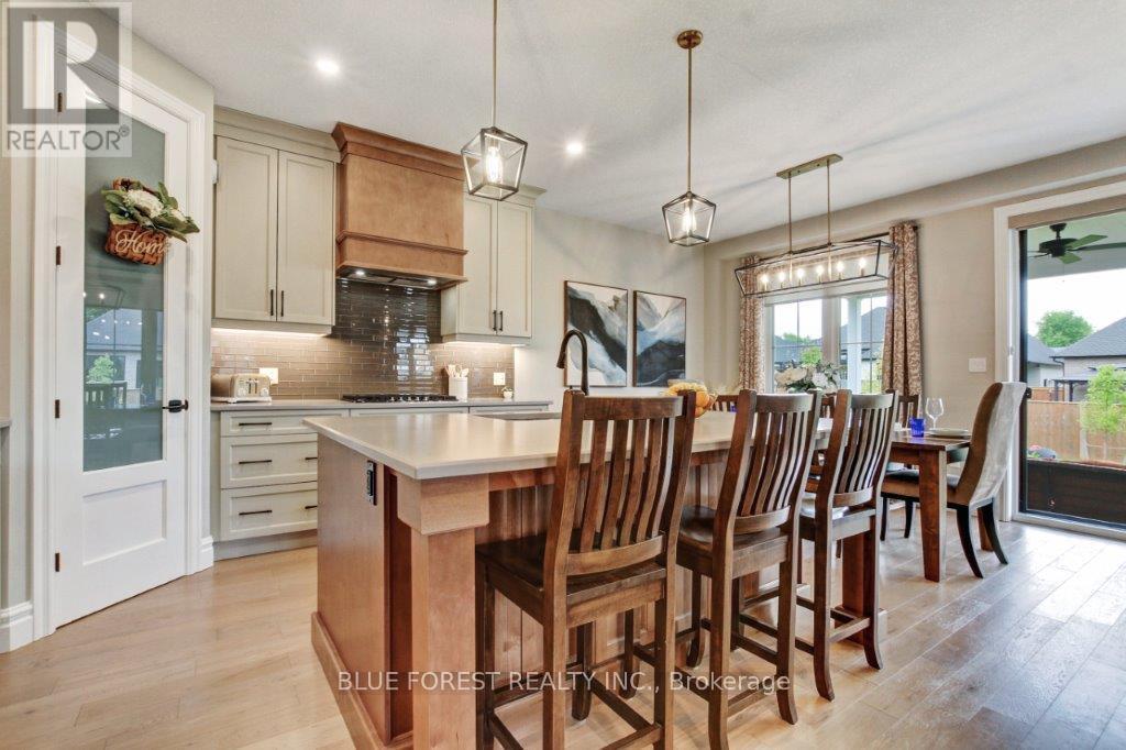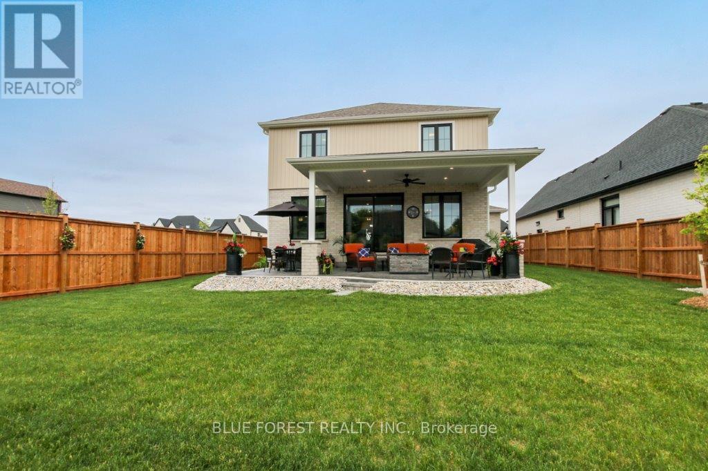 Stunning 2-Year-Old home in desired Thorndale. Two-Storey - 3 Beds, 3 Baths. Straight out of a magazine, this remarkable home offers sophisticated design, thoughtful upgrades, and a corner-lot location with a private, fully fenced, landscaped yard. Step inside the open foyer be welcomed by engineered hardwood and designer tile floors which flow throughout the main level leading to a dramatic great room anchored by a floor-to-ceiling brick fireplace-perfect for cozy evenings sitting by the firealong with a built-in bar. The gourmet kitchen is a chef's dream, featuring quartz countertops, high-end built-in appliances, and a large center island perfect for culinary creations or entertainment. A good-sized dining area sits conveniently by the patio doors leading to the covered, stamped concrete patio, providing seamless indoor-outdoor living.Upstairs, the primary suite is a true retreat, complete with a luxurious ensuite, while two additional generously sized bedrooms share a four-piece guest bath. Second-floor laundry adds convenience for family living.The basement is untouched and ready for your personal vision, with roughed-in plumbing for an additional bath-perfect for a rec room, home office, or gym. With its numerous upgrades, elegant finishes, and designer touches throughout, this home is both move-in ready and a decorator's dream.This residence offers an exceptional combination of luxury, style, and comfort. (id:64974)