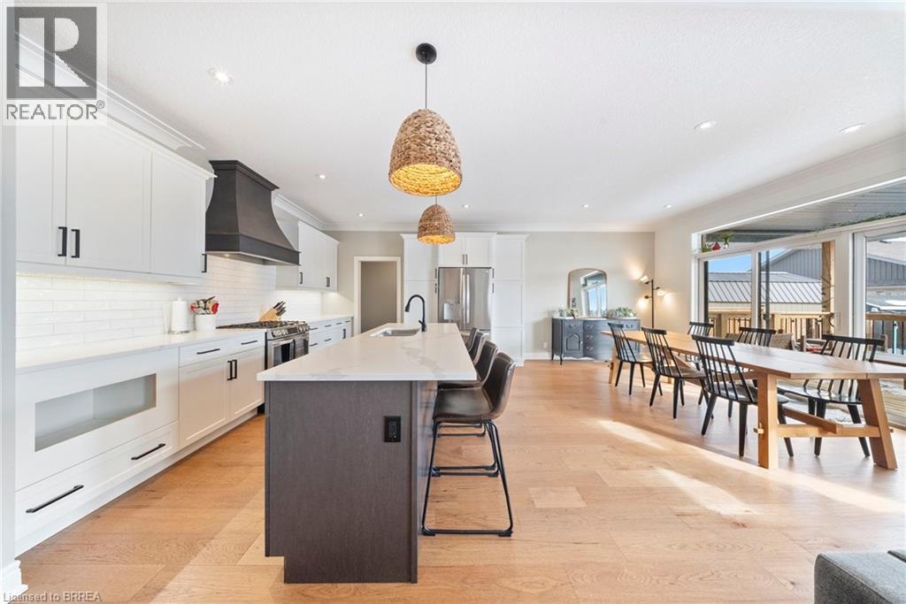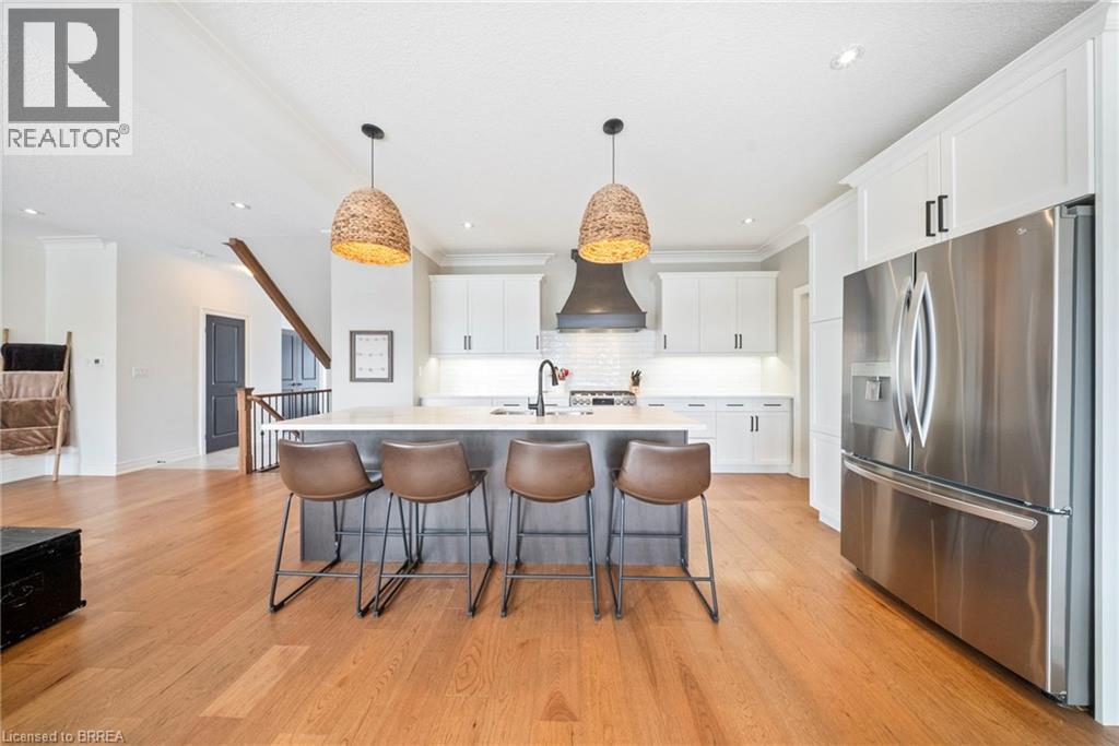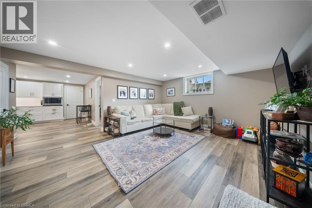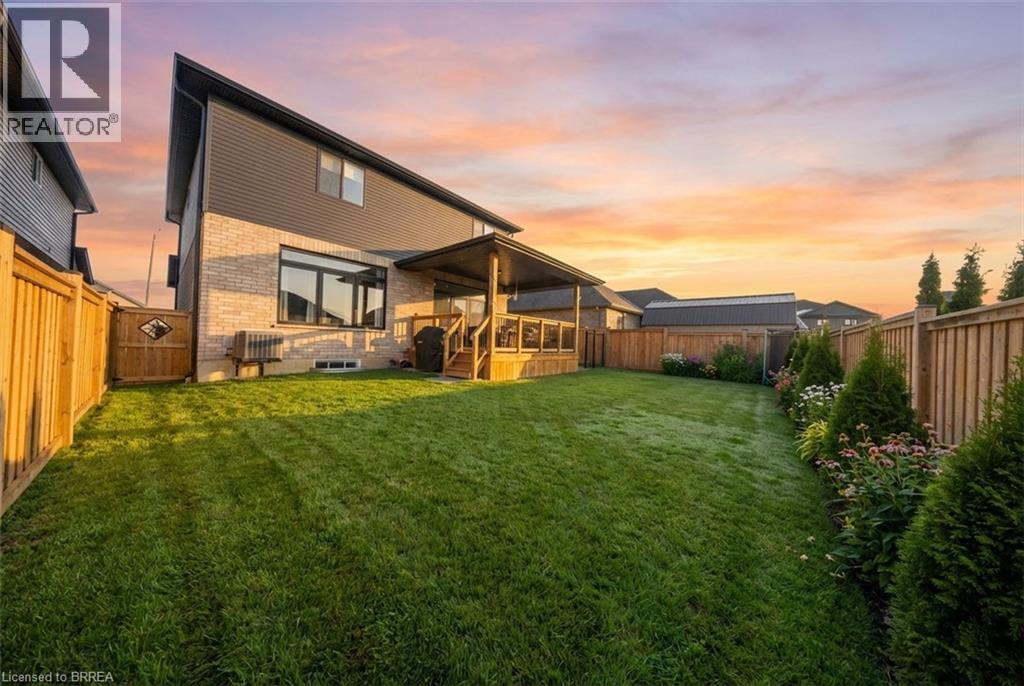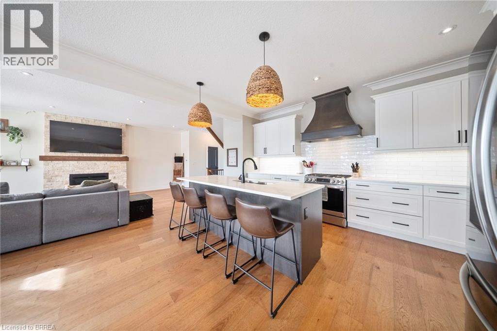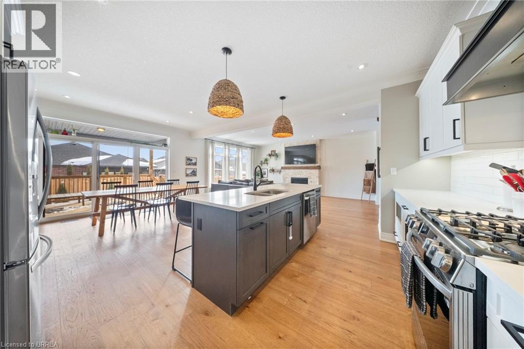 Welcome to this exquisite 2-storey home nestled in the charming town of Waterford—where timeless elegance meets modern luxury. Meticulously crafted and beautifully maintained, this stunning residence seamlessly blends contemporary design with refined comfort. The thoughtfully designed open-concept main floor provides effortless flow between the kitchen, dining area, and living room—an ideal layout for both everyday living and unforgettable entertaining. At the heart of the home is the chef-inspired kitchen, a true showstopper designed to impress. Featuring a spacious centre island with seating, sleek quartz countertops, a classic subway tile backsplash, premium stainless steel appliances, under-mount lighting, and refined crown moldings, this kitchen combines beauty and functionality in every detail. Whether preparing family meals or hosting guests, this space is sure to inspire. The living room exudes warmth and style with its striking stone-surround gas fireplace—perfect for cozy evenings—while the dining area offers sliding glass doors that lead to a covered deck, extending your living space outdoors for effortless indoor-outdoor entertaining. The fully finished lower level adds exceptional versatility, offering a spacious recreation room, convenient kitchenette, additional bedroom, and 2-peice bathroom—making it perfectly suited for an in-law suite or multi-generational living arrangement. Step outside to a fully fenced backyard designed for both relaxation and recreation. With ample space for entertaining, gardening, or letting children and pets play freely, this private outdoor retreat truly enhances the home’s appeal. The property also features an updated aggregate driveway, eye-catching glow-in-the-dark safety stones on the steps for added nighttime visibility, and a concrete and turf enclosed dog run—thoughtfully designed with both style and practicality in mind. Luxury living in a welcoming community—don’t miss this rare opportunity! (id:64974)