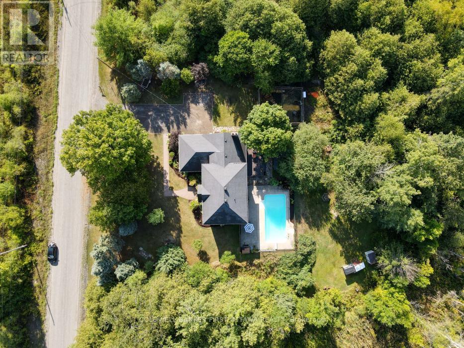 Nestled on a picturesque 26.517-acre natural oasis, this stunning all-brick family home blends timeless elegance with modern efficiency. Boasting geothermal heating and cooling, it offers both environmental sustainability and year-round comfort. Step into the bright, welcoming foyer and discover generous living spaces filled with natural light. A professional main-floor office with calming views easily doubles as a bedroom. The living and dining rooms sparkle with sunshine, while the open-concept kitchen-with abundant cabinetry, new quartz countertops and flooring-flows seamlessly into the inviting family room, creating a warm space for connection and comfort. Patio doors lead to a spacious deck, perfect for BBQs and outdoor gatherings. The landscaped yard includes a fully fenced in-ground swimming pool, perfect for summer enjoyment. A fenced vegetable garden invites homegrown harvests. A convenient main-floor powder and laundry room completes the main level. Upstairs, the luxurious primary retreat features hardwood floors, a walk-in closet, and a 5-piece ensuite. Three additional generously sized bedrooms share a stylish 4-piece bathroom. Take a look at the second staircase, which also leads up to the second floor. The finished lower level offers an expansive recreation area, ideal for family fun or entertaining, a kitchenette in the making (electrical and plumbing have been completed, should buyers want to use it for an in-law suite). Direct access from the attached double garage connects to both the lower level and main floor, ensuring ease of entry. This remarkable property offers the best of country living with elegant indoor comfort and thoughtful outdoor features, truly a serene and sustainable family haven. (id:64974)