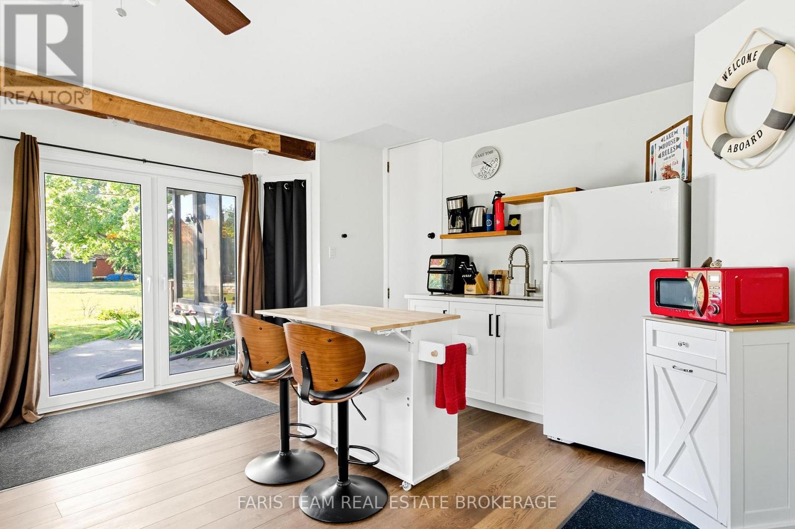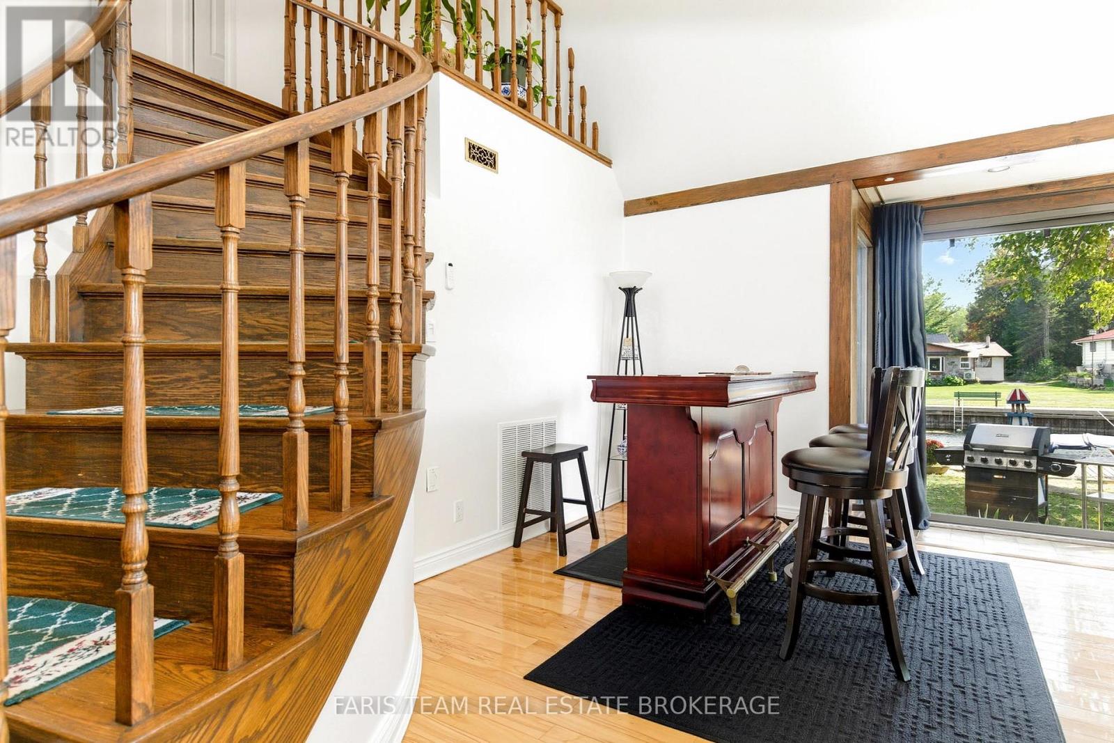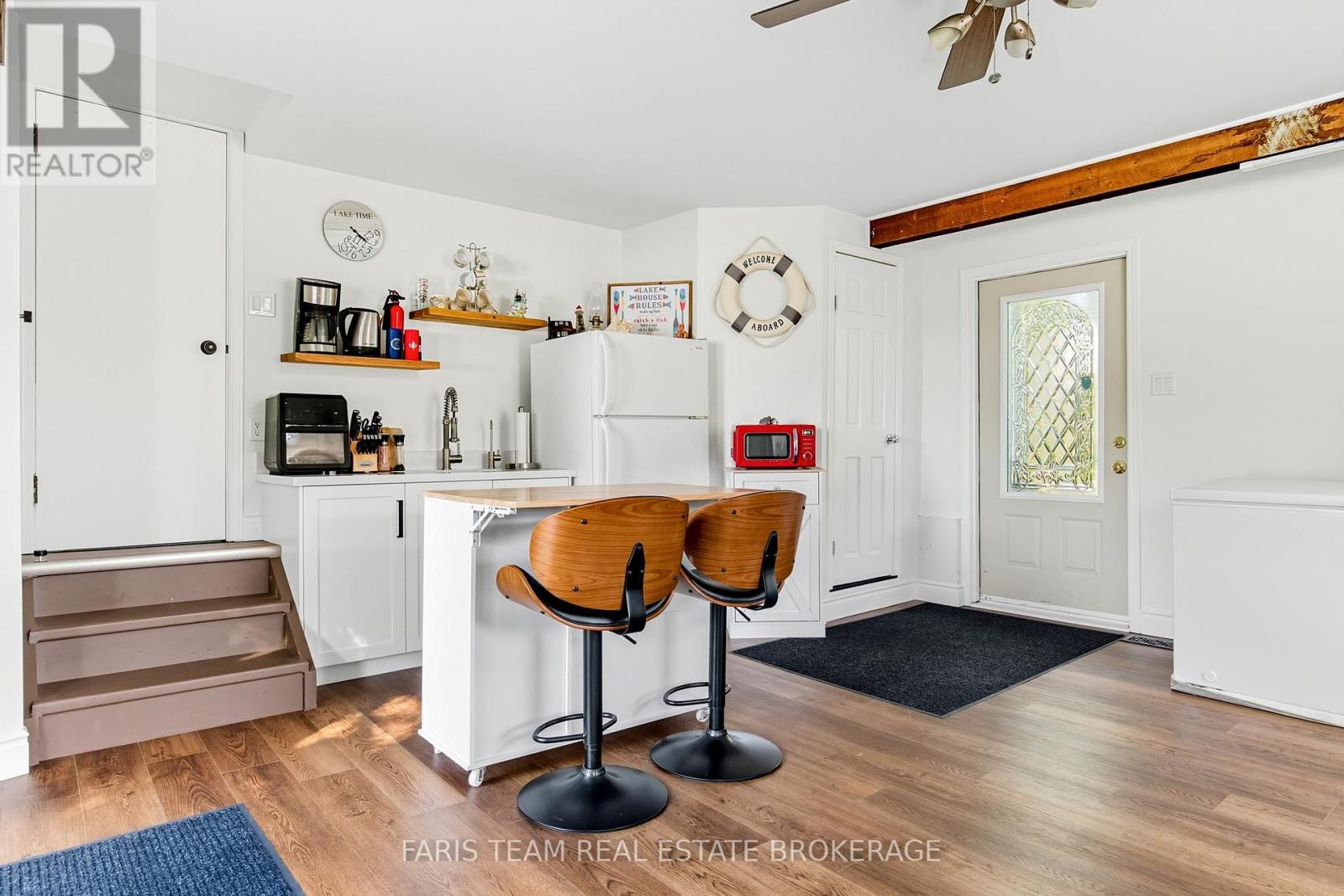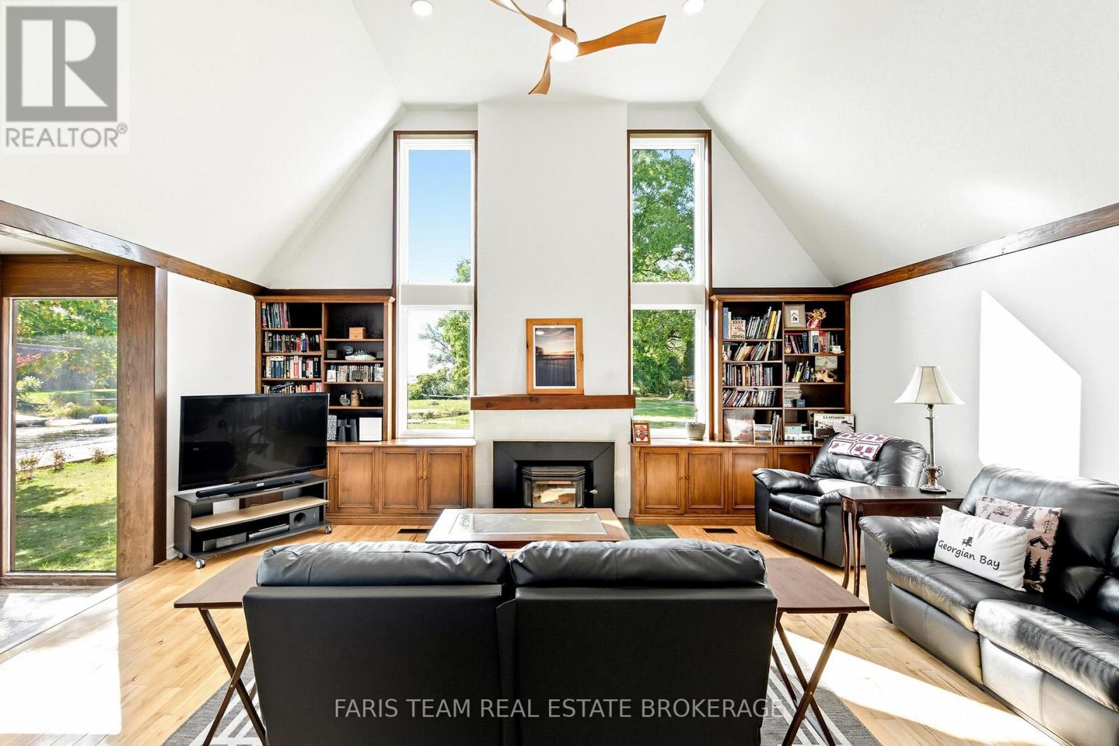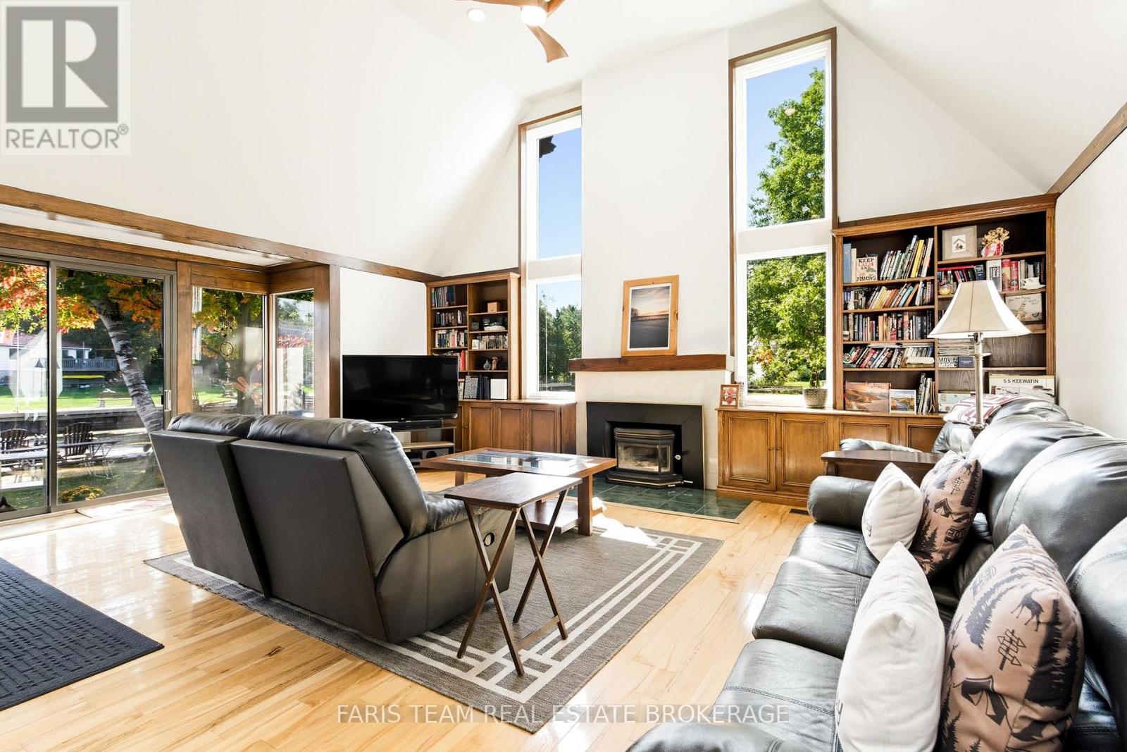 Top 5 Reasons You Will Love This Home: 1) With 75' of waterfront and direct access to Georgian Bay, this is true shoreline living, set along a protected channel, your boat stays sheltered from prevailing winds while still enjoying quick access to open water and the kind of sunsets people travel hours to experience, to top it all off, you also have access to two sandy beaches within walking distance 2) Almost half an acre in a rural setting gives you breathing room and long-term value, with no direct neighbours across the street, adding a level of privacy that new subdivisions simply cannot offer, yet you are still within close proximity to Highway 400 for an easy commute 3) The expansive great room serves as the heart of the home, highlighted by oversized windows, a vaulted ceiling, built-in bookshelves, and a fireplace that beautifully anchors the space as natural light pours in, while the primary bedroom offers serene water views so you can wake up to Georgian Bay every day 4) Fully renovated main level bedroom complete with a wet bar and centre island creates the perfect in-law setup or separate overflow living space when guests arrive, along with a main level laundry room for easy convenience 5) Peace of mind comes with the roof, furnace, and air conditioner already replaced, complemented by efficient European windows throughout the main level bedroom addition, as well as four updated windows flanking the fireplace in the great room, while a detached garage and powered auxiliary storage and workshop building provide plenty of space for tools, toys, and projects. 2,602 fin.sq.ft. (id:64974)