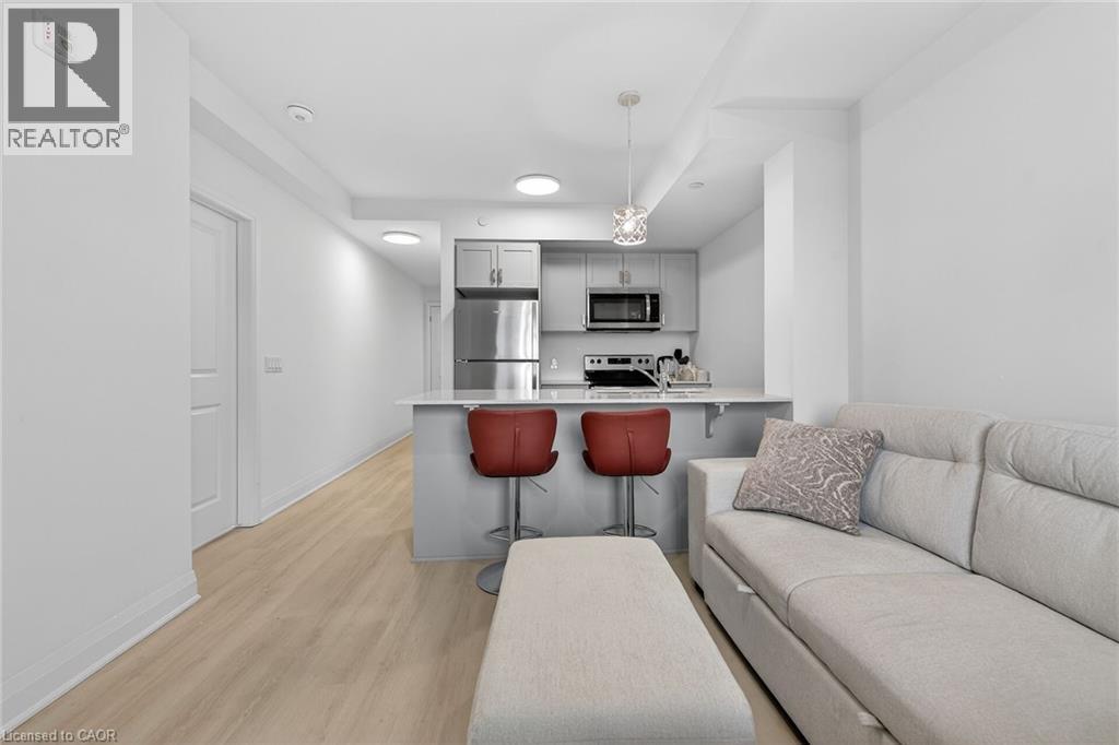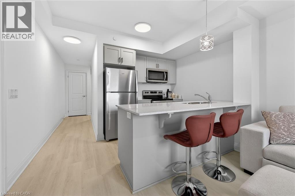 PRIME LOCATION! Welcome to PEAK CONDOS within the upper Stoney Creek across from Eramosa Karst Conservation Area, a stunning 5 Storey building that has an attractive exterior which combines stone with timeless glass & wood. Bright, sun-filled, thoughtfully designed 1 Bedroom features 9-foot ceilings and stylish upgrades throughout. Enjoy quartz countertops, an undermount sink, sleek vinyl plank flooring, pot lights with upgraded all light fixtures, and the convenience of in-suite laundry. All S.S appliances included. Comes with 1 parking spot and locker! Tasteful landscaping surrounds the development adding the appeal of greenery on multiple sides. Ample onsite vehicle parking, bicycle storage, fitness center, lockers, party room (birthdays, showers, and graduations can be celebrated in style), rooftop amenities with group seating & dining areas, modern lobby greets visitors, presenting a welcome entranceway. With easy access to shopping, parks, schools, restaurants, transit, and major highways, this move-in-ready condo is an excellent opportunity for first-time buyers, professionals, or downsizers seeking stylish, low-maintenance living. (id:64974)