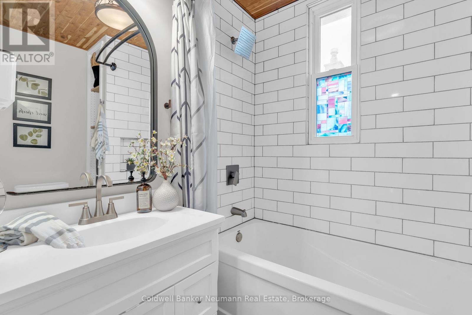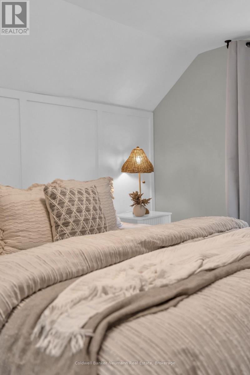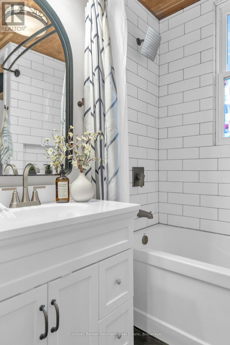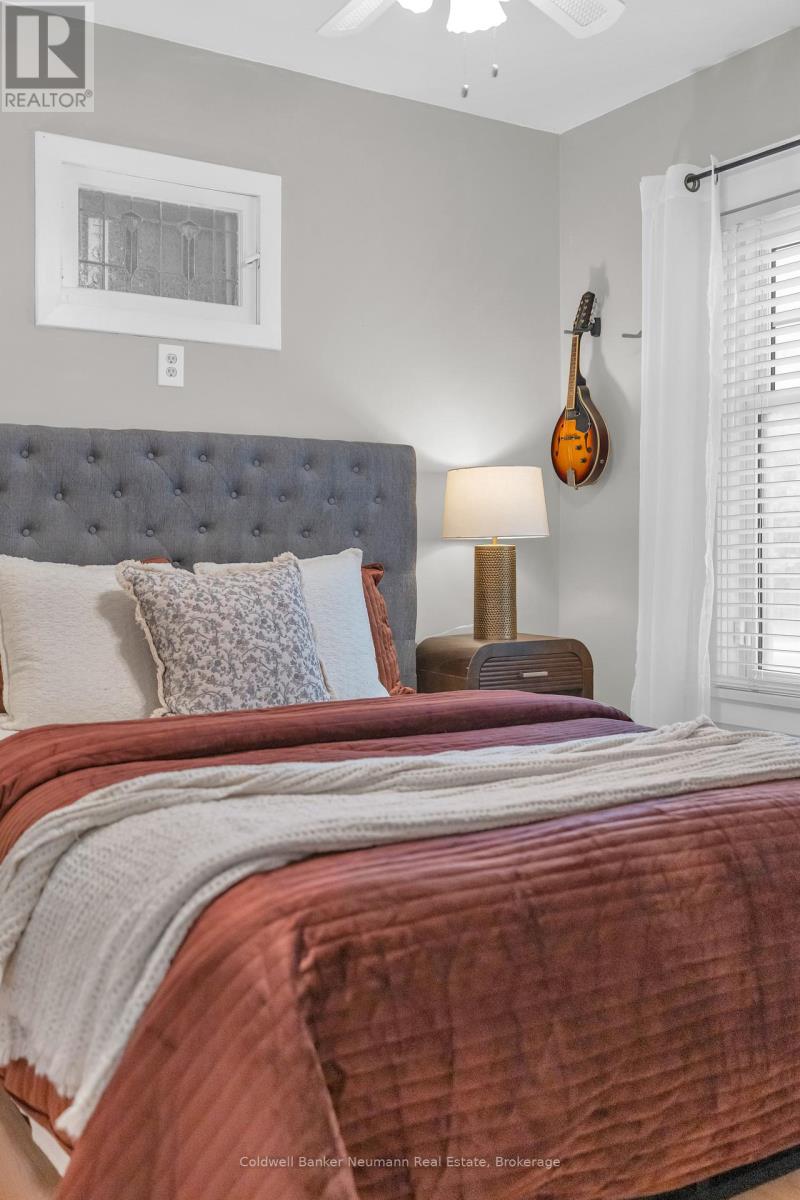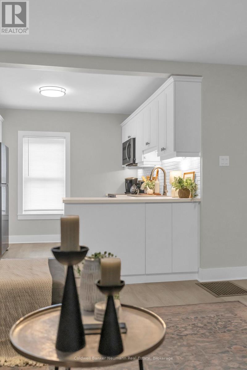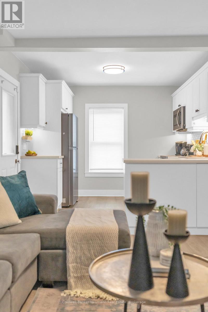 This beautifully updated cottage-style home in desirable East Galt seamlessly blends timeless character with contemporary finishes. The inviting exterior showcases modern stucco paired with expertly crafted stonework, setting the tone for what awaits inside. Step onto the spacious covered front porch and enter a home where every detail has been thoughtfully updated. The stunning fireplace in the front room echoes the homes exterior, featuring a unique stucco and stone façade with a vintage electric log insertadding both warmth and charm. This versatile space can serve as a formal dining area or a cozy sitting room. Elegant arched doorways and new laminate flooring lead to an open-concept living room and an updated kitchen complete with white cabinetry, stainless appliances, ample storage, under-cabinet lighting, a built-in fridge, beveled subway tile backsplash, and a Silgranit sink. Just off the kitchen, a new rear deck provides ideal space for outdoor dining and entertaining. The main floor also includes a spacious bedroom with a large window and a stunning modern farmhouse bathroom featuring a wood-accented ceiling, subway tile tub surround with dark grout, and a sleek vanity with an integrated sink. Upstairs, you'll find two additional well-appointed bedrooms with stylish accent walls and ample storage. The basementwith a separate entranceoffers potential for an in-law suite, income property, or extended living space. Situated on a generous 132-foot deep lot, the property offers parking for 8+ vehicles, plus an oversized two-car garage/workshop with electricalperfect for hobbyists or trades. The new fully fenced backyard includes a custom rolling gate, a new deck with privacy screens, and plenty of room for entertaining or play. Additional upgrades include newer windows, furnace, electrical, and plumbing making this home truly move-in ready. Ideally located near parks, trails, schools, and major amenities, this is East Galt living at its finest (id:64974)