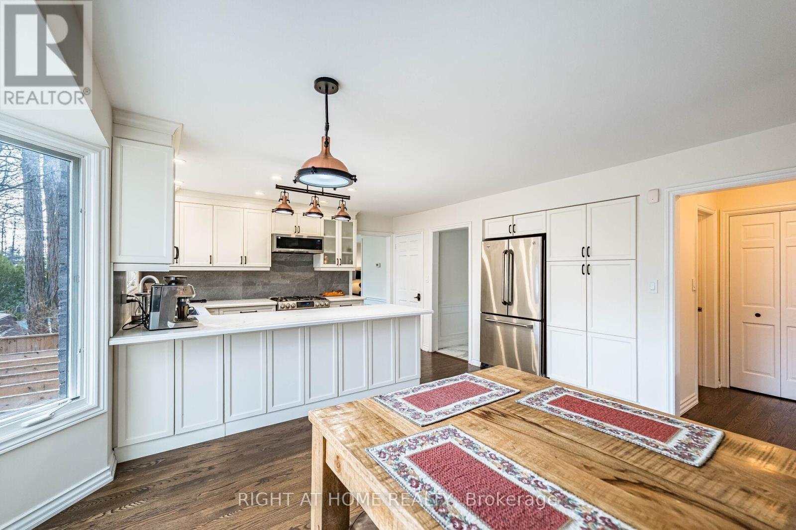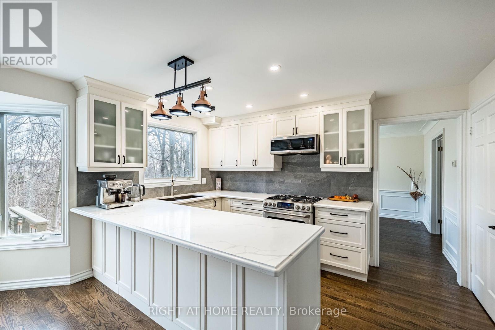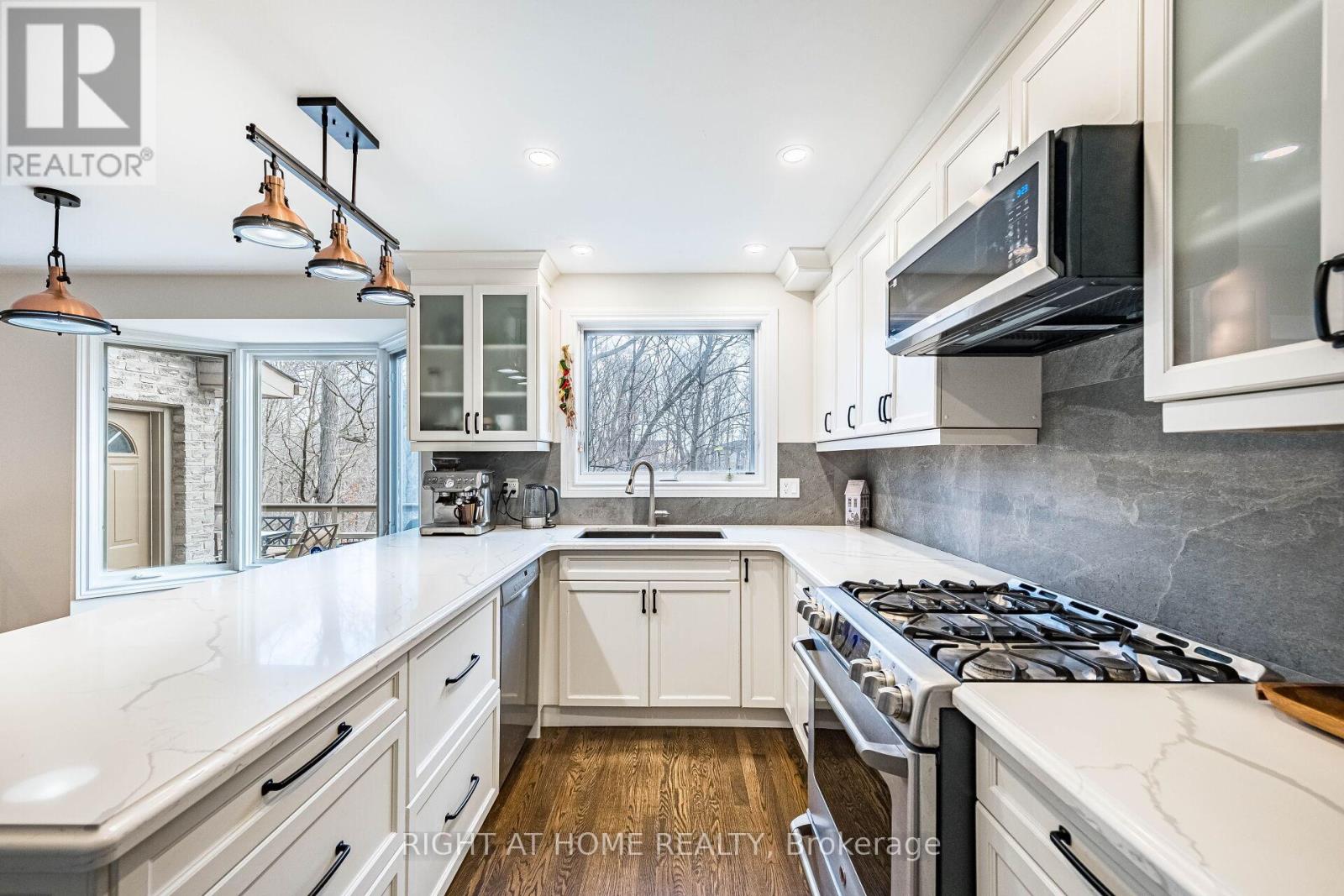 Experience this exquisite home on a mature, tree-lined lot on a prestigious Tyandaga's street. Backing onto a breathtaking ravine, this private retreat offers the perfect blend of nature and convenience, just minutes to all amenities.The main level is ideal for entertaining, featuring a den, formal living and dining rooms with wainscoting, and hardwood flooring throughout. The upgraded kitchen offers stainless steel appliances, new countertops and backsplash, a gas range, and a bright breakfast area with a bay window, plus a walkout to a private, tree-lined backyard.The sunken family room boasts a wall of windows, gas fireplace, pegged oak flooring, and beautiful wood accents with serene ravine views.Upstairs features three spacious bedrooms, all with hardwood floors, including a primary suite with ravine views, walk-in closet, and a 3-piece ensuite with heated floors.The finished lower level includes a recreation room with a wet bar and walkout to a stunning backyard oasis with a multi-level deck, patio, professional landscaping, and a hot tub with privacy wall. A truly exceptional ravine property! (id:64974)