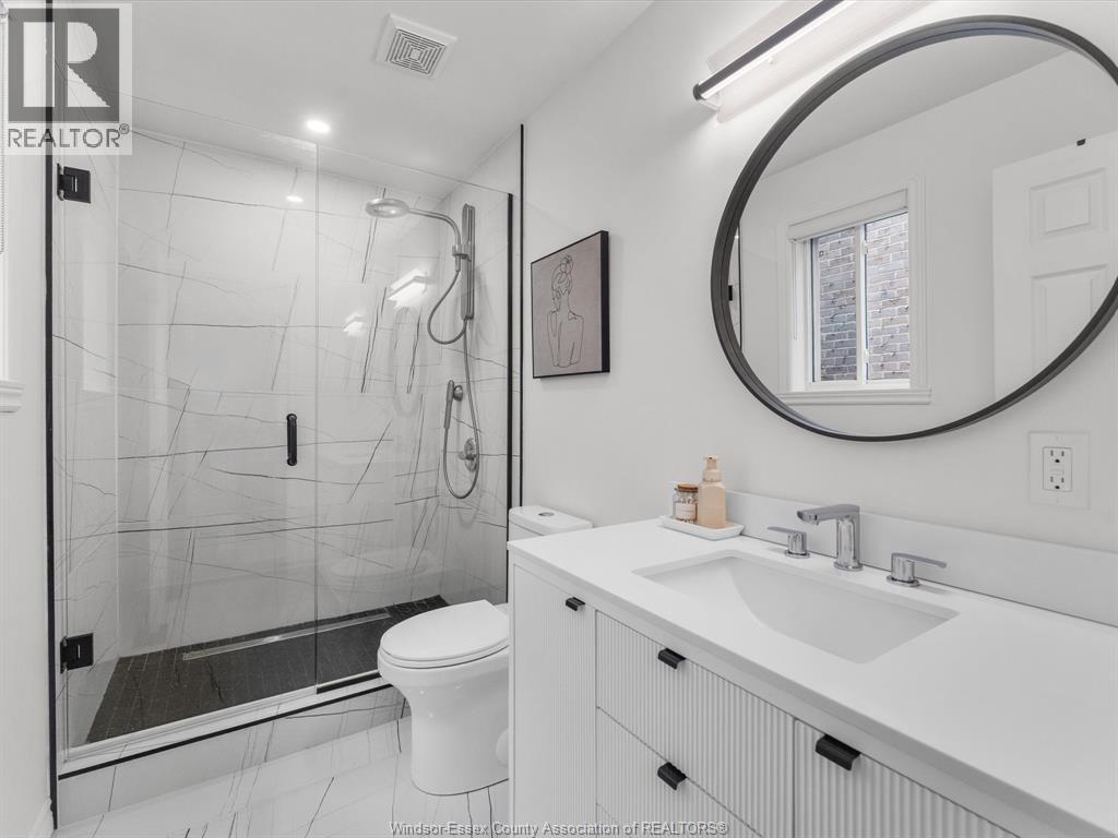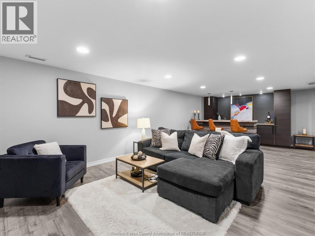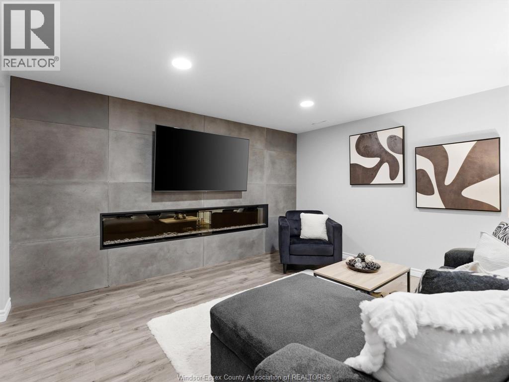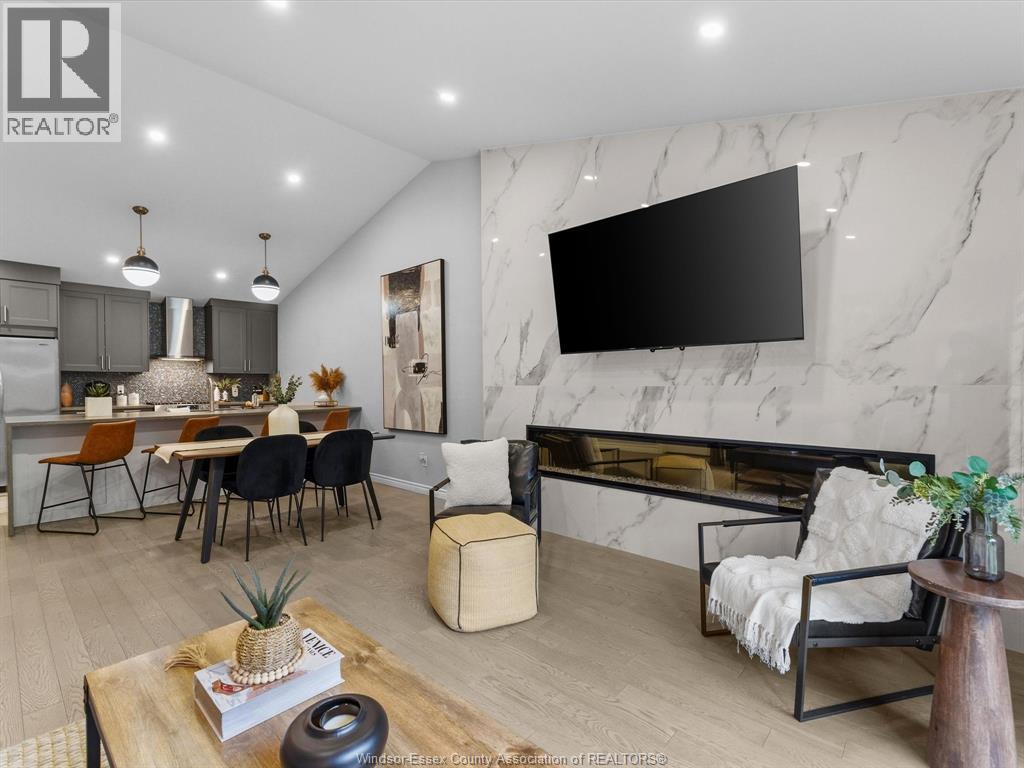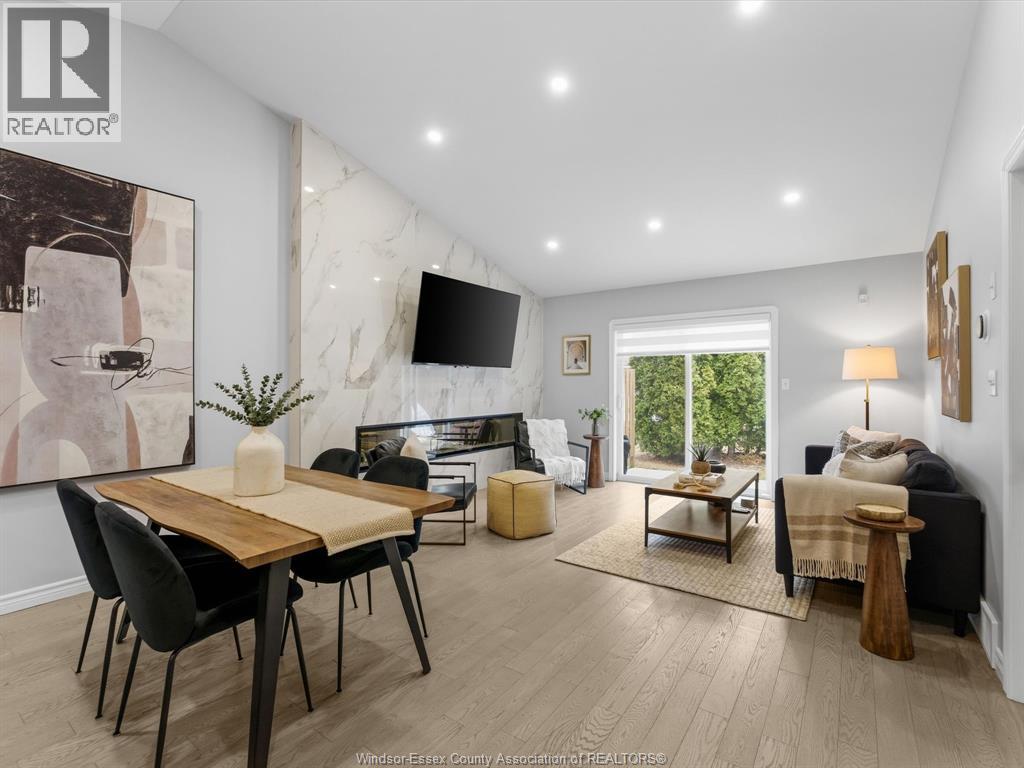 Completely renovated top to bottom in 2022, this beautifully updated 2+1 bedroom, 3 full bathroom townhome is located in a highly desirable East Windsor neighbourhood. Every detail was redone, including the bathrooms, kitchen, flooring, tile, paint, light fixtures, and pot lights throughout — truly move-in ready with modern finishes from top to bottom.The main floor features two spacious bedrooms, a convenient laundry area, and engineered hardwood flooring. The custom open-concept kitchen is the heart of the home, showcasing a stunning waterfall island, quartz countertops, and 2x2 tile in the kitchen area. The space flows seamlessly into the dining and living area, highlighted by a large feature wall with a high-efficiency electric fireplace and vaulted ceilings that create a bright, airy feel. The primary bedroom offers a walk-in closet and a beautifully updated ensuite bathroom. Step outside to your private cement patio — the perfect place to enjoy your morning coffee or relax in the evening. The fully finished basement is a gorgeous entertainer’s dream, complete with a second large fireplace, a custom bar with granite counters, a third bedroom, and its own three-piece bathroom — ideal for guests or extended family. Additional updates include a newer AC unit, new washer and dryer, and a new stove. The $115/month HOA fee covers snow removal, grass cutting, aerating, fertilizer and weed control, fall clean-up, and roof maintenance, making for easy, low-maintenance living. Close to all amenities and just steps from Blue Heron Pond and scenic walking trails, this home truly has it all. Viewing offers as they come! (id:64974)