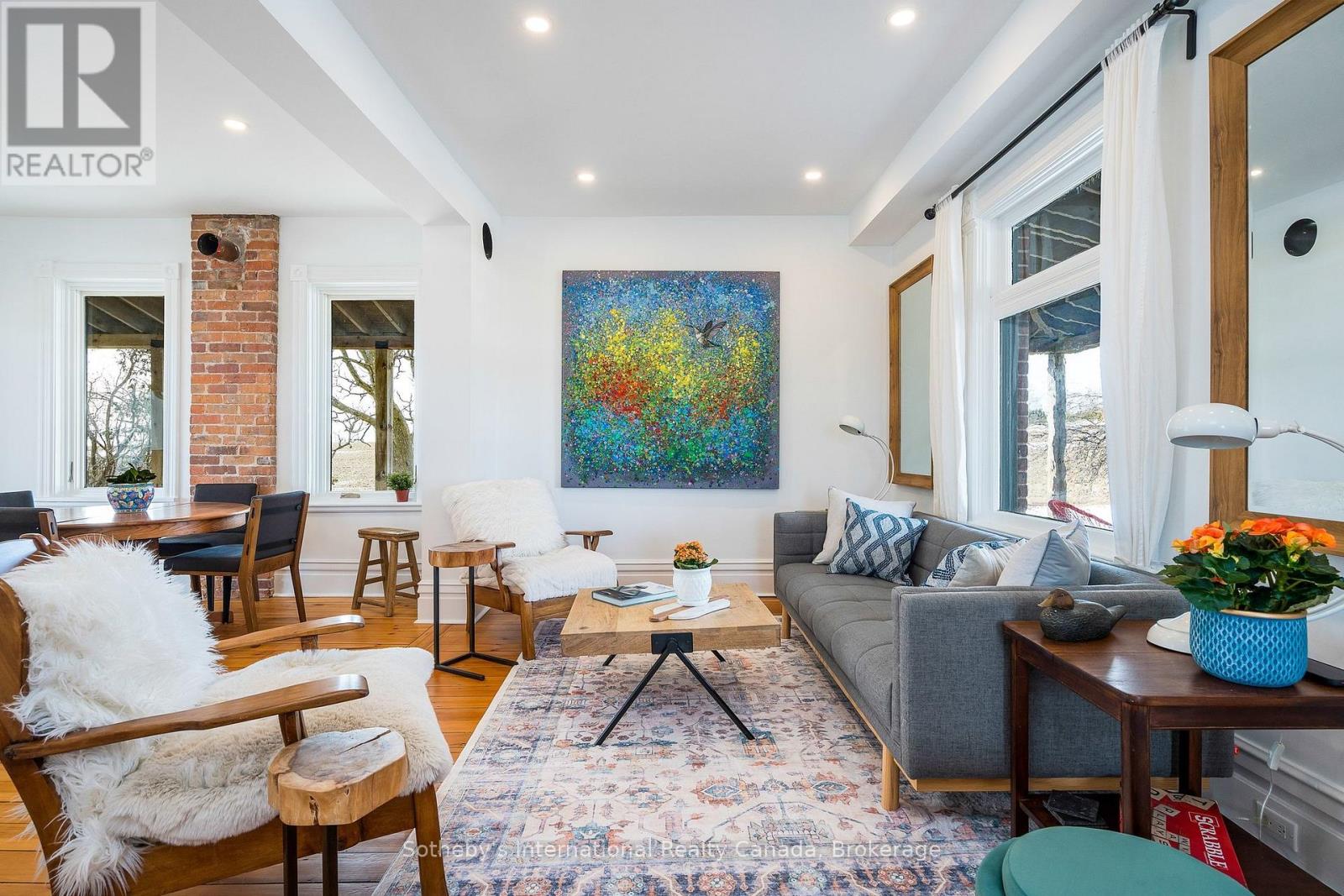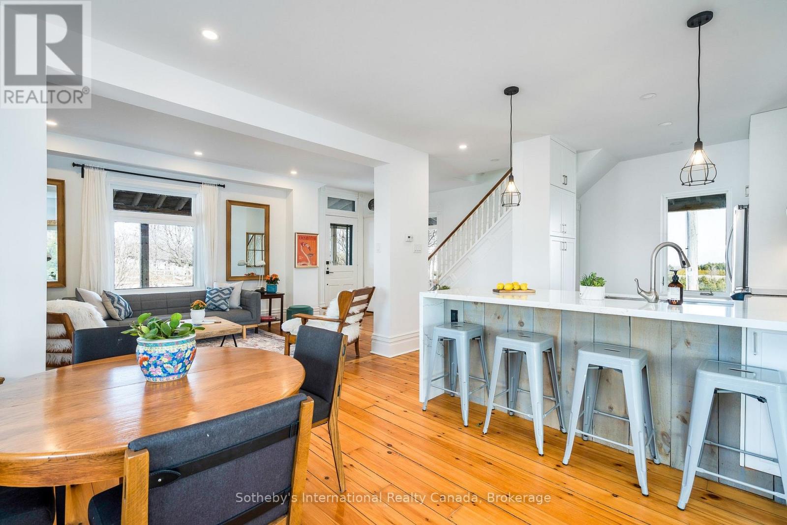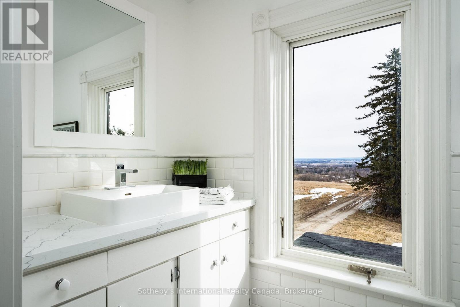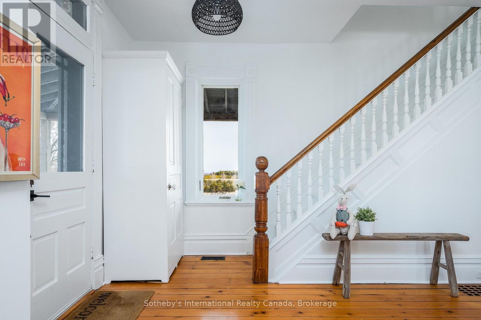 Perched on an elevated area along the scenic Fairgrounds Road this charming 130+ year-old country home sits on approximately 2.5 acres with remarkable views across the countryside and direct to the bay. Enjoy stunning sunrise and sunset vistas from the property's open setting. Set well back from the road and surrounded by beautiful farms, farmland and estate homes, the location is peaceful and private. The red brick farm home features an open concept layout on the ground floor with lovely pine floors, exposed brick accents, a bright, renovated kitchen with walkout to a wrap around verandah. The home has three bedrooms, and one modern bathroom. The property has a small apple orchard and fenced vegetable garden. The home is only a short drive away from Creemore and Collingwood, ski hills (Blue Mountain and Devil's Glen), golf (Mad River) and Wasaga/Georgian Bay beaches. A rare opportunity to own a manageable country acreage in one of Clearview's most desirable rural locations. (id:64974)