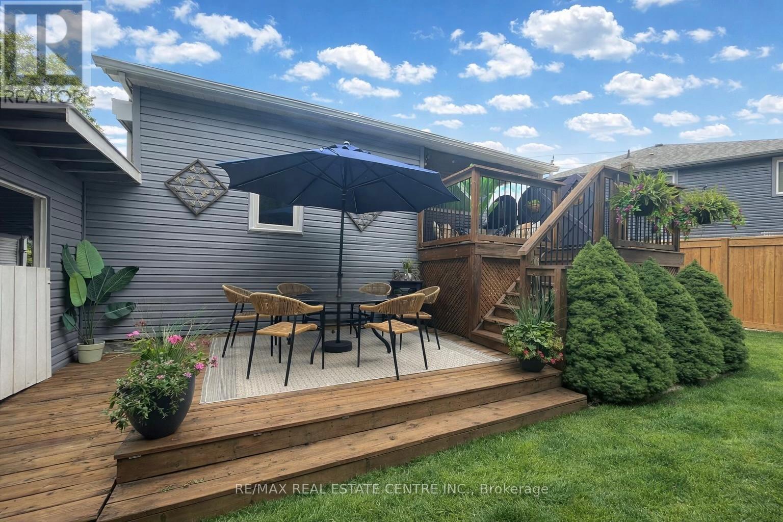 Discover refined comfort in this beautifully maintained, cute as a button, 2 + 1 bedroom, 2 bathroom residence offering over 1,500 square feet of total and thoughtfully finished living space. Set within a mature, tree-lined neighbourhood known for its welcoming community and exceptional convenience to schools, Highway 401 and premier amenities, this home is waiting to welcome a new family. A private side entrance leads to the fully finished lower level, presenting outstanding in-law or multi-generational living potential. Outdoors the deep, fully fenced backyard creates a serene retreat for elegant entertaining, complete with an expansive deck and two storage buildings - one powered and perfectly suited for a workshop or creative studio. Inside, natural light fills the inviting main living area, complemented by two well-appointed bedrooms and a stylishly updated bathroom. The eat-in kitchen blends function and charm with generous storage and seamless access to the rear entry and lower level. The finished basement features a sophisticated third bedroom, a second full bathroom, an upgraded laundry space with folding counter and extensive shelving and a spacious recreation room. A substantial utility and cold room further enhance the home's impressive storage capacity. Don't miss this exceptional opportunity to enjoy comfort, privacy and versatility in a sought-after setting! (id:64974)