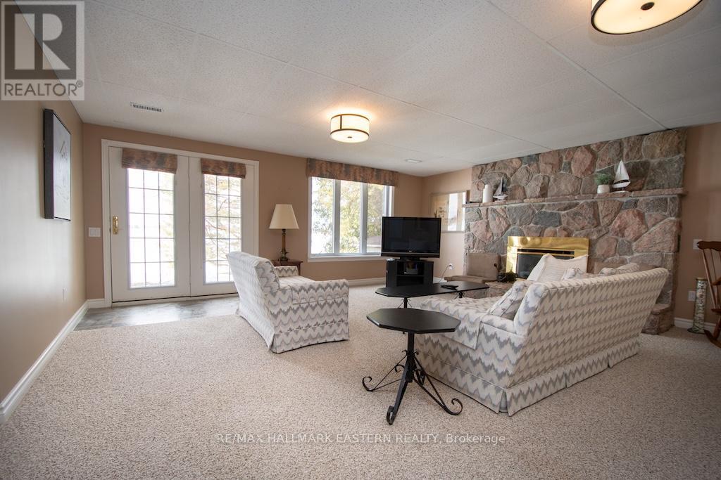 Beautiful all brick waterfront bungalow on Chemong Lake, featuring 3 bedrooms & 3 bathrooms. Lovely hardwood flooring through out offering 2,300 Sq Ft living space. The spacious kitchen features a large island with an eating bar & ample storage. The home has a large primary bedroom boasting a generous sized walk-in closet and an ensuite. It has a main floor laundry room with plenty of cupboards. The main floor features a walk-out to a newly built 351 sq ft deck overlooking the lake. The lower level is fully finished with a walk-out to a larger stone patio. This offers a welcoming wet bar giving the home in-law suite potential. It includes a floor to ceiling stone fireplace for a cozy feel. This also includes a paved circular driveway with 6 spaces and attached 1+1 car garage for additional storage, having the upper level with 1 parking space and lower level providing additional storage space for water toys. This property features a large level back lot with potential to build garage/workshop. The shoreline gives you an opportunity to walk into the water or the ability to dive off the dock into lake. The waterfront has an exquisite armour stone shoreline that pairs well with hard sand bottom. This charming home has western exposure allowing you to enjoy epic sunset views all year long. (id:64974)