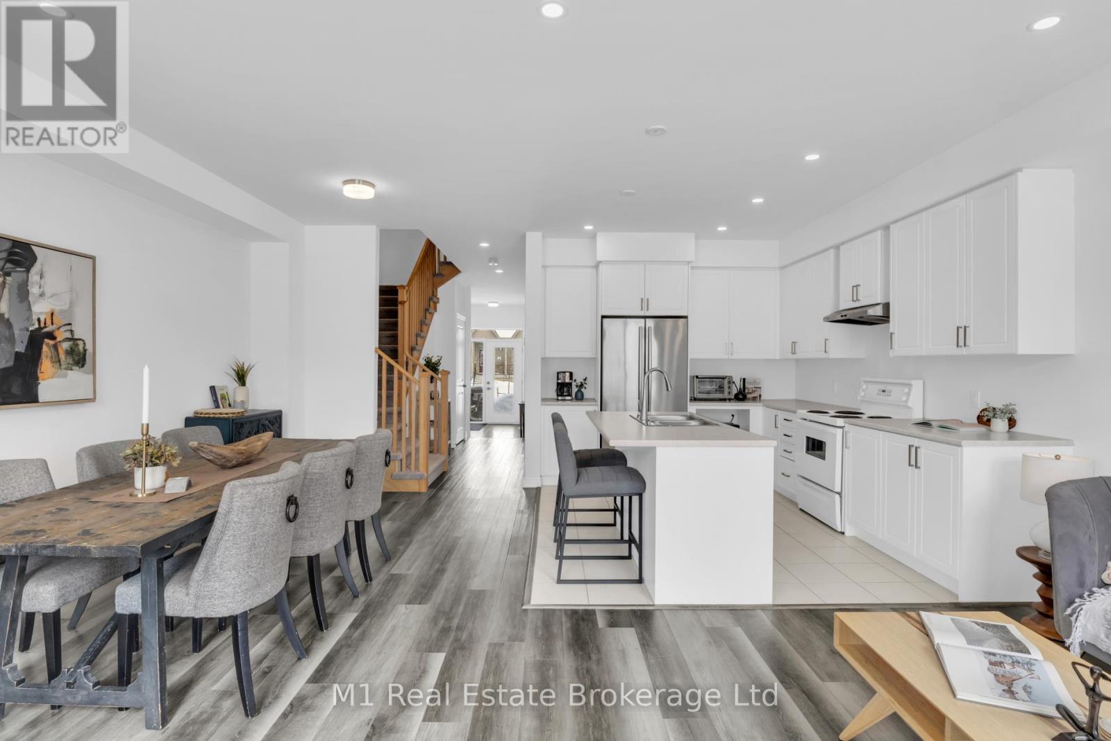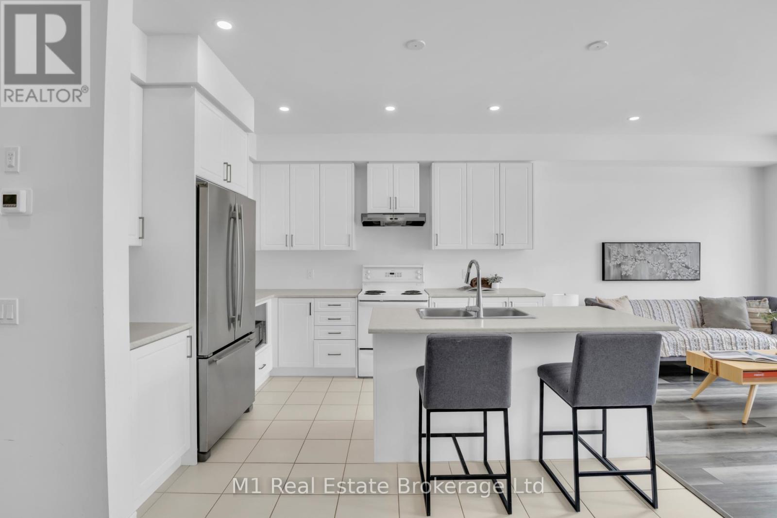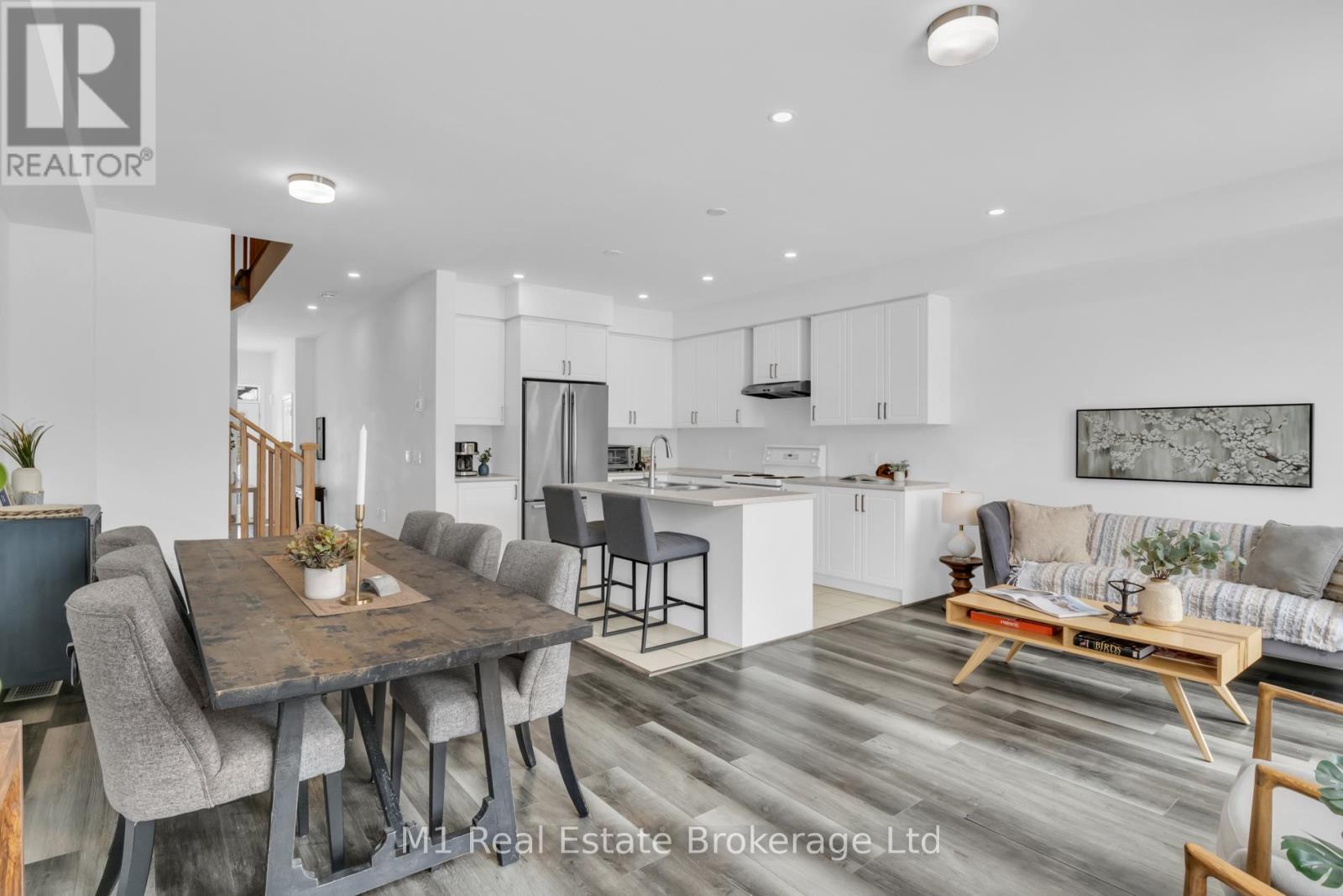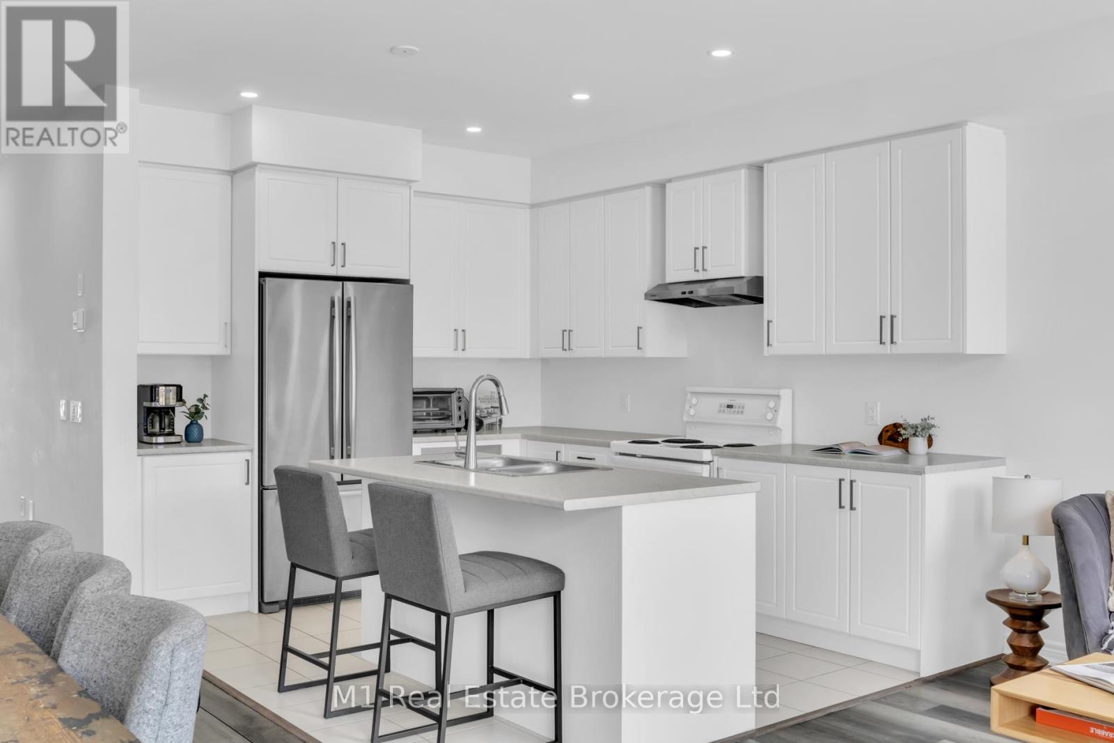 Welcome to 197 Farley Road, a well-designed freehold townhome located in the desirable Storybrook community of Fergus. This modern two-storey home offers approximately 1,742 sq. ft. of finished living space with three bedrooms and three bathrooms, providing a practical layout suited to everyday living. The main floor features a bright, open-concept design anchored by a contemporary kitchen with ample cabinetry, a large centre island, and quality finishes throughout, flowing seamlessly into the main living area. Upstairs, the primary bedroom includes a walk-in closet and a private four-piece ensuite, while two additional bedrooms share a full main bath. Upper-level laundry adds everyday convenience, and the unfinished basement offers excellent potential for future living space with existing rough-ins already in place. Exterior highlights include attractive brick and stone finishes, a covered front porch, and an attached garage with interior access. Ideally located close to schools, parks, trails, recreation facilities, and Groves Memorial Community Hospital, this home offers a low-maintenance lifestyle in one of Fergus's established newer neighbourhoods. (id:64974)