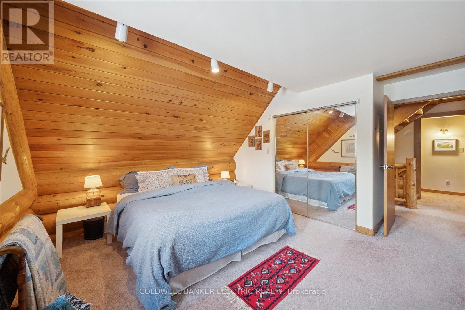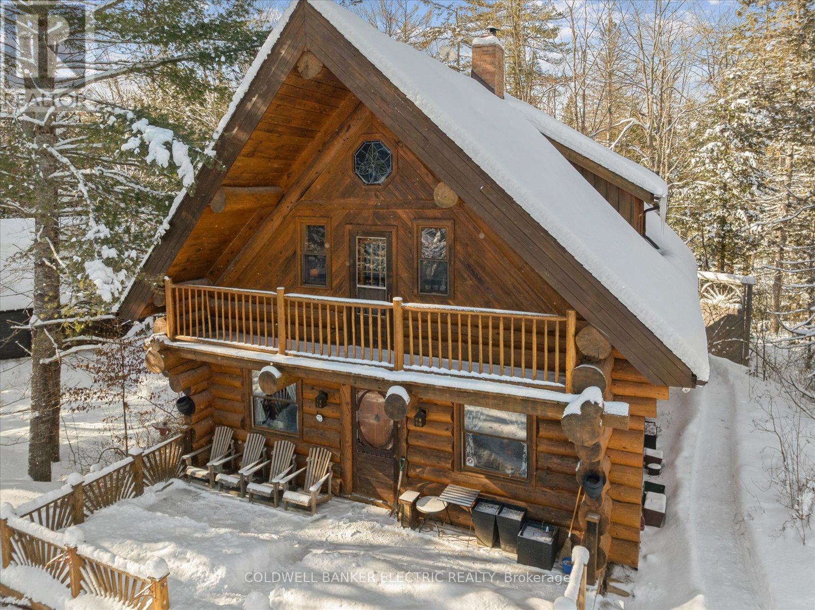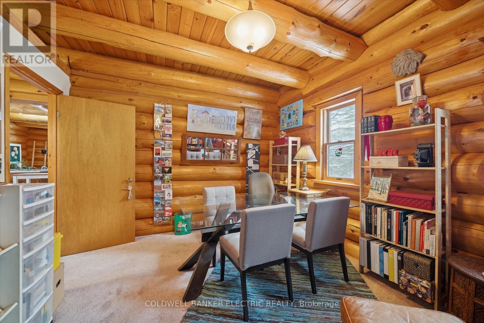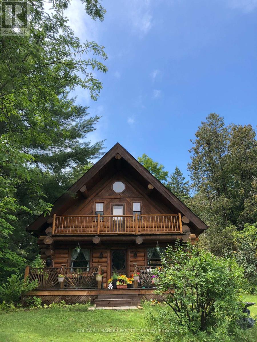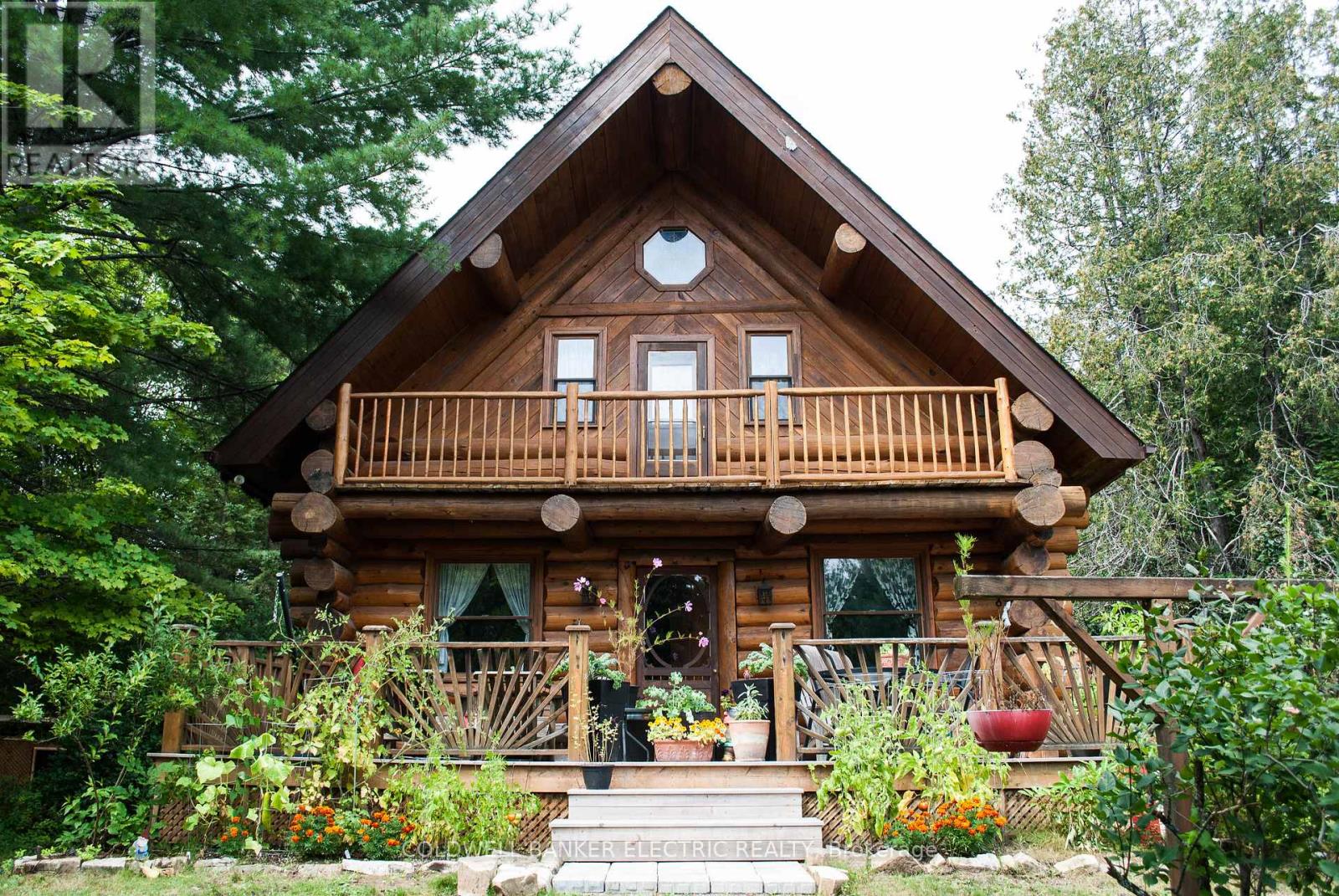 Situated in the village of Burnt River, while still being tucked away from the everyday, this 2.5-storey Scandinavian-style log home feels like stepping into your own private world - quiet, natural, and the perfect mix of manicured landscaping and untouched forest. With 1.5 acres of open yard space and the rest of your 27 acres being forested trails, it's a haven for nature lovers, gardeners, and anyone craving room to grow and explore, or just breathe. Inside, a floor-to-ceiling stone fireplace anchors the kitchen and living area with instant warmth and rustic charm.The main floor also includes a flexible bedroom/office, a 3-piece bath, and a bright 3-season sunroom that feels like a fairy tale whether it's raining or the sunniest day on earth! From here you can head outside and down enchanting stone steps into your own greenery sanctuary. Upstairs offers three bedrooms, including a spacious primary with a bonus room currently used as an incredible walk-in closet, easily repurposed as an office or private retreat. Another full bathroom completes this level. The third-floor loft adds a playful touch, ideal for reading, relaxing, or a kids' hideaway.The finished walkout basement expands your living space and features a wood stove, which is a pleasant touch on those colder days. Outside, you'll find a triple-car garage (with 100amp service) with 1,000 sq. ft. of finished loft space above for guests, work, or hobbies, plus an 8x2 garden shed and an 10x24 drive shed for your tractor and toys. This is more than a home, it's a lifestyle. Mornings with birdsong, afternoons on wooded trails, evenings by the fire. Rustic charm and modern comfort meet here. Conveniently located near small-town essentials: Kinmount (14 minutes), Fenelon Falls (15 minutes), Bobcaygeon and Minden (~30 minutes), and direct access to the Victoria Rail Trail (ATV/snowmobile trails) a boat launch at the end of Hillside drive, and close proximity to Four Mile Lake and Crystal Lake. (id:64974)