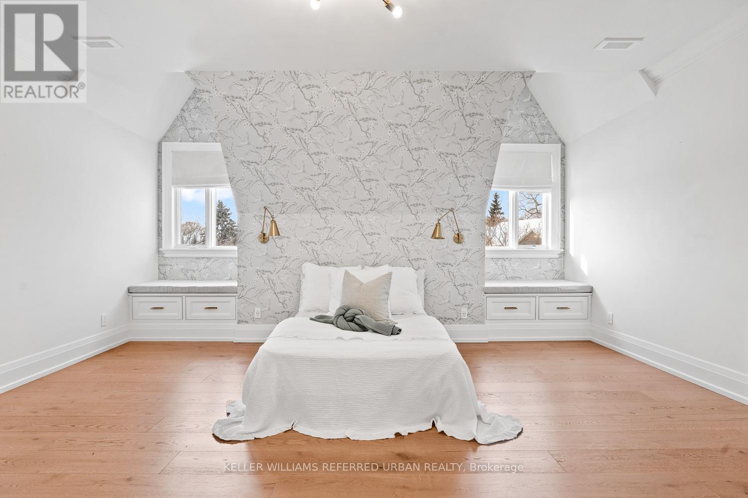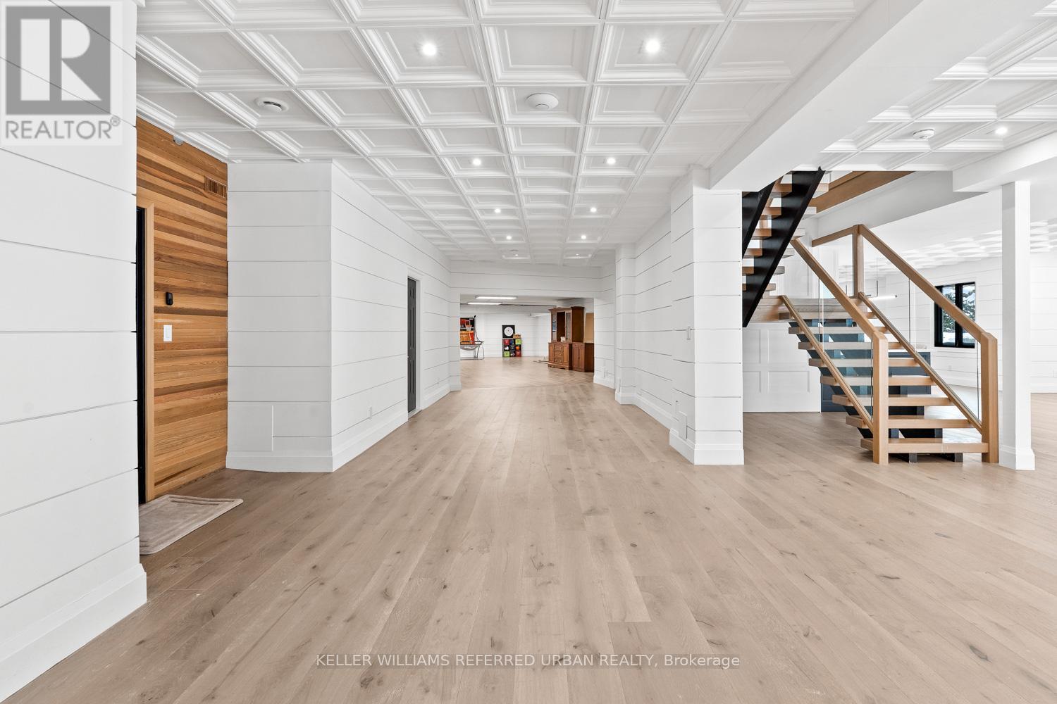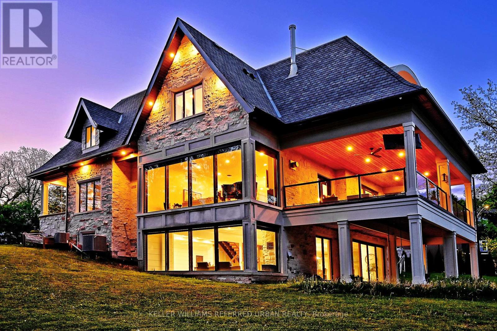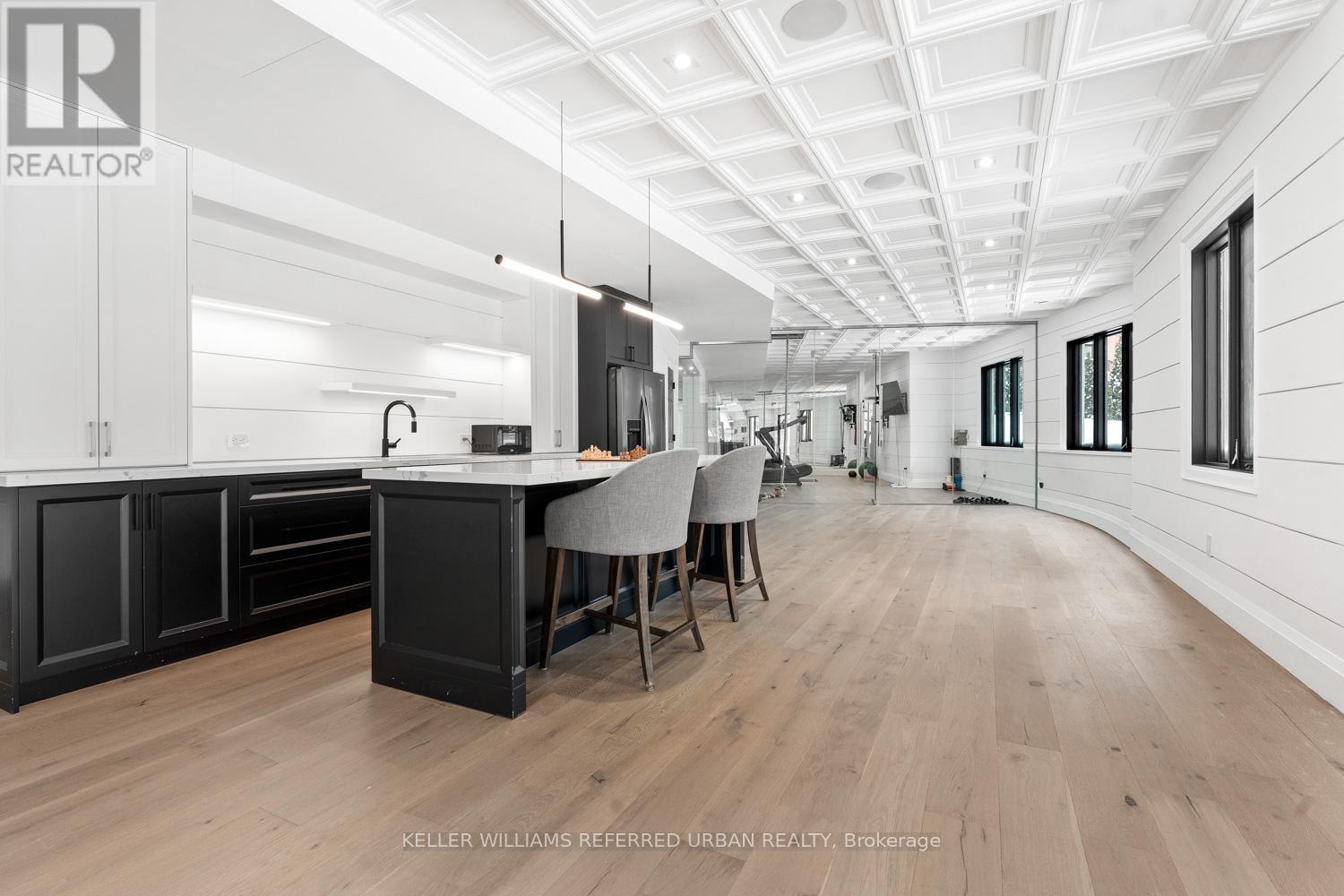 This exceptional custom-built luxury residence set on over an acre of private land is just minutes from downtown Newmarket.Finished in all-natural Quebec sandstone, this architectural home features a private triple driveway and rare four-car tandem garage with custom built-in storage. The grand foyer showcases marble and metal inlay flooring with soaring arched cathedral ceilings. Wide-plank white oak floors, bespoke millwork, and designer lighting flow throughout. The main level offers a heated mudroom with five custom coat closets and a private guest suite with walk-in closet and 4-piece ensuite. The chef's kitchen is designed for entertaining, featuring dual islands, quartz countertops, custom cabinetry with frosted glass accents, pantry and servery, and premium Thermador appliances including a six-burner range, dual wall ovens, and integrated fridge and freezer. Walk out to a covered loggia with ceiling fans and outdoor TV for year-round enjoyment. Upstairs includes a full laundry room and four spacious bedrooms, each with a walk-in closet and private ensuite. The primary retreat offers a private deck, custom walk-in closet, and spa-inspired ensuite with heated floors, steam dual rain shower, and soaker tub. The walk-out lower level features radiant heated floors, floor-to-ceiling windows, sauna, glass-enclosed gym, second kitchen and dining area, and access to a covered patio. Smart home features include Sonos speakers, motion lighting, central vacuum, dual-zone HVAC, hot water on demand, and steam humidifier. (id:64974)