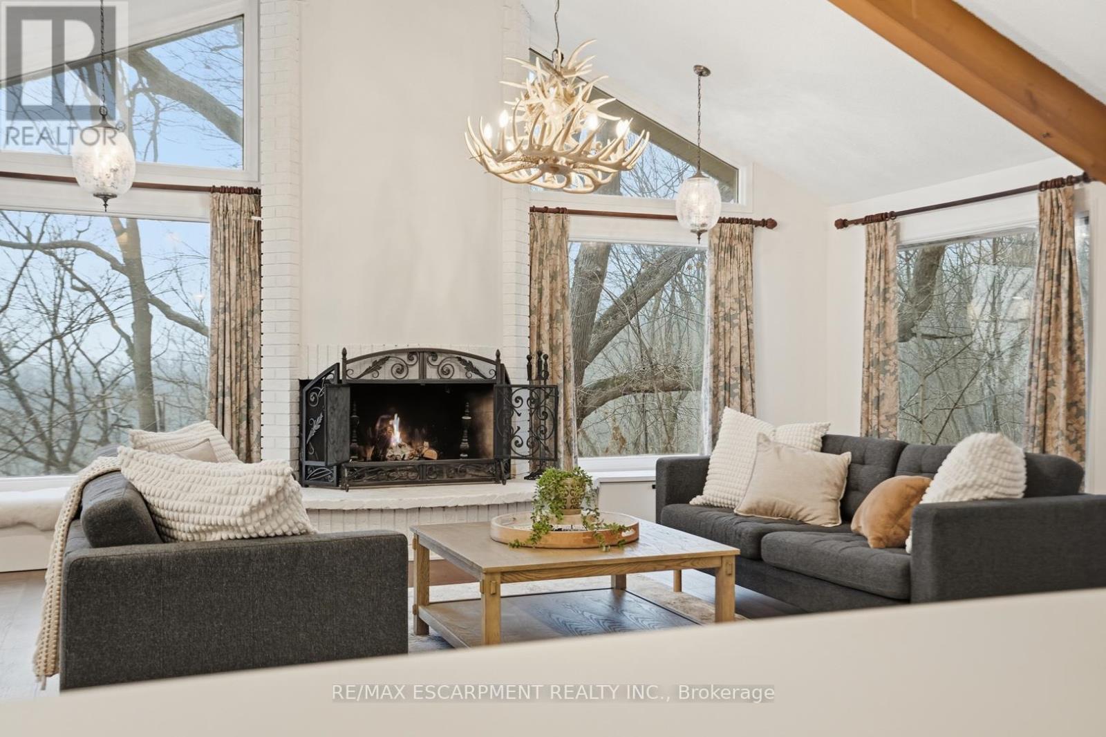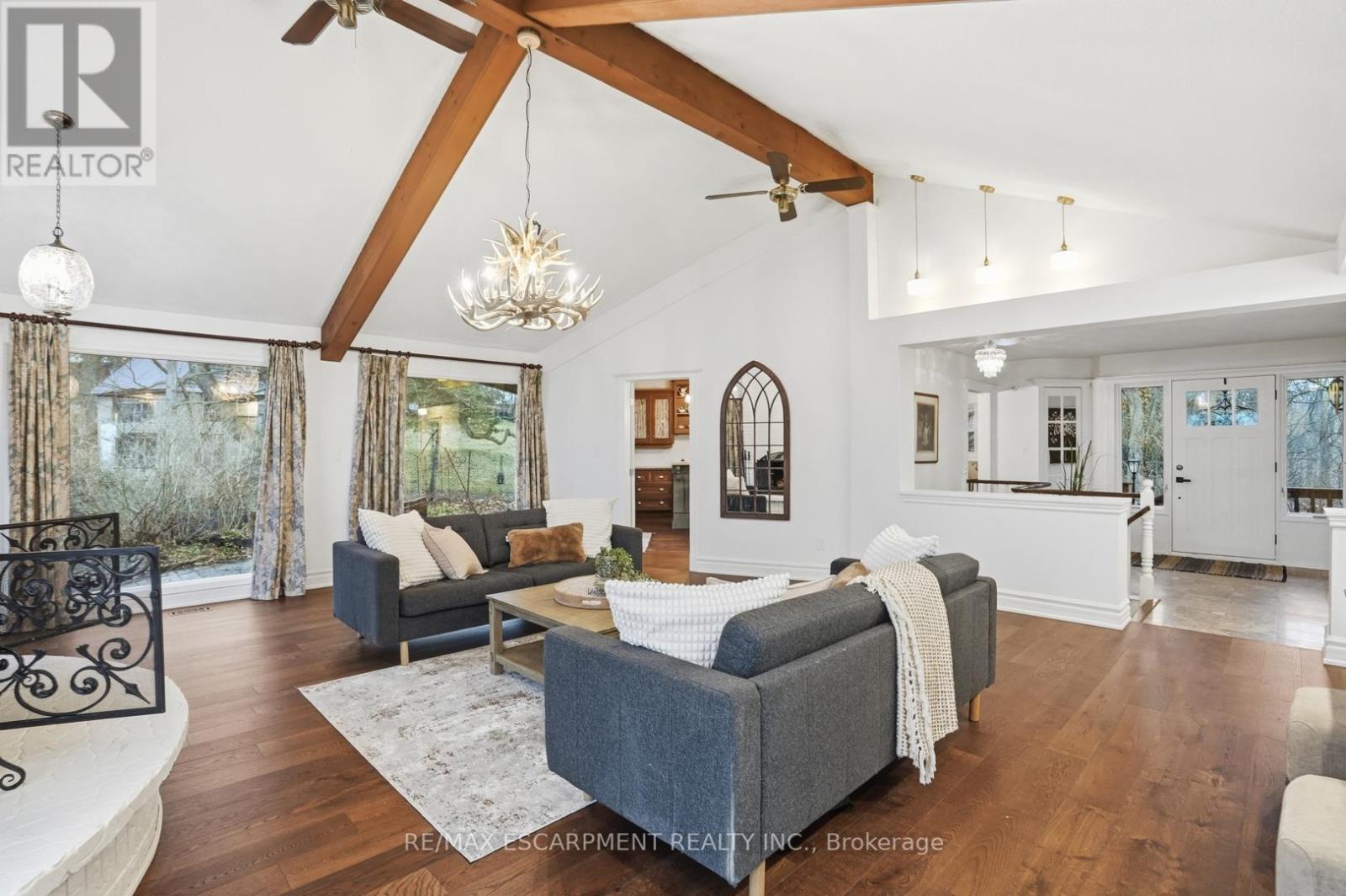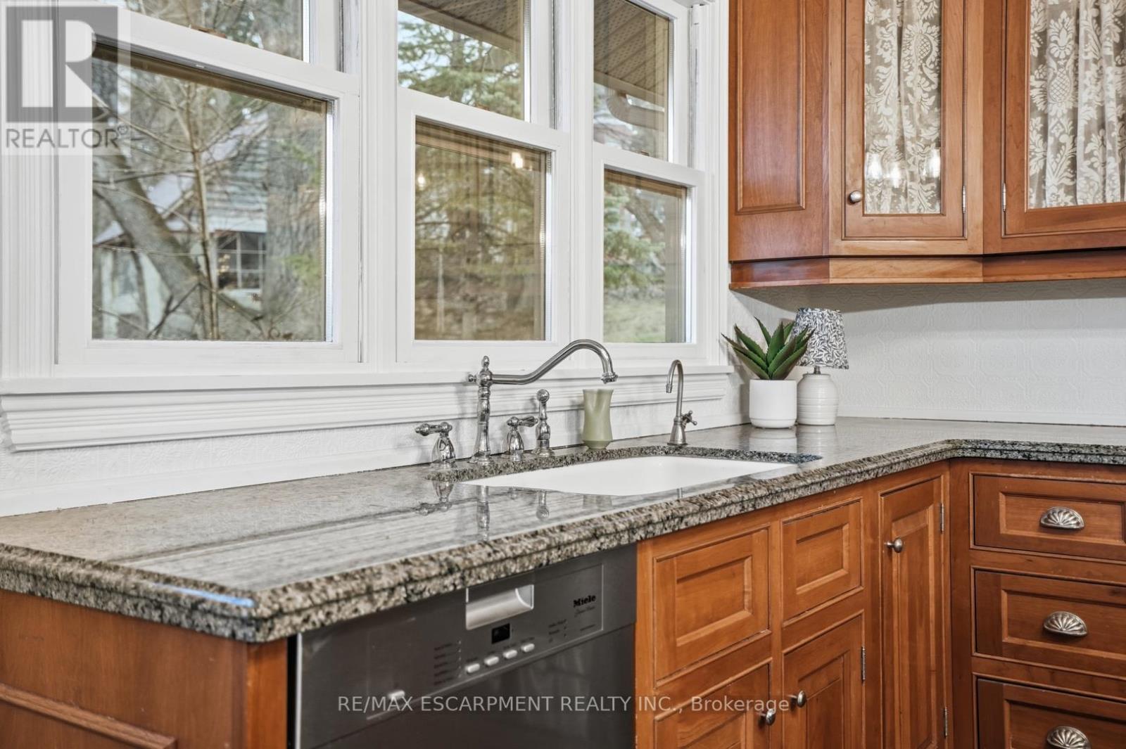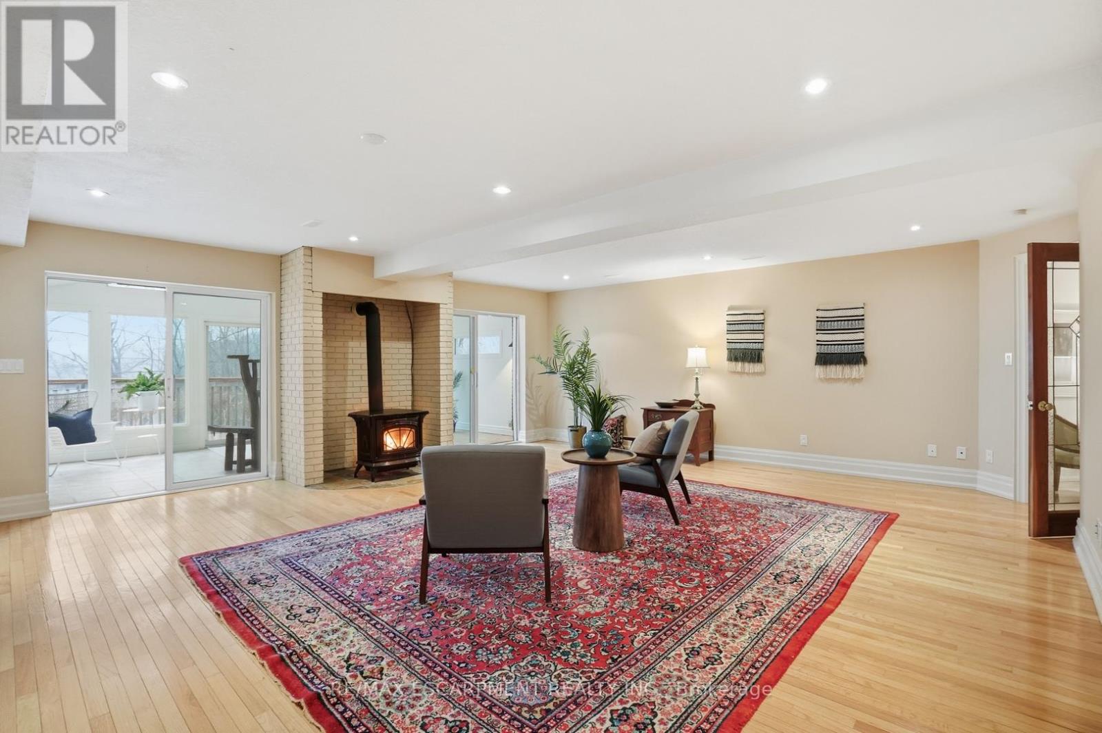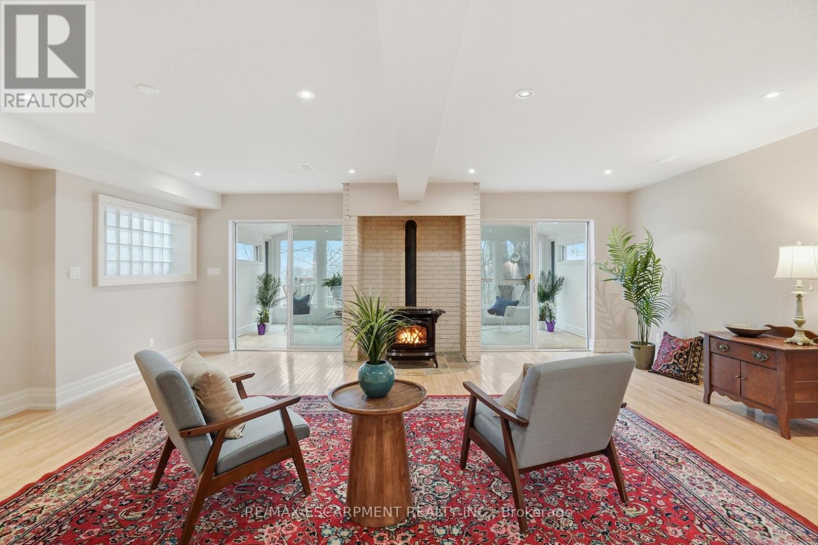 Tucked away on a picturesque 1-acre lot backing onto Grindstone Creek, this beautifully renovated raised bungalow offers the ultimate in privacy, tranquility, and multi-generational living. Surrounded by mature trees and natural beauty, this truly one of a kind offering delivers peaceful, country-style living just minutes from city amenities. The main level features three spacious bedrooms, including a serene primary retreat with a private ensuite and walk-out to the primary level deck. Set high in the Carolinian tree canopy, this large outdoor space is perfect for morning coffee, entertaining, or unwinding at sunset. The bright, airy living room is highlighted by vaulted ceilings, expansive windows that flood the space with natural light, and a cozy, raised hearth fireplace as its focal point. The custom made, cherry wood eat-in kitchen blends function and style, showcasing stainless steel appliances, granite countertops, and ample cabinetry-ideal for both everyday living and entertaining. The fully finished walkout basement offers excellent versatility with a self-contained in-law suite featuring a separate entrance, one bedroom, a full bathroom, dedicated laundry, a large great room with gas woodstove, and a bonus three season sunroom leading to a private outdoor deck-perfect for extended family, guests, or potential rental income. This exceptional property offers a unique lifestyle opportunity in one of Burlington's most desirable and undiscovered settings. RSA. (id:64974)