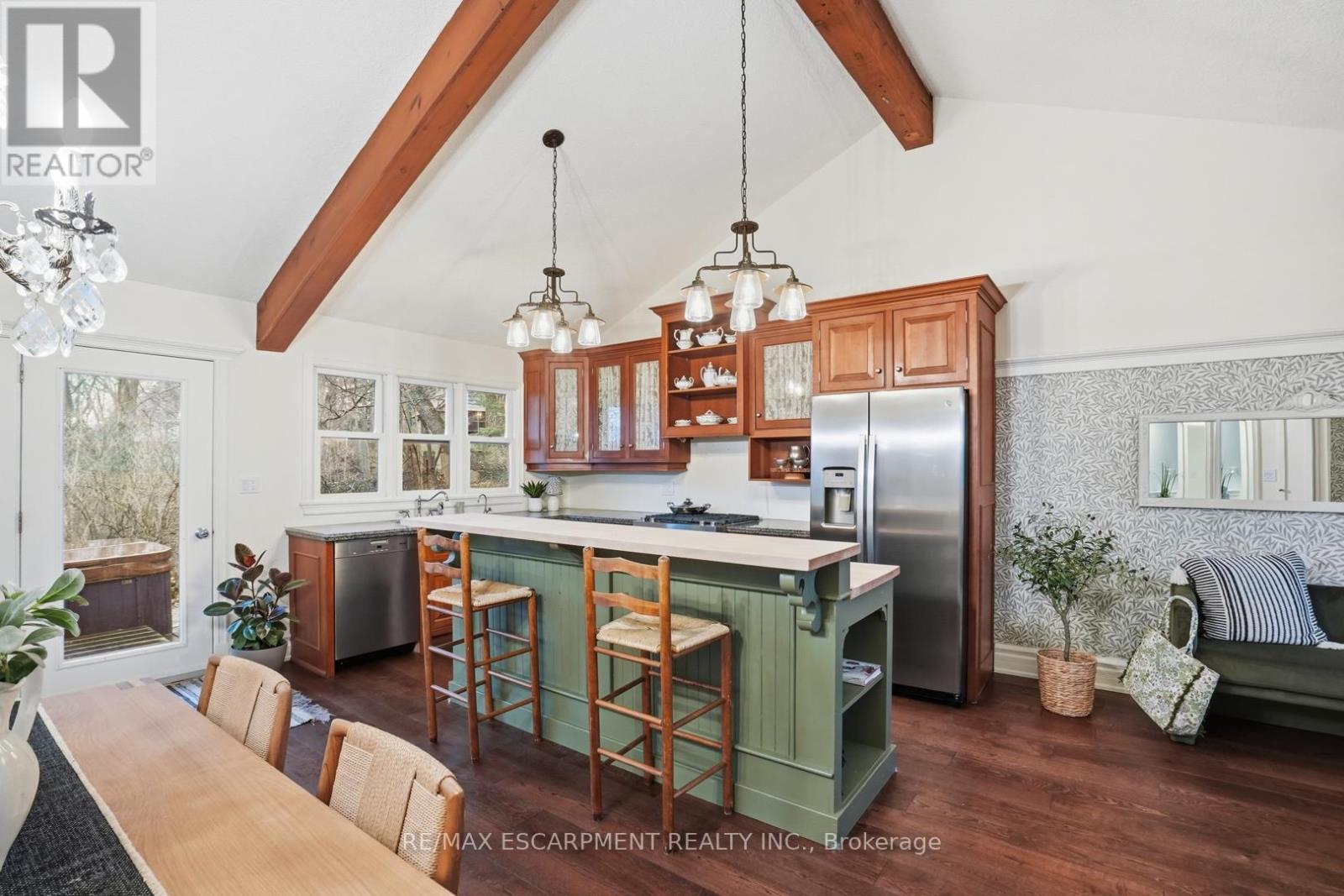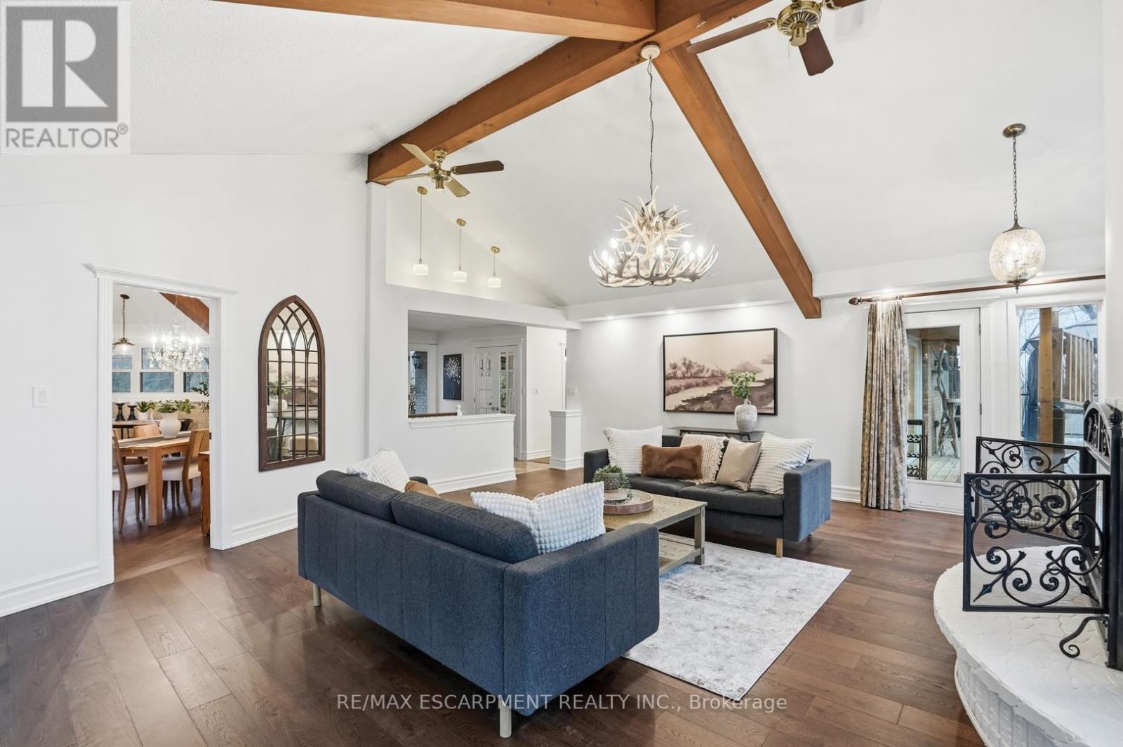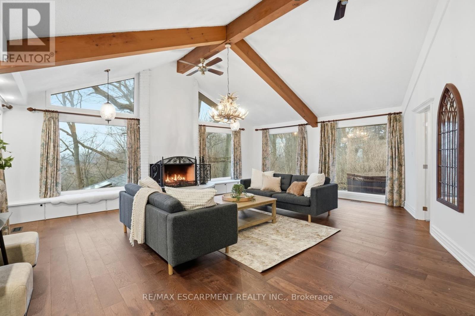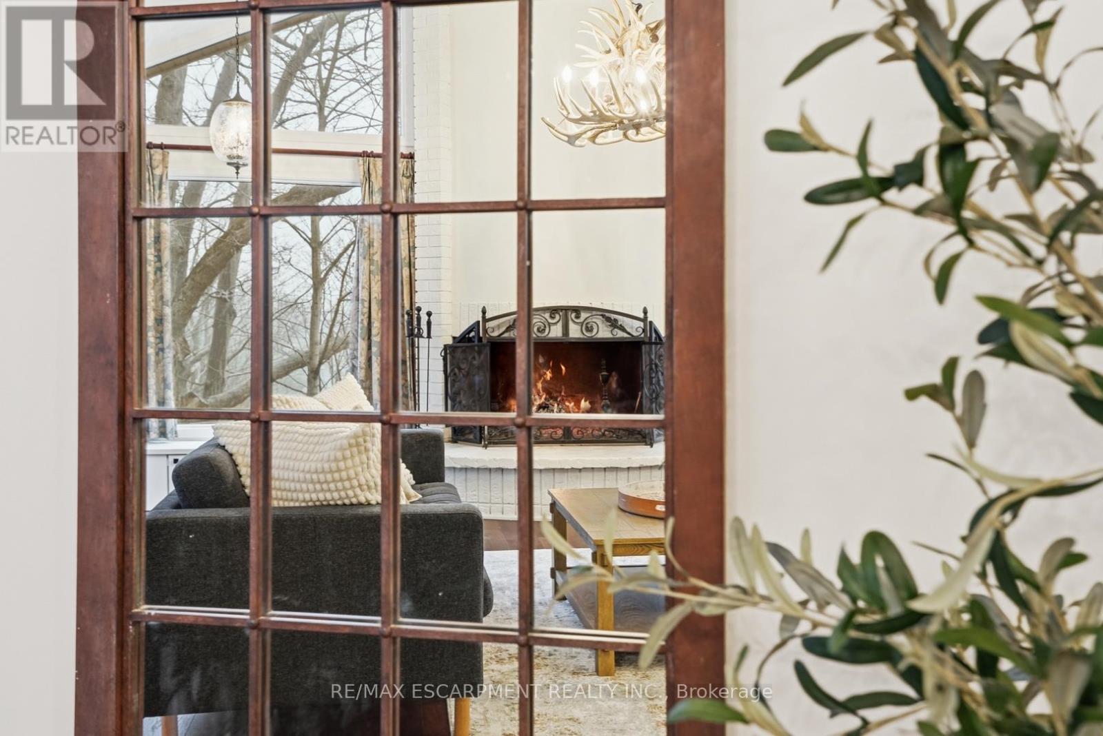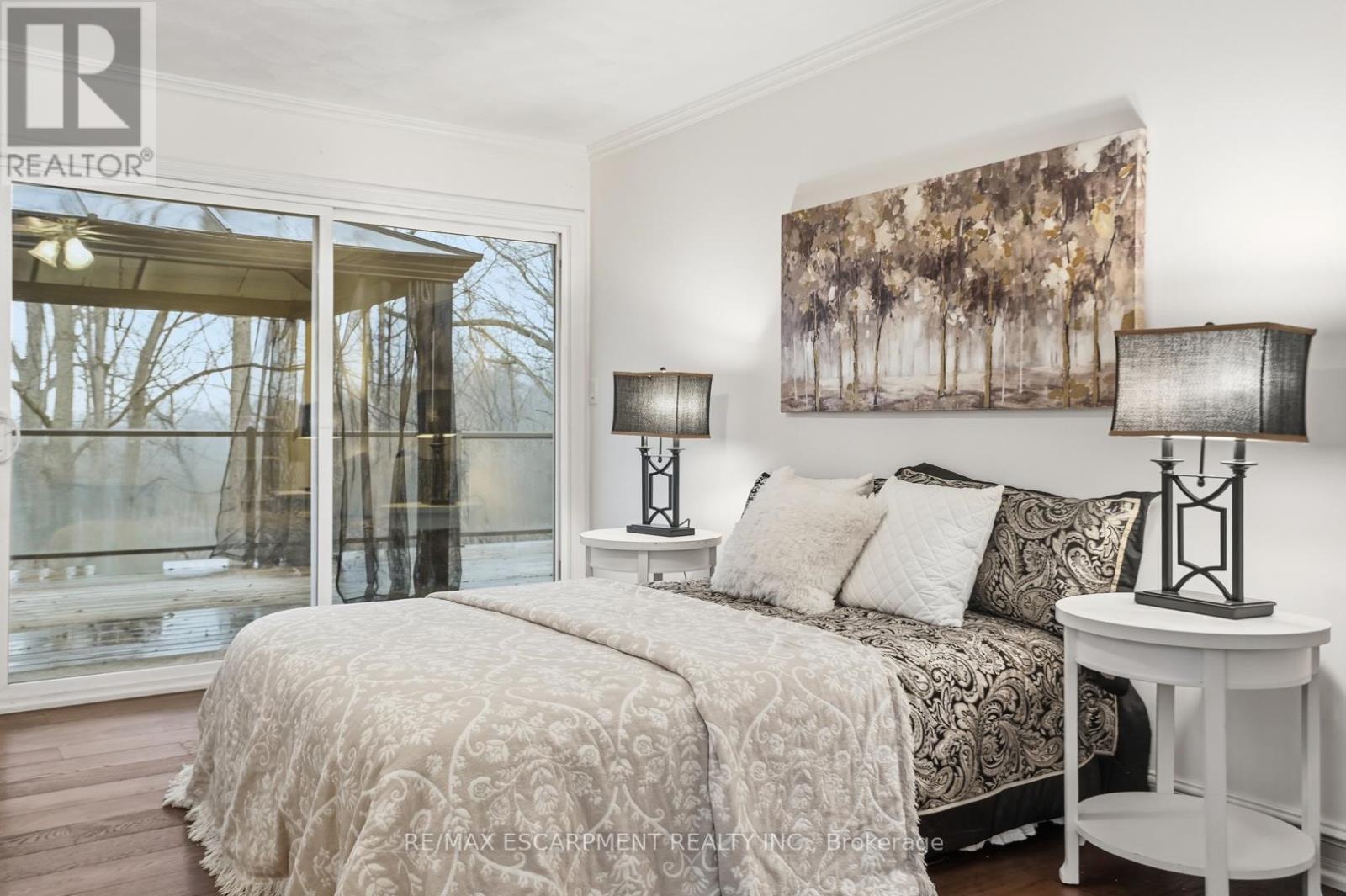 Tucked away on a picturesque 1-acre lot backing onto Grindstone Creek, this beautifully renovated raised bungalow offers the ultimate in privacy, tranquility, and multi-generational living. Surrounded by mature trees and natural beauty, this truly one of a kind offering delivers peaceful, country-style living just minutes from city amenities. The main level features three spacious bedrooms, including a serene primary retreat with a private ensuite and walk-out to the primary level deck. Set high in the Carolinian tree canopy, this large outdoor space is perfect for morning coffee, entertaining, or unwinding at sunset. The bright, airy living room is highlighted by vaulted ceilings, expansive windows that flood the space with natural light, and a cozy, raised hearth fireplace as its focal point. The custom made, cherry wood eat-in kitchen blends function and style, showcasing stainless steel appliances, granite countertops, and ample cabinetry-ideal for both everyday living and entertaining. The fully finished walkout basement offers excellent versatility with a self-contained in-law suite featuring a separate entrance, one bedroom, a full bathroom, dedicated laundry, a large great room with gas woodstove, and a bonus three season sunroom leading to a private outdoor deck-perfect for extended family, guests, or potential rental income. This exceptional property offers a unique lifestyle opportunity in one of Burlington's most desirable and undiscovered settings. RSA. (id:64974)