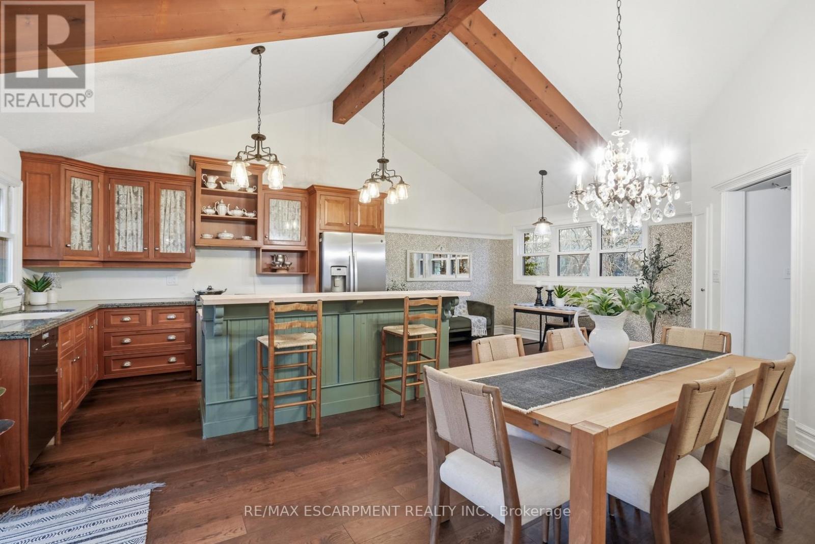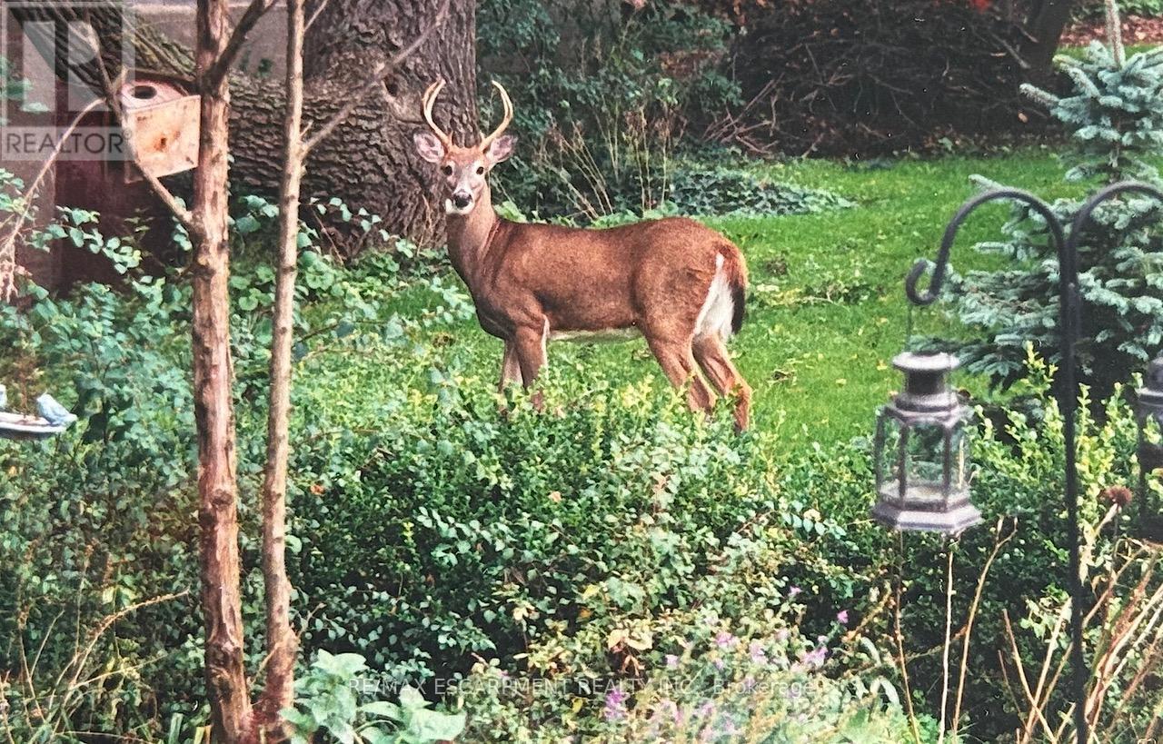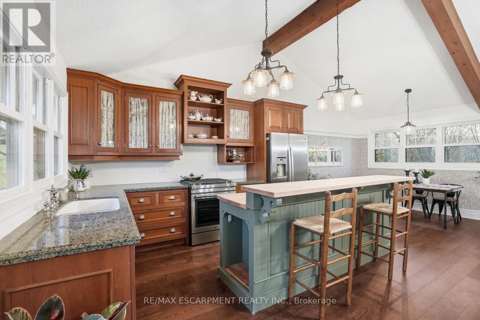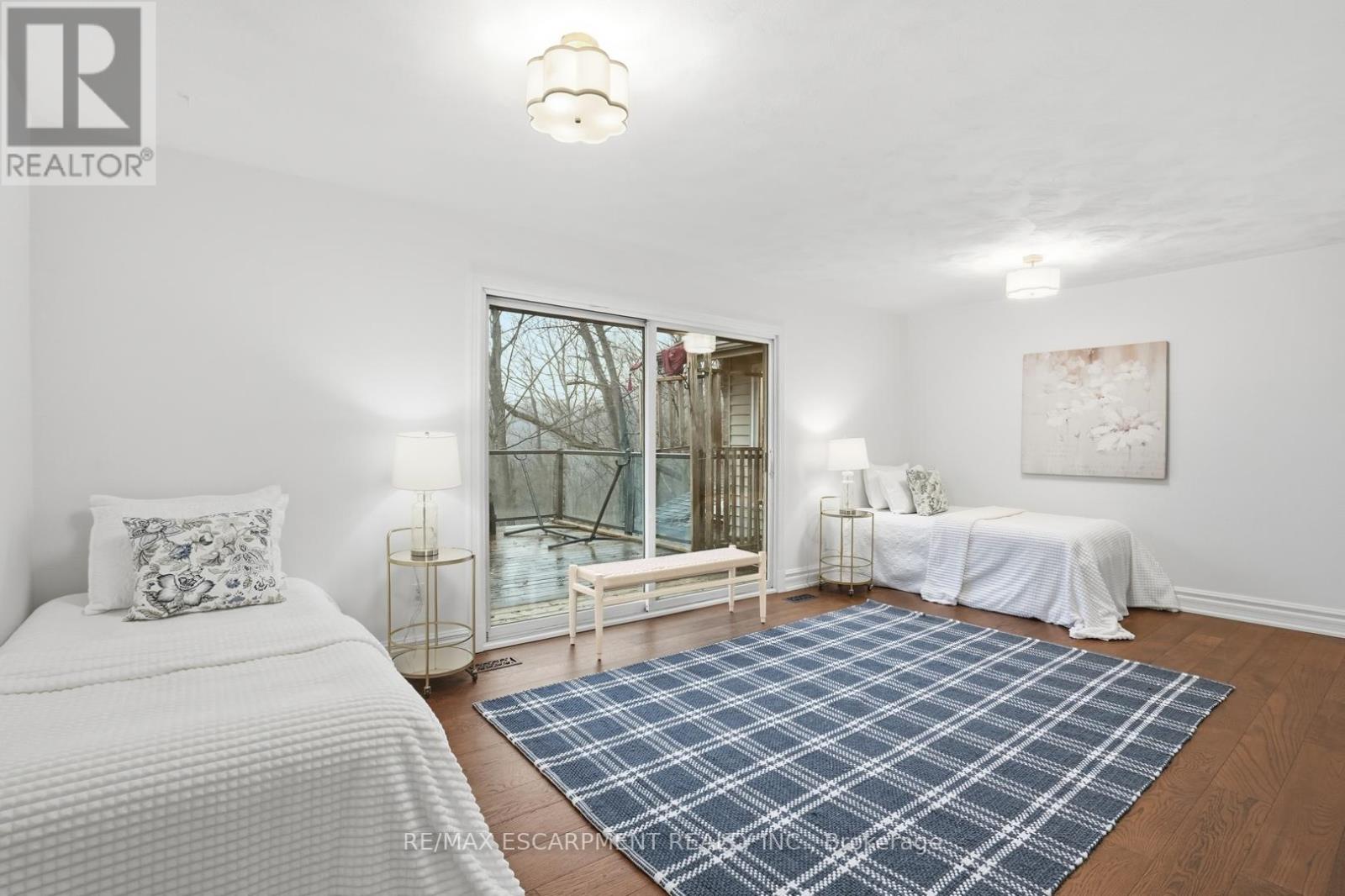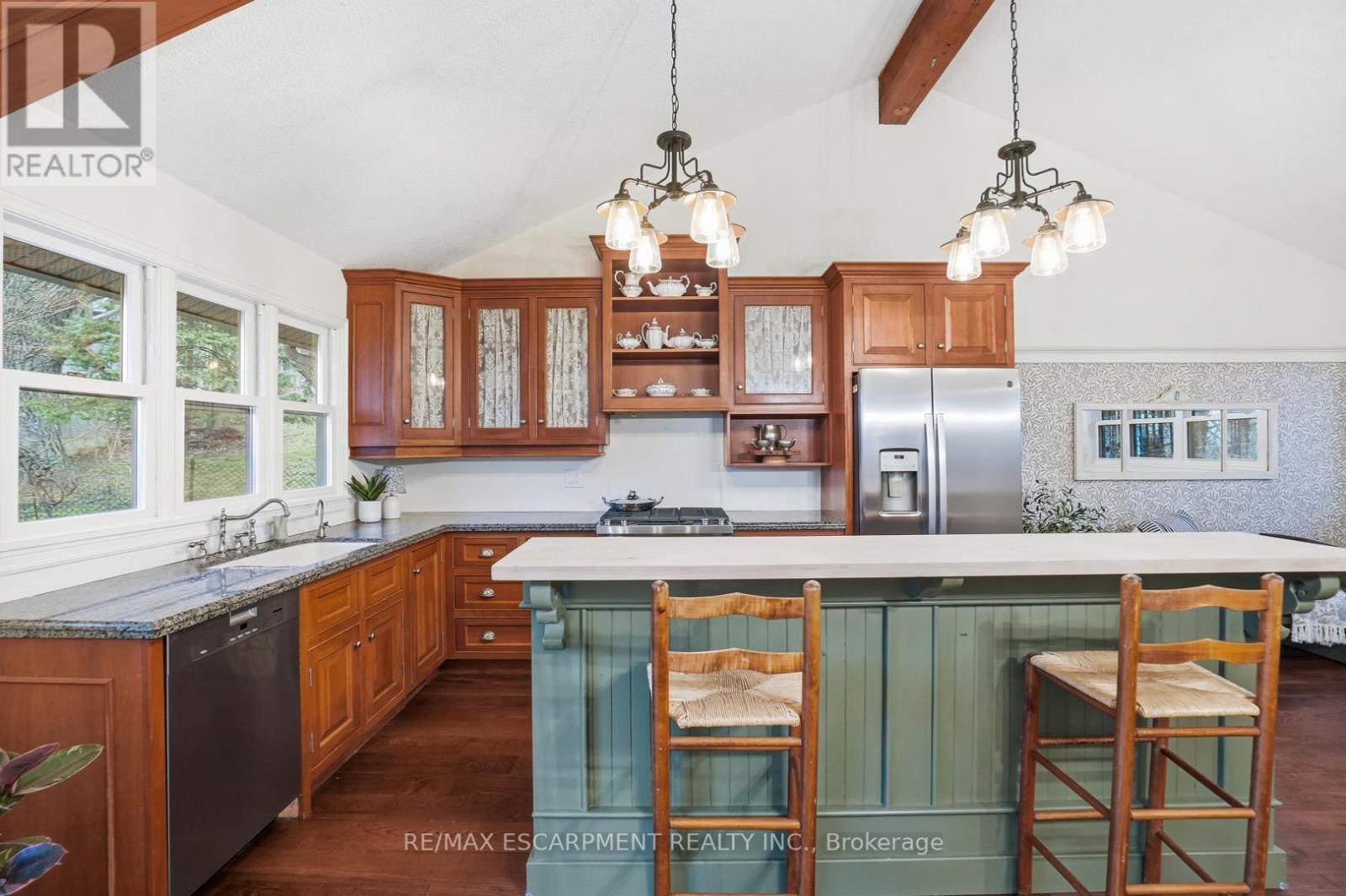 Tucked away on a picturesque 1-acre lot backing onto Grindstone Creek, this beautifully renovated raised bungalow offers the ultimate in privacy, tranquility, and multi-generational living. Surrounded by mature trees and natural beauty, this truly one of a kind offering delivers peaceful, country-style living just minutes from city amenities. The main level features three spacious bedrooms, including a serene primary retreat with a private ensuite and walk-out to the primary level deck. Set high in the Carolinian tree canopy, this large outdoor space is perfect for morning coffee, entertaining, or unwinding at sunset. The bright, airy living room is highlighted by vaulted ceilings, expansive windows that flood the space with natural light, and a cozy, raised hearth fireplace as its focal point. The custom made, cherry wood eat-in kitchen blends function and style, showcasing stainless steel appliances, granite countertops, and ample cabinetry-ideal for both everyday living and entertaining. The fully finished walkout basement offers excellent versatility with a self-contained in-law suite featuring a separate entrance, one bedroom, a full bathroom, dedicated laundry, a large great room with gas woodstove, and a bonus three season sunroom leading to a private outdoor deck-perfect for extended family, guests, or potential rental income. This exceptional property offers a unique lifestyle opportunity in one of Burlington's most desirable and undiscovered settings. RSA. (id:64974)
