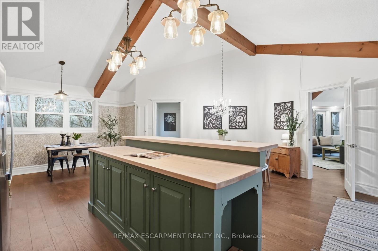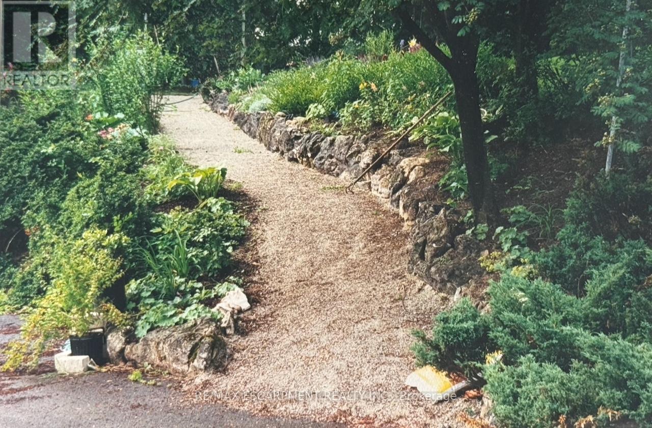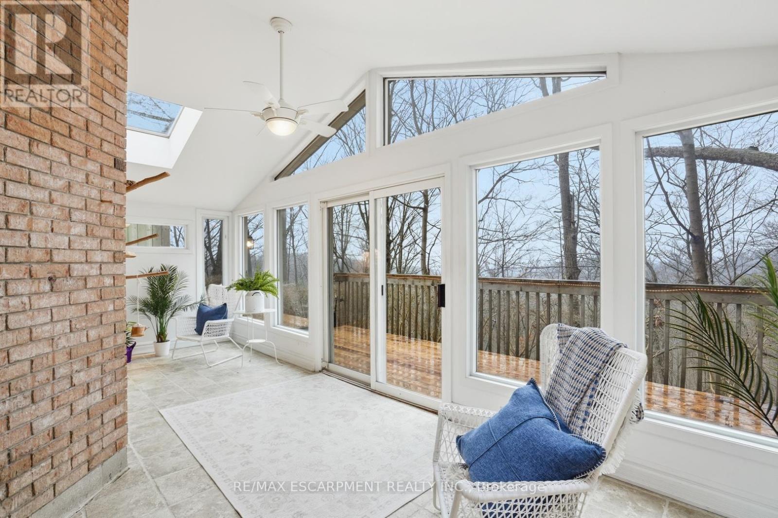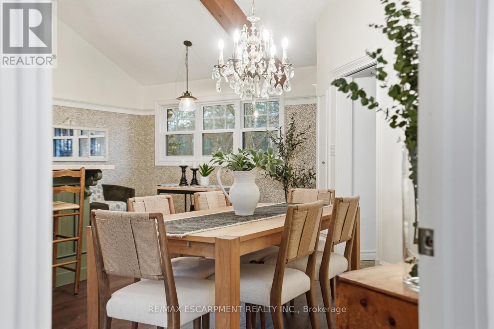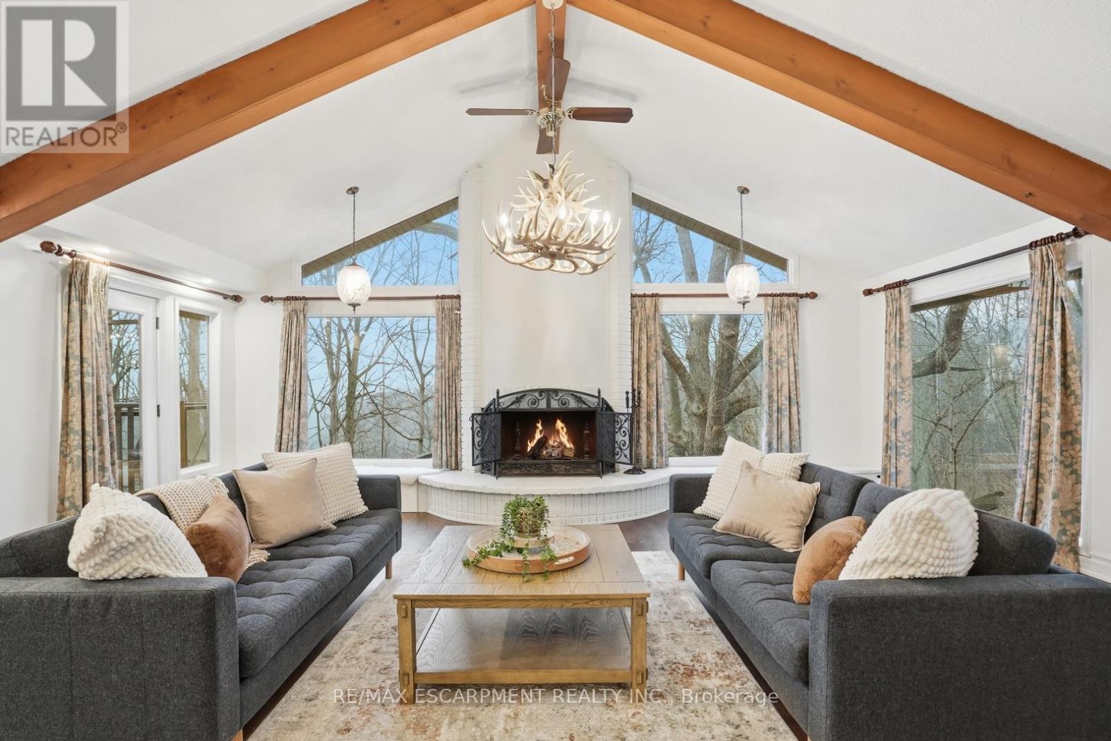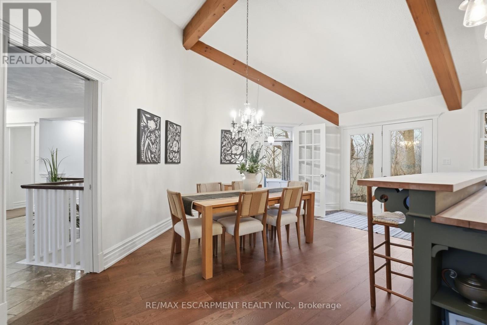 Tucked away on a picturesque 1-acre lot backing onto Grindstone Creek, this beautifully renovated raised bungalow offers the ultimate in privacy, tranquility, and multi-generational living. Surrounded by mature trees and natural beauty, this truly one of a kind offering delivers peaceful, country-style living just minutes from city amenities. The main level features three spacious bedrooms, including a serene primary retreat with a private ensuite and walk-out to the primary level deck. Set high in the Carolinian tree canopy, this large outdoor space is perfect for morning coffee, entertaining, or unwinding at sunset. The bright, airy living room is highlighted by vaulted ceilings, expansive windows that flood the space with natural light, and a cozy, raised hearth fireplace as its focal point. The custom made, cherry wood eat-in kitchen blends function and style, showcasing stainless steel appliances, granite countertops, and ample cabinetry-ideal for both everyday living and entertaining. The fully finished walkout basement offers excellent versatility with a self-contained in-law suite featuring a separate entrance, one bedroom, a full bathroom, dedicated laundry, a large great room with gas woodstove, and a bonus three season sunroom leading to a private outdoor deck-perfect for extended family, guests, or potential rental income. This exceptional property offers a unique lifestyle opportunity in one of Burlington's most desirable and undiscovered settings. RSA. (id:64974)