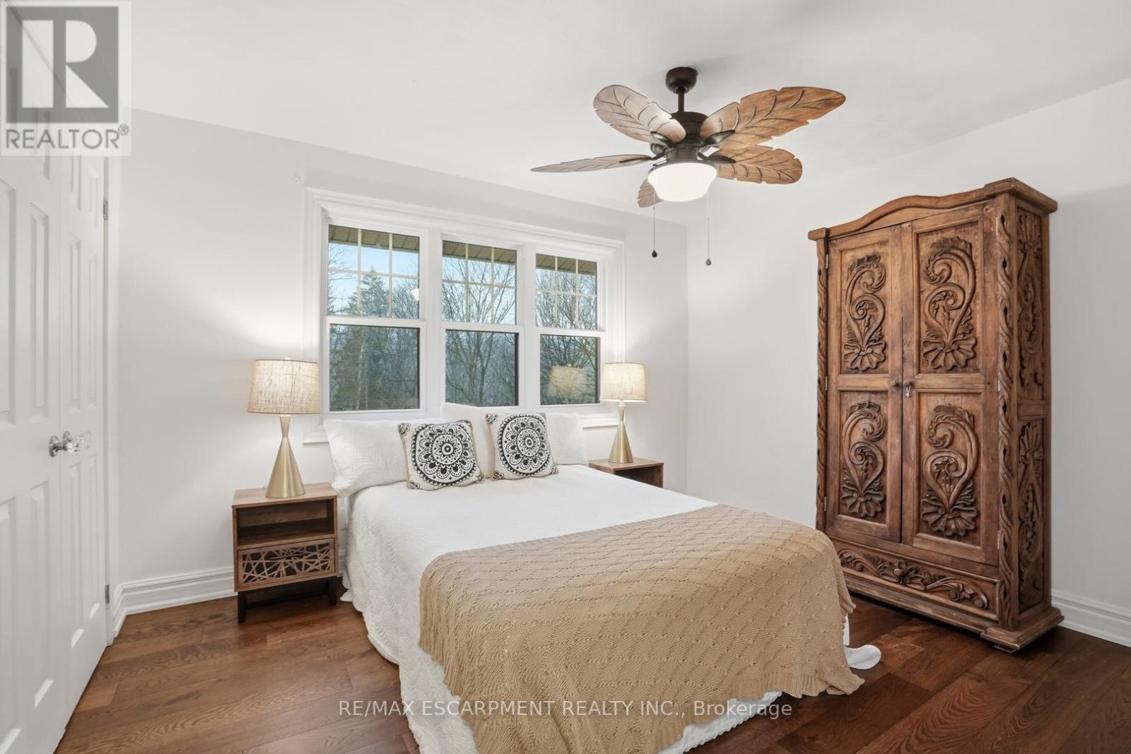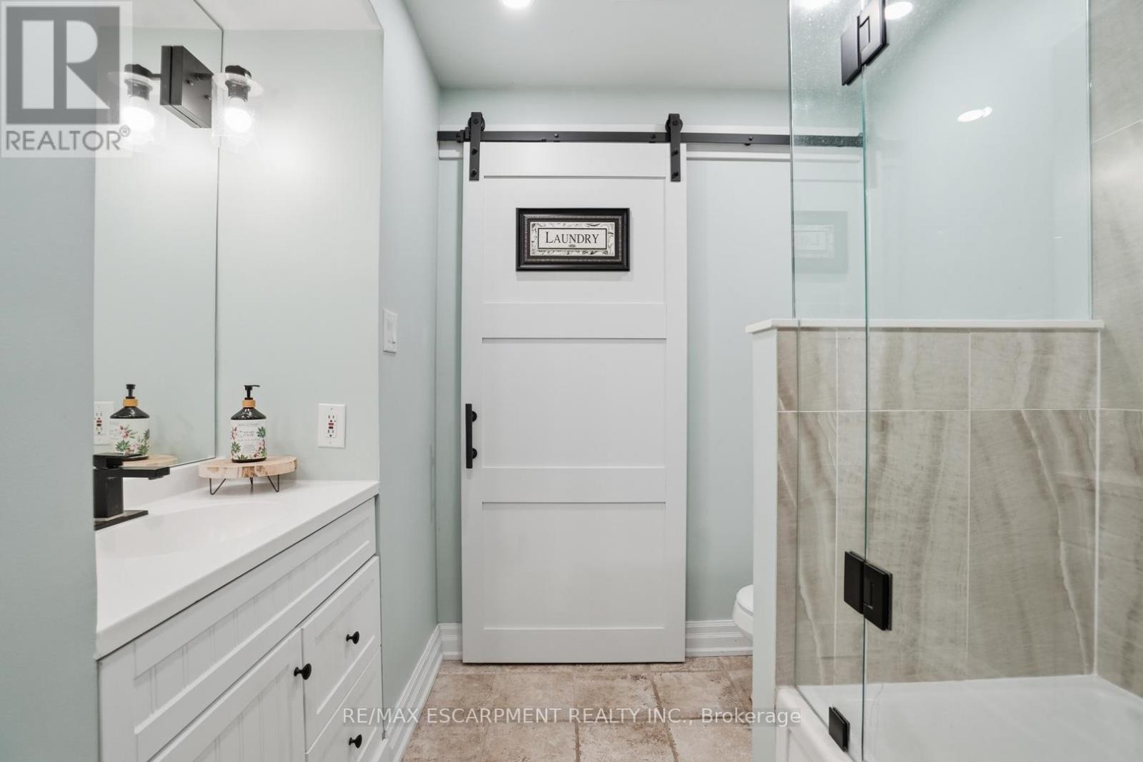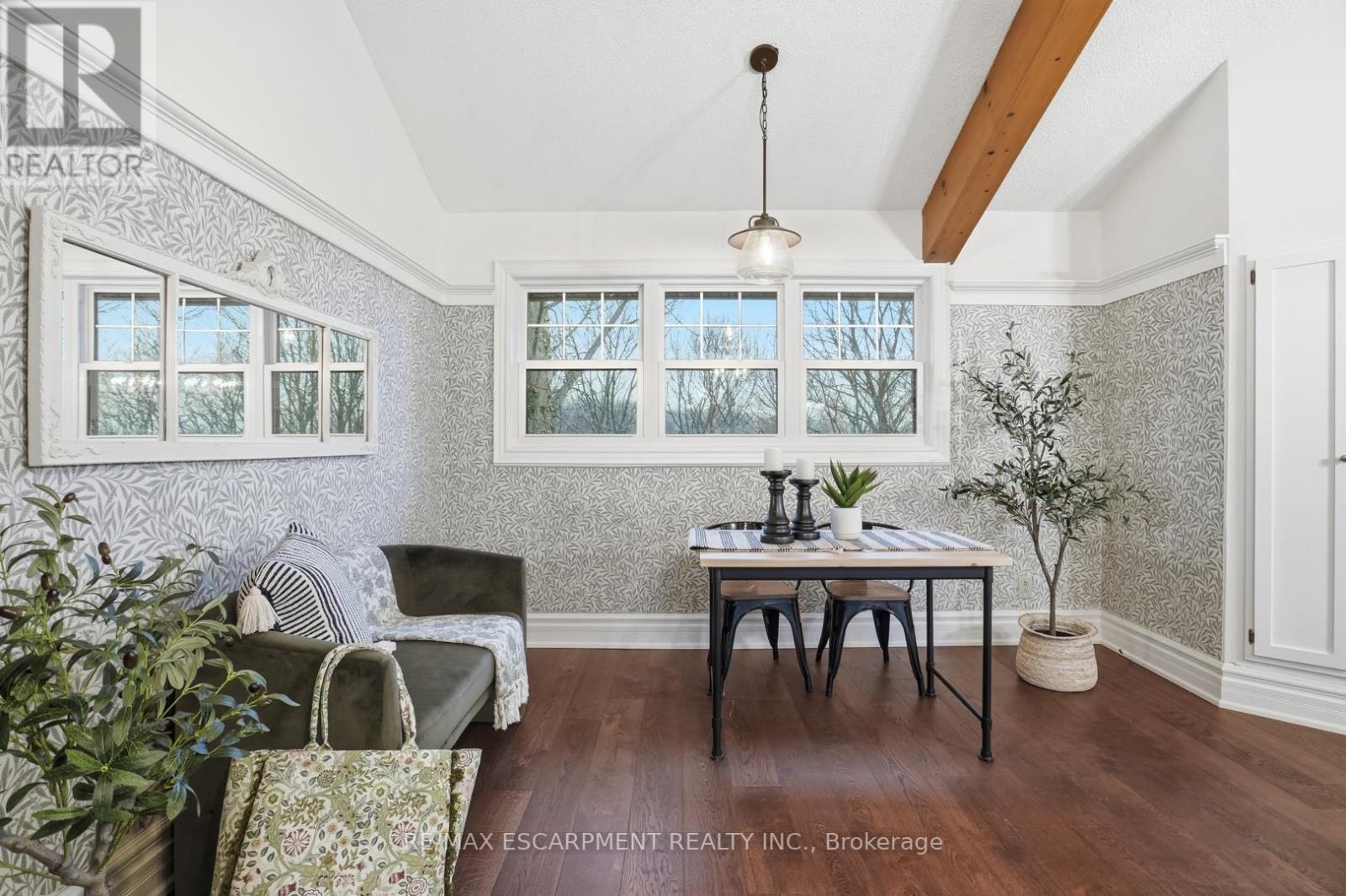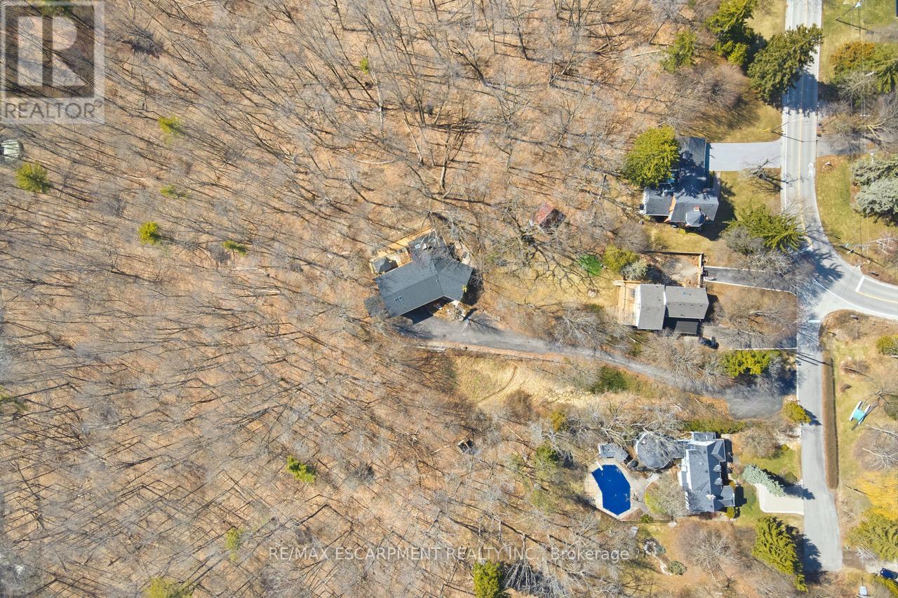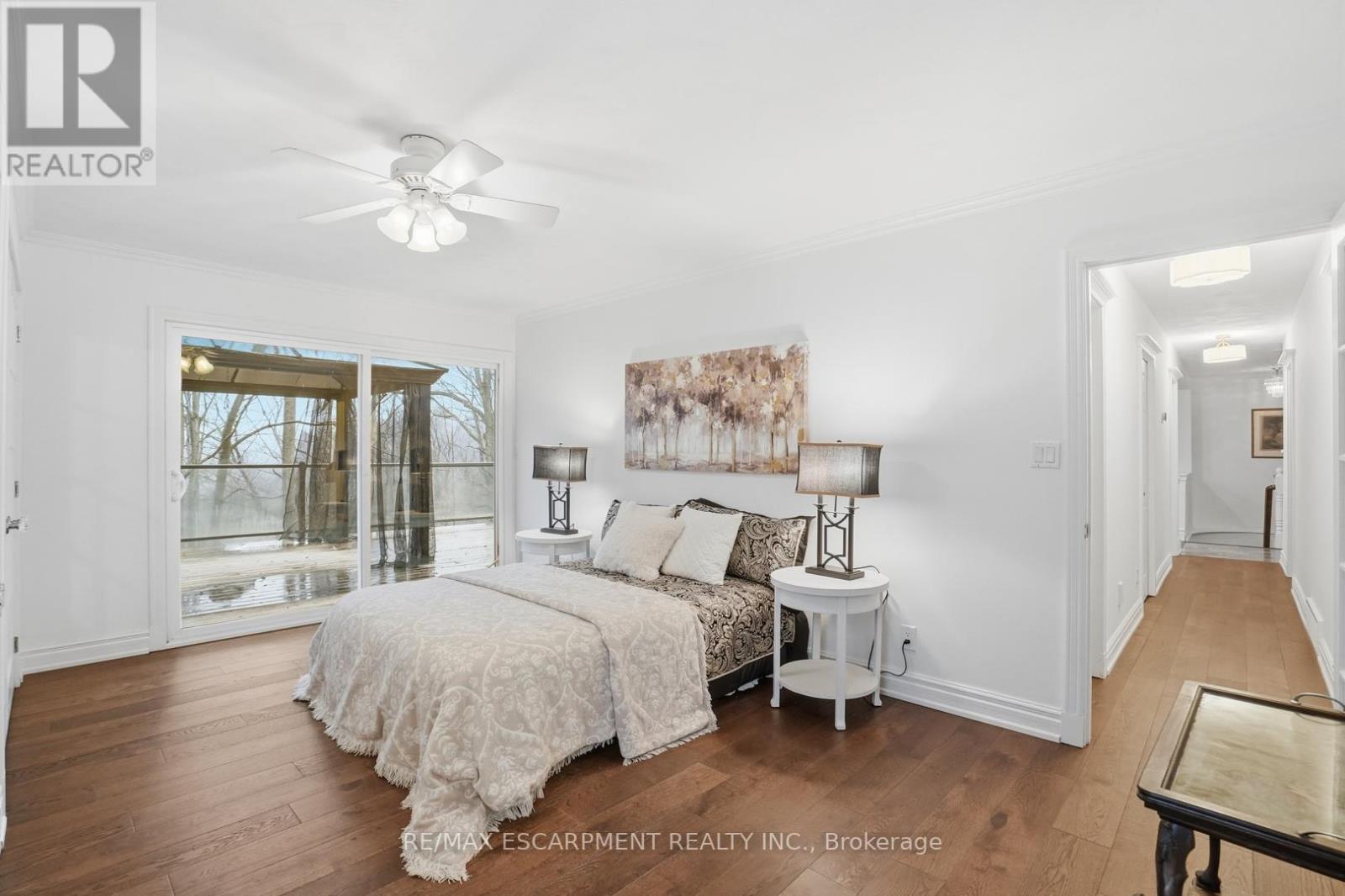 Tucked away on a picturesque 1-acre lot backing onto Grindstone Creek, this beautifully renovated raised bungalow offers the ultimate in privacy, tranquility, and multi-generational living. Surrounded by mature trees and natural beauty, this truly one of a kind offering delivers peaceful, country-style living just minutes from city amenities. The main level features three spacious bedrooms, including a serene primary retreat with a private ensuite and walk-out to the primary level deck. Set high in the Carolinian tree canopy, this large outdoor space is perfect for morning coffee, entertaining, or unwinding at sunset. The bright, airy living room is highlighted by vaulted ceilings, expansive windows that flood the space with natural light, and a cozy, raised hearth fireplace as its focal point. The custom made, cherry wood eat-in kitchen blends function and style, showcasing stainless steel appliances, granite countertops, and ample cabinetry-ideal for both everyday living and entertaining. The fully finished walkout basement offers excellent versatility with a self-contained in-law suite featuring a separate entrance, one bedroom, a full bathroom, dedicated laundry, a large great room with gas woodstove, and a bonus three season sunroom leading to a private outdoor deck-perfect for extended family, guests, or potential rental income. This exceptional property offers a unique lifestyle opportunity in one of Burlington's most desirable and undiscovered settings. RSA. (id:64974)