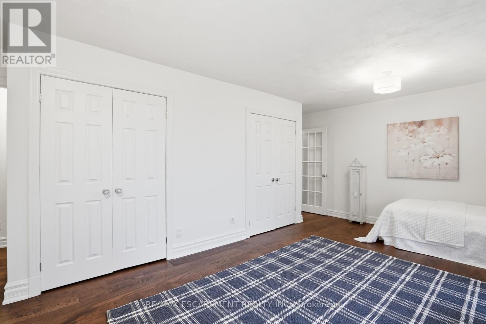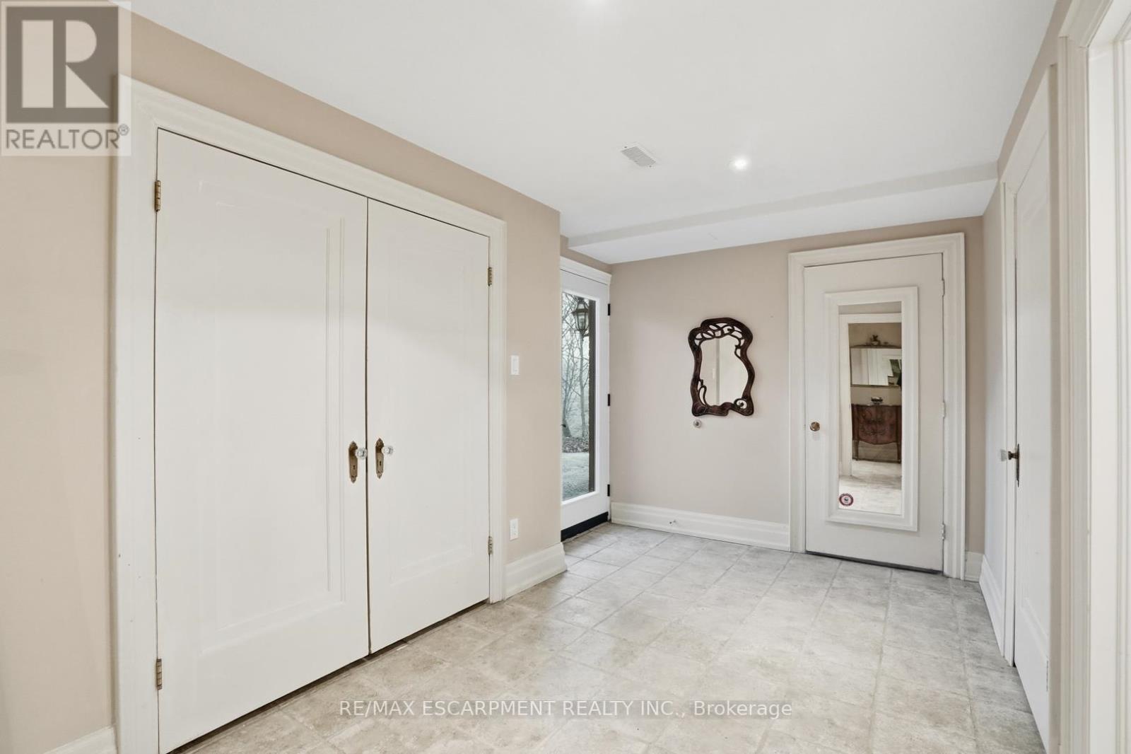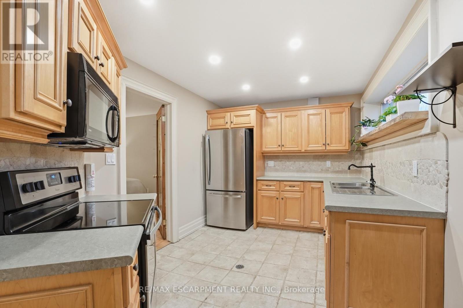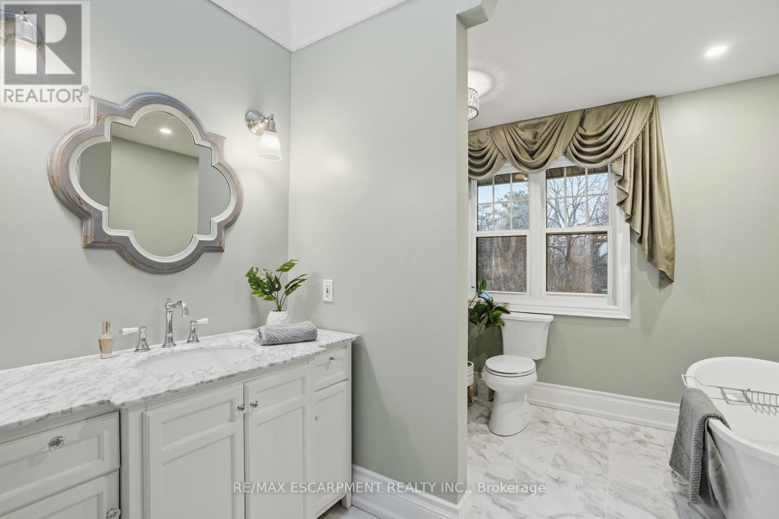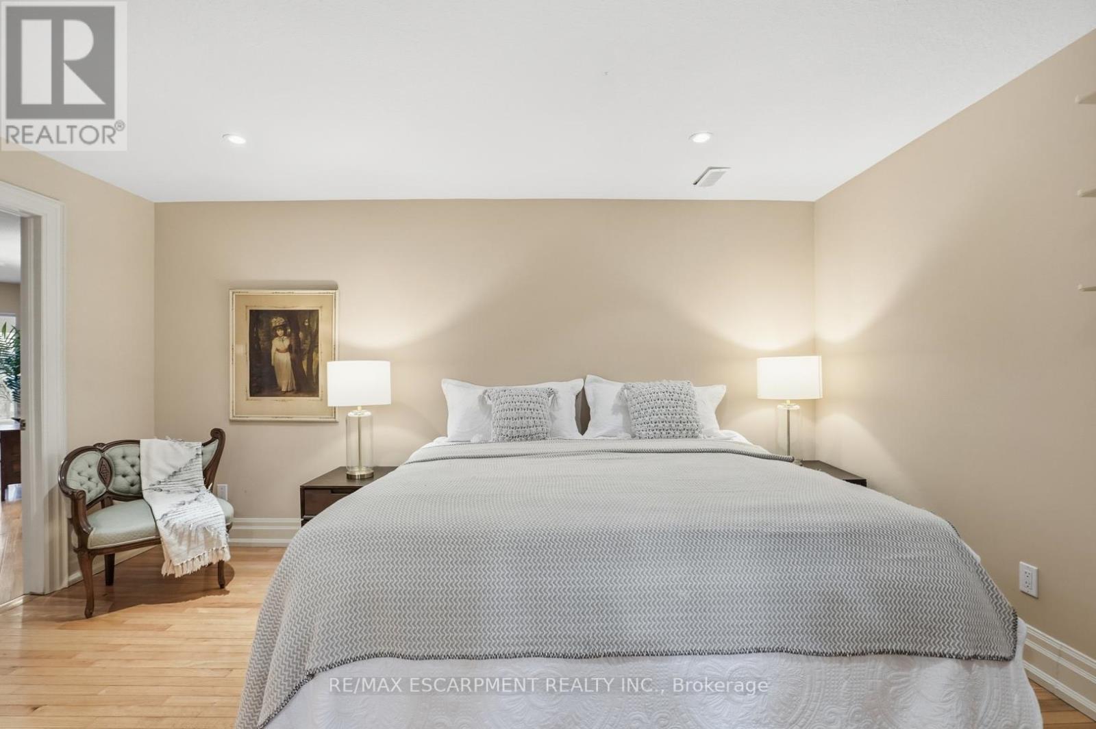 Tucked away on a picturesque 1-acre lot backing onto Grindstone Creek, this beautifully renovated raised bungalow offers the ultimate in privacy, tranquility, and multi-generational living. Surrounded by mature trees and natural beauty, this truly one of a kind offering delivers peaceful, country-style living just minutes from city amenities. The main level features three spacious bedrooms, including a serene primary retreat with a private ensuite and walk-out to the primary level deck. Set high in the Carolinian tree canopy, this large outdoor space is perfect for morning coffee, entertaining, or unwinding at sunset. The bright, airy living room is highlighted by vaulted ceilings, expansive windows that flood the space with natural light, and a cozy, raised hearth fireplace as its focal point. The custom made, cherry wood eat-in kitchen blends function and style, showcasing stainless steel appliances, granite countertops, and ample cabinetry-ideal for both everyday living and entertaining. The fully finished walkout basement offers excellent versatility with a self-contained in-law suite featuring a separate entrance, one bedroom, a full bathroom, dedicated laundry, a large great room with gas woodstove, and a bonus three season sunroom leading to a private outdoor deck-perfect for extended family, guests, or potential rental income. This exceptional property offers a unique lifestyle opportunity in one of Burlington's most desirable and undiscovered settings. RSA. (id:64974)
