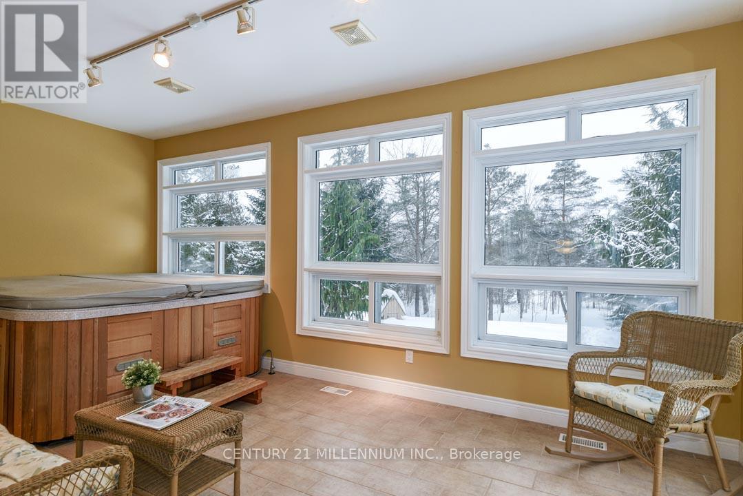 Built in 2003, by Charleston Homes, is this quality-constructed, 3+1 bedroom bungalow, set on a mature, private, park-like 2.05 acre lot, with an ornamental pond with a waterfall feature, bush, and small stream. Hardwood and porcelain tile flooring and 9-foot ceilings are found throughout, along with transom windows, vinyl casement windows, glass inserts in the front doors, side lights and elliptical glass above the front door. Maple "Barzotti" Kitchen with centre island with breakfast bar, SS appliances, tumbled marble backsplash, open to the Living. Dining has a coffered ceiling. Sunroom features 8-person hot tub plus garden door walk-out to a tiered deck and backyard. Primary w/ large walk-in closet, 5-piece ensuite w/ double sinks, jacuzzi tub & glass shower. Bright lower level has in-law suite potential w/ sep entry, Oak Kitchenette w/ granite countertop and breakfast bar, gas fireplace and nearby 4-pc bath. 4th bedroom or office has French doors. In addition to the attached 2-car garage, a detached approx. 20 ft. x 34 ft. workshop/garage offers hydro, a 240-volt, 60-amp service. This centrally located home is 10 minutes to all shopping amenities and the hospital in nearby Orangeville, is a 5-minute drive to Highways 10, 9, and Airport Rd for easy commuting and is a 45 min drive to TO. Recent upgrades include: furnace (2024), A/C (2025), humidifier (2025), well pump (2025), water softener (2024). (id:64974)