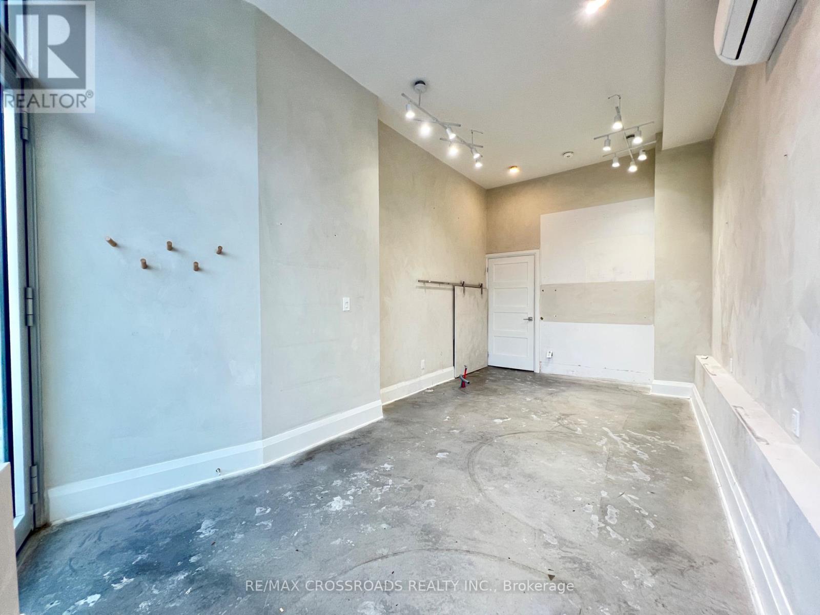 Newer modern retail unit with low front window, 11ft ceiling height, 2 pc washroom, excellent exposure in trendy and popular junction village. High pedestrian zone. Ample access to street parking and Green P just steps away. Open concept plan with extra sound insulation in walls. Space is suitable for professional office, hair salon, quick serve food/beverage, retail store/service, art studio, massage therapy, Includes washer and dryer in basement. Basement (unfinished) can be used for storage. Retail area approximately 10 ft by 20 ft. Tenant pays: Rent + TMI ($500/mth) + HST & tenant insurance & hydro (metered separately). Water is included. Heating/AC system is electric wall unit. (id:64974)