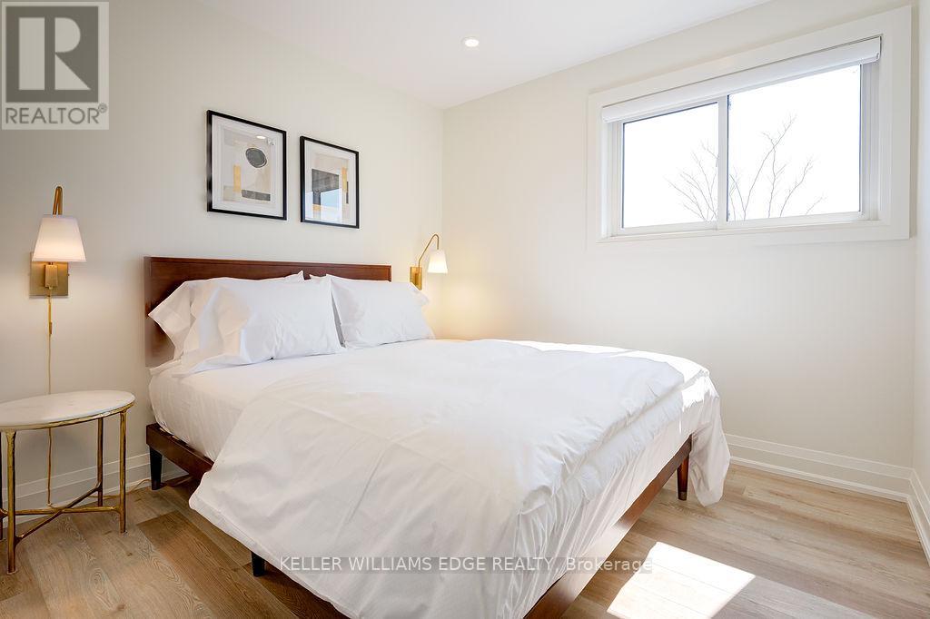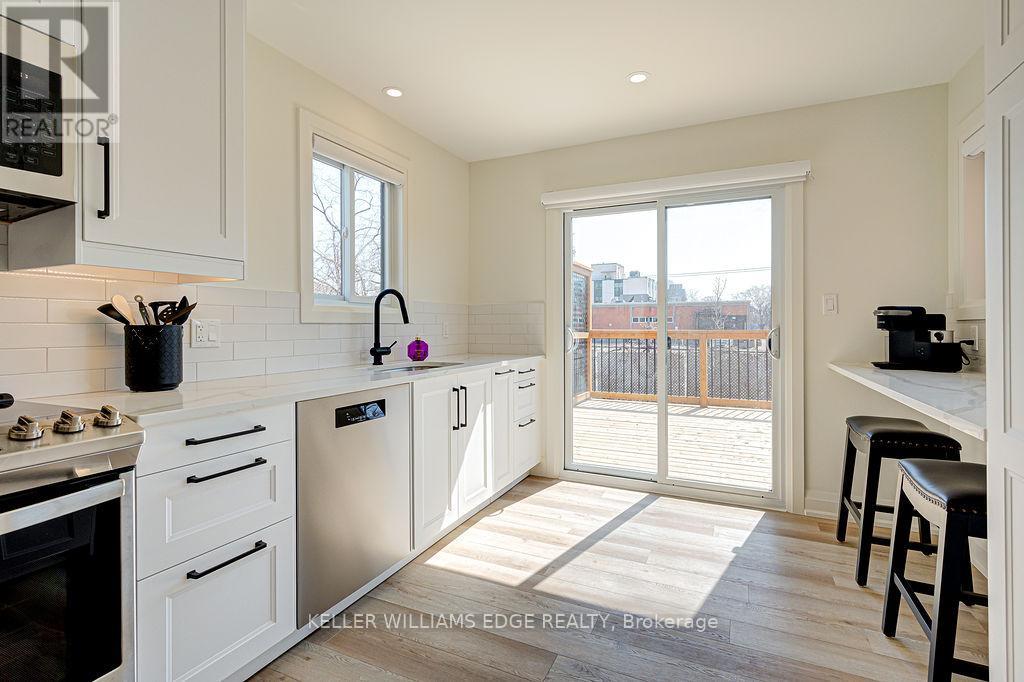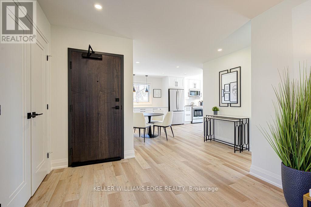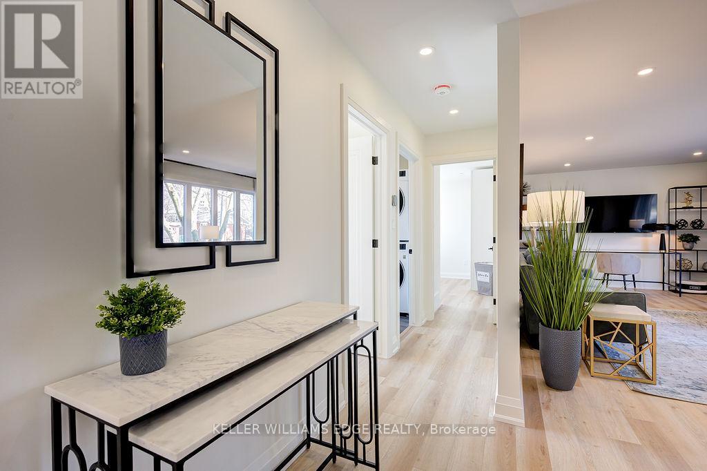 FULLY FURNISHED all inclusive Short or Long Term RENTAL Stunning luxury 2-bedroom, 1-bathroom, main floor suite located in boutique building. Elegantly appointed and beautifully upgraded suite features a purposeful layout with wide plank luxury vinyl hardwood throughout the open concept kitchen, dining and living rooms. This bright and spacious fully furnished suite features a comfortable living space with plush sofa and chairs, glass office desk with display shelving flanking and smart TV. Enjoy the chef-style kitchen, complete with floor to ceiling white shaker cabinetry, premium quartz countertop, full-sized stainless-steel appliances, including dishwasher and built-in microwave, tile backsplash, under cabinet lighting, breakfast bar and sliding glass patio door leading to the large private deck. Bedrooms are serene with neutral colour palettes, nightstands, quality linens, and wardrobe with plenty of storage. Spa-inspired bathroom with glass walk-in shower featuring rain head, adjustable handheld shower arm, modern pedestal sink, and full-sized stackable washer and dryer. Suite includes 2 car parking. Located steps to the exquisite downtown Burlington waterfront, Spencer Smith Park, boutique shops, restaurants, QEW, 403, 407 and GO. No smokers, all residents must qualify to lease suite. (id:64974)