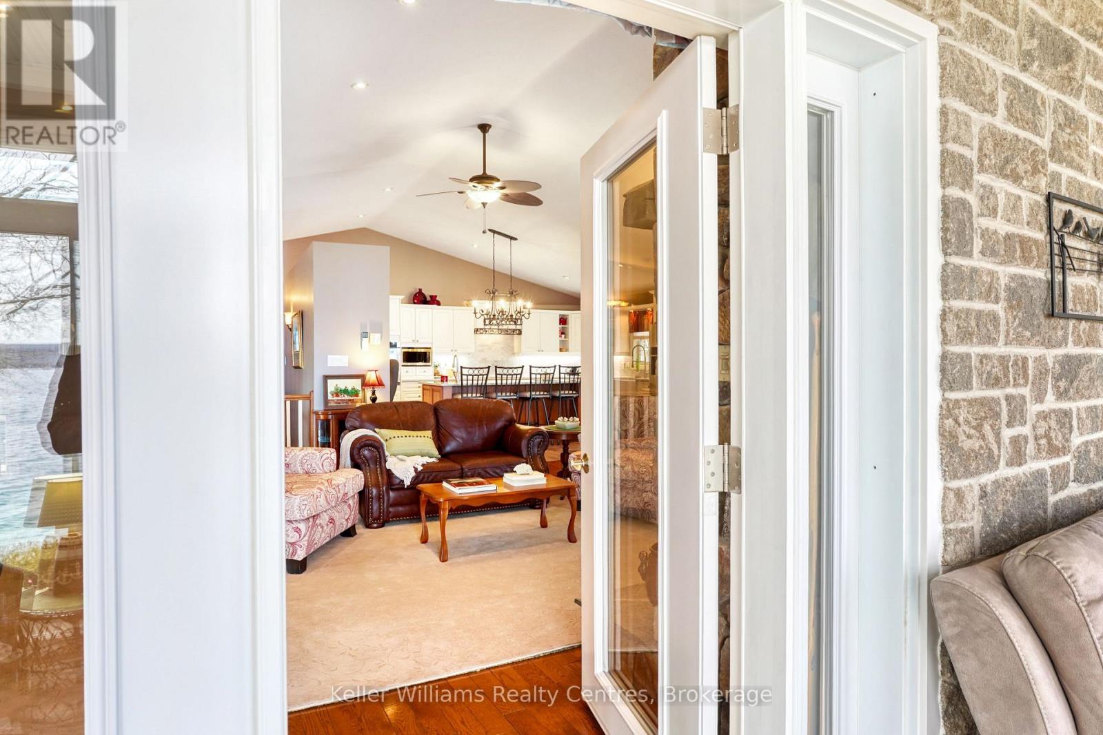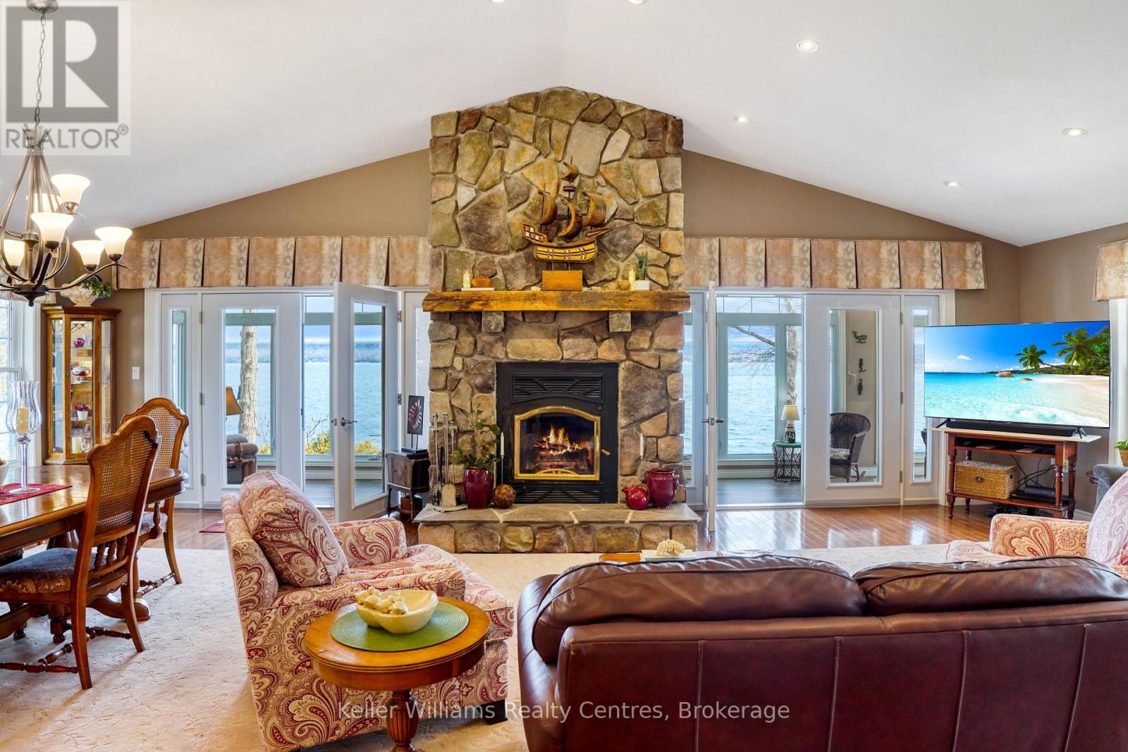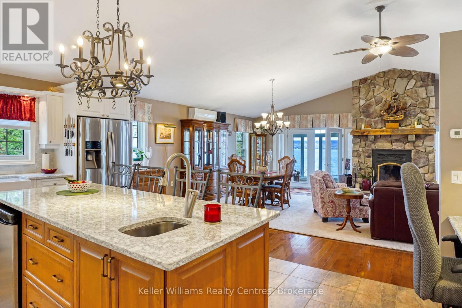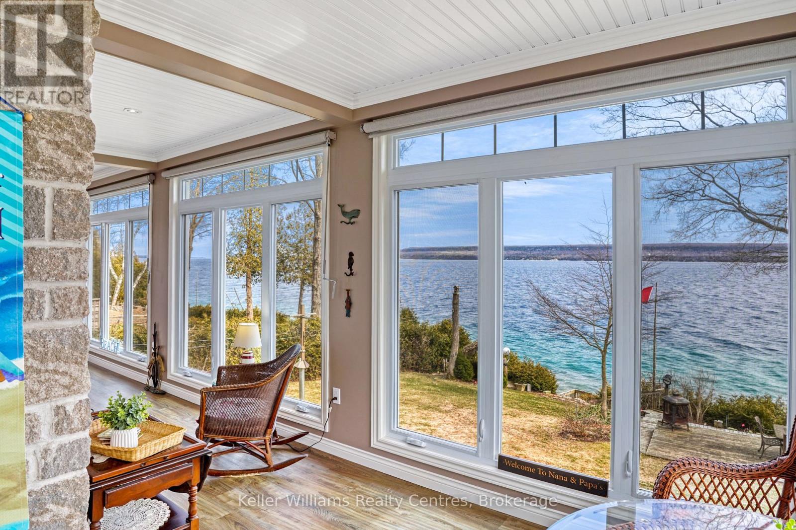 Pristine Waterfront Sanctuary on Colpoy's Bay Experience the pinnacle of Bruce Peninsula living with this custom-built legacy home, offered for the first time by its original owners. Boasting 125ft of premium shoreline on Colpoy's Bay, this property is a rare masterclass in waterfront design, created for family memories and effortless entertaining. The Waterfront & Grounds with a stunning landscaped lot features a gentle slope to the water's edge, providing easy access for swimming or docking your boat. Enjoy unparalleled views from multiple vantage points, including two water access points, expansive waterside decks, and a dedicated viewing deck. The lush gardens offer several private sitting areas to soak in the serene Georgian Bay atmosphere. Main Level Luxury: The open-concept interior is designed to keep the water in sight from almost every room. Chef's Kitchen: Features soaring cathedral ceilings, quartz counters, and a large central island. Sunroom: A bright 3-season retreat with panoramic views and double-door access. Primary Suite: An expansive retreat with double doors leading to a courtyard and the triple detached workshop. Flexibility: A large laundry room offers potential as an extra bedroom, complemented by a 4pc bath and 2pc powder room. The central living area is anchored by a cozy fireplace for cool lakeside evenings. Lower-Level Entertainment: The walk-out lower level is a dedicated hub for guests, featuring a large family room with a custom bar and direct access to the waterside patio. Two oversized bedrooms, a 3pc bath, and a massive storage room complete this functional space. Prime Location Located in a premier retirement and recreation enclave, you are just 7 minutes from Wiarton, offering quick access to hospitals, banks, groceries, and shops. Discover the perfect blend of privacy, custom craftsmanship, and breathtaking waterfront enjoyment on the Bruce Peninsula. (id:64974)