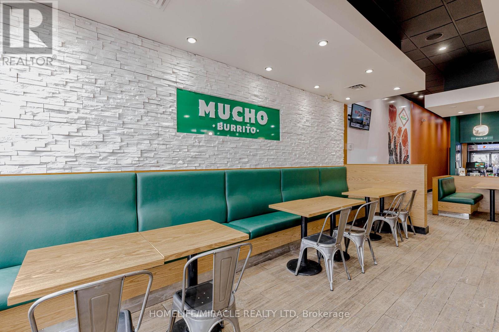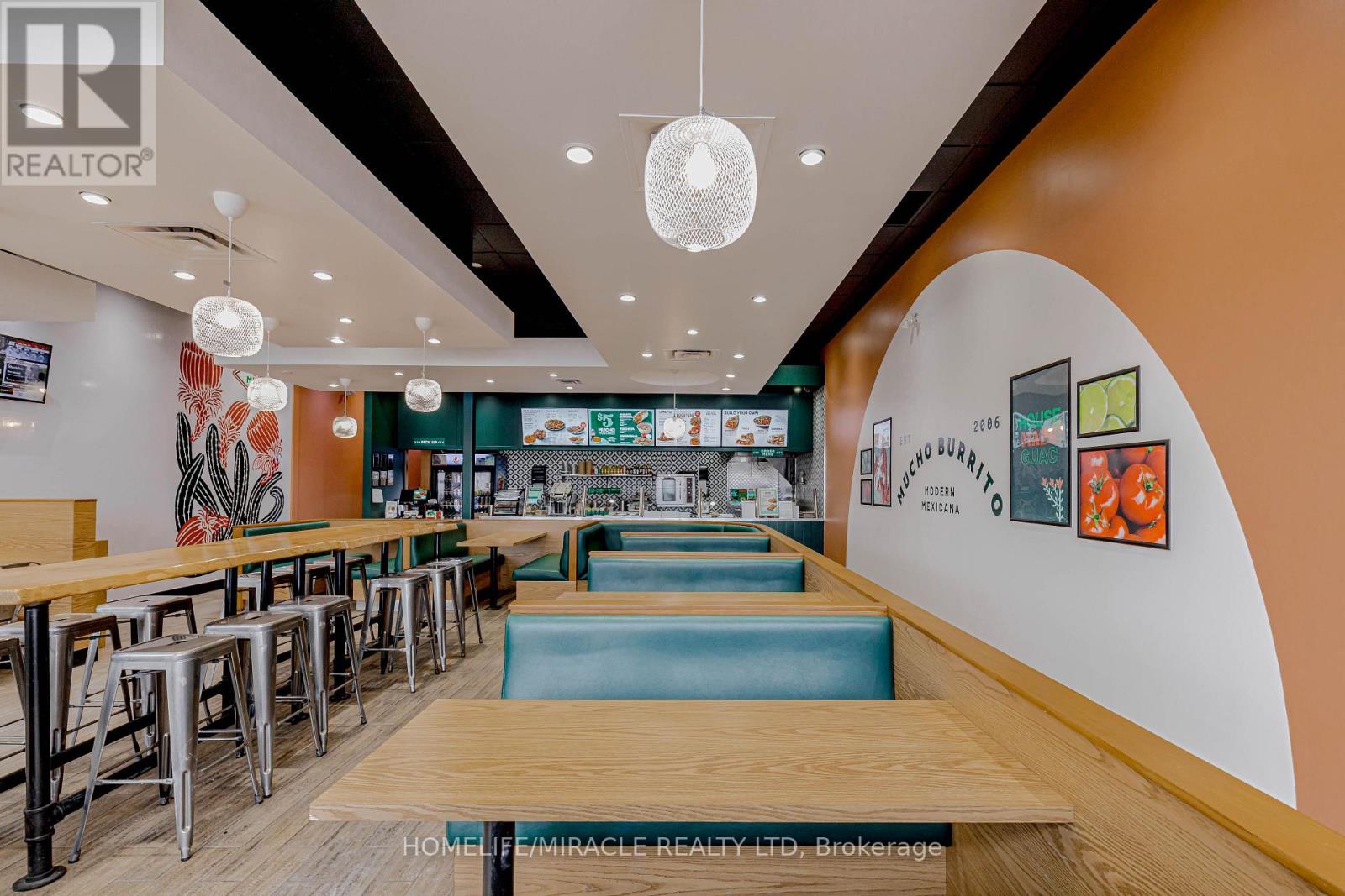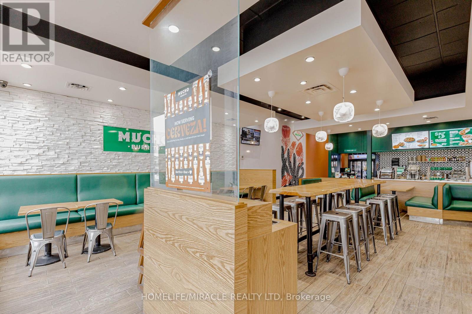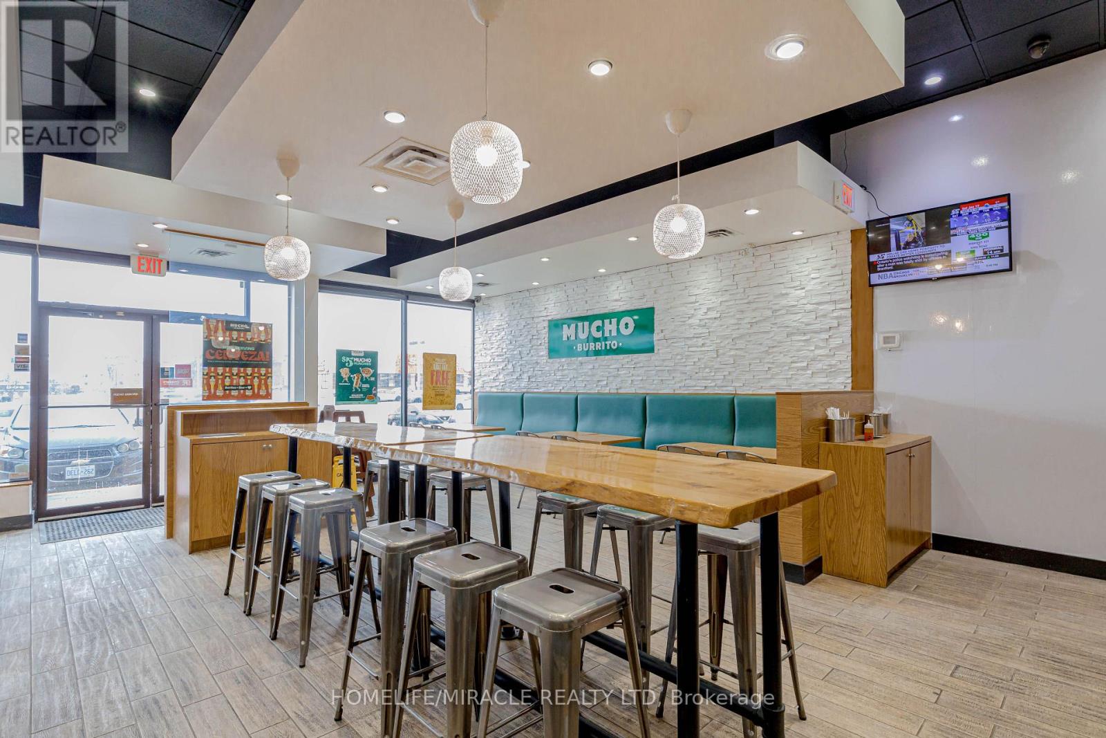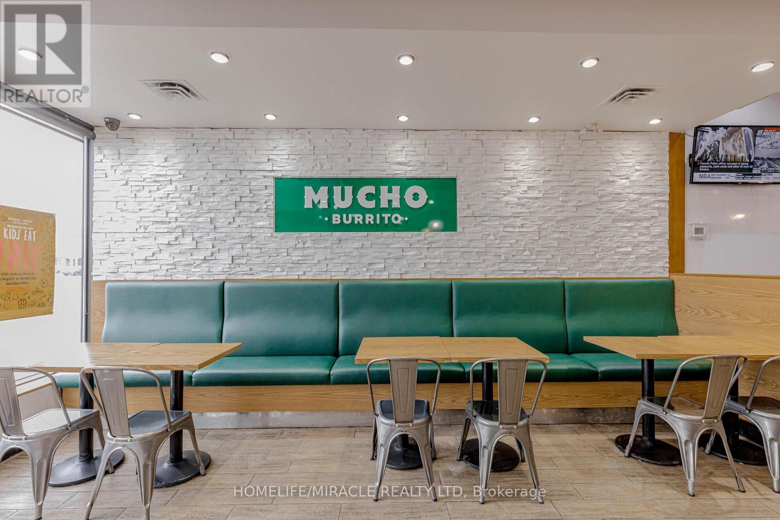 Mucho Burrito for Sale in Ajax, ON. Located at the busy intersection of Bayly St W / Harwood Ave S, surrounded by fully residential neighbourhoods. Close to schools, highways, offices, banks, and major big-box stores. Operating since 2014 with strong sales and growth potential. Avg. Monthly Sales: $53,650, Rent: $8721.71/m incl. TMI. Lease Term: Existing till May 2026 + 5 + 5 years option to renew, Royalty: 6%, Advertising: 4%, 68 seating with Turnkey operation. (id:64974)