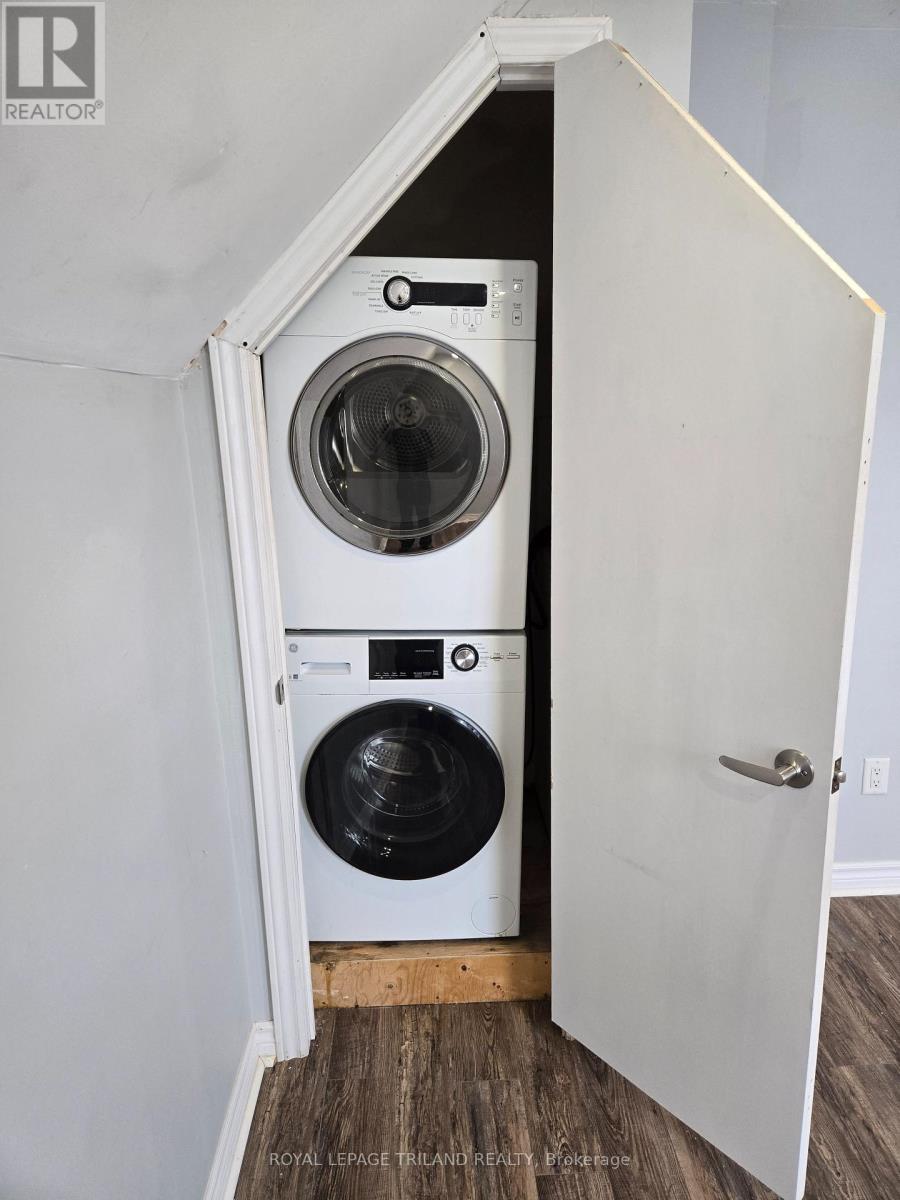 Updated 2 bedroom and 1 full bath upper floor apartment for rent as part of a duplex close to downtown St. Thomas. Open concept kitchen and living room. Good sized primary bedroom and a second bedroom, it can also be used as an office/storage room. Renovated 4 piece bath. In-suite stacked washer and dryer that is included. Laminate flooring throughout. All newer windows throughout. Newer kitchen with refrigerator, stove, range hood, and double sink. Private entrance. Hydro, Water, forced air gas heat and central air included. $1,475/mth. Application process and looking for a minimum 1 year lease. Quick possession available and easy to view. (id:64974)