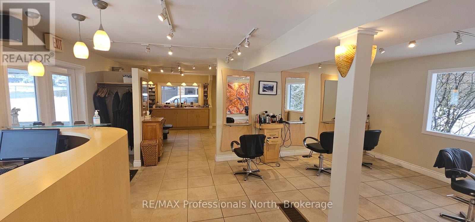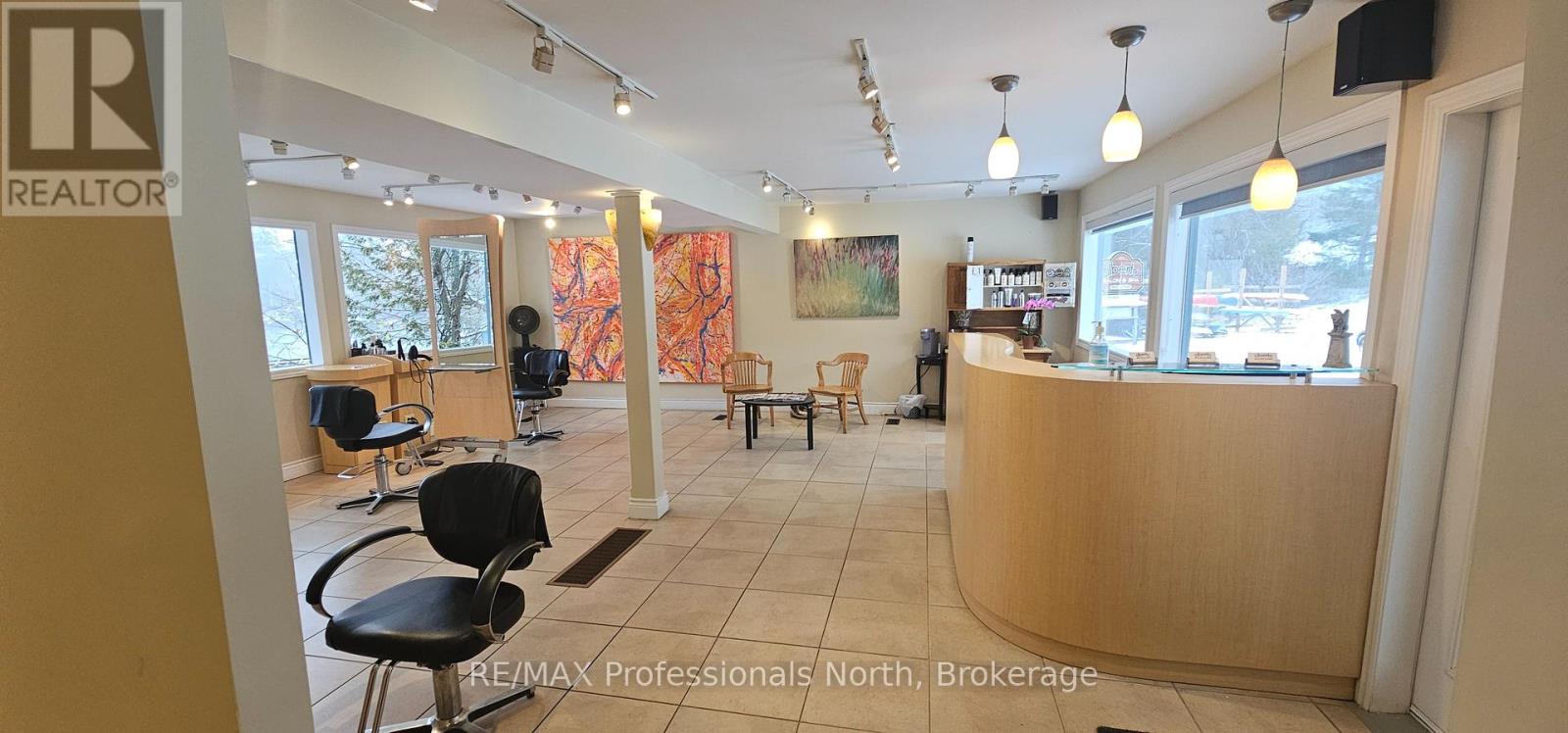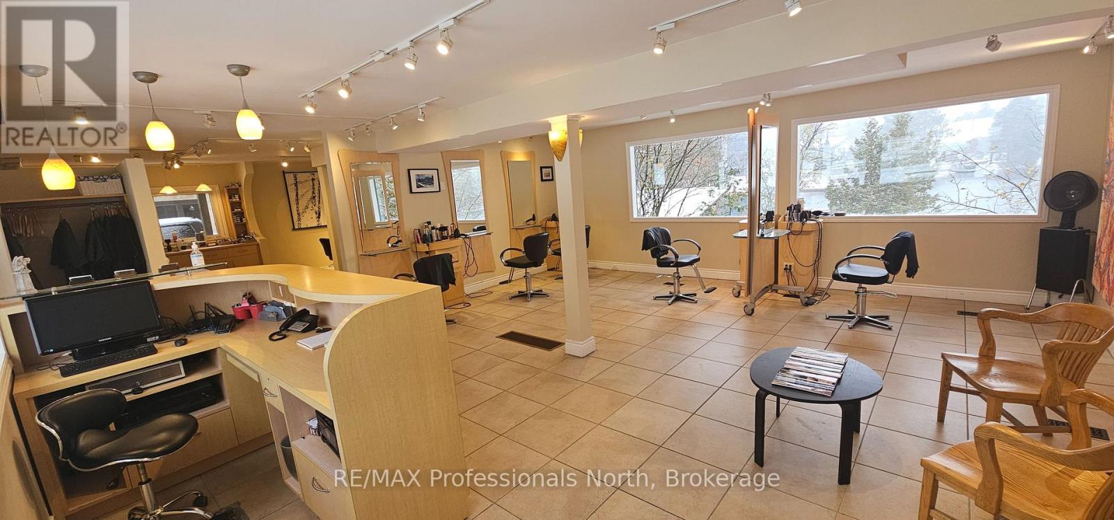 Unique opportunity to run your own salon and spa on the shores of the Muskoka River in downtown Huntsville. For Lease is approximately 800 square feet of space on the main floor with additional space for use in the basement. Currently operating as "Alberto Salon and Spa", the opportunity exists for a new operator to take over and bring their own creative style to the location, or explore other ventures. Situated conveniently beside the Huntsville Summit Centre and Huntsville High School, there is no shortage of foot and vehicular traffic, not to mention boat traffic in the Summer. Ample parking, great exposure, and a one-of-a-kind location make this memorable piece of Huntsville's past a rare opportunity. Price is for space only, and is "net" of HST, proportionate share of utilities, and maintenance. Most chattels are negotiable. Per Town of Huntsville Zoning by-law amendment C3-1772, the only permitted use shall be a hairdressing salon and spa, with a restaurant (excluding drive-through) being an additional permitted use within the existing commercial space. Potential Tenant(s) to conduct their own due diligence regarding existing and additional uses. Seeking minimum 3 year term. (id:64974)