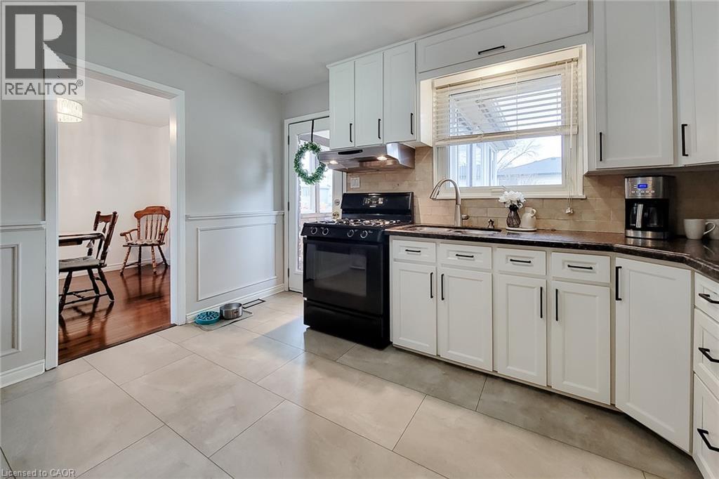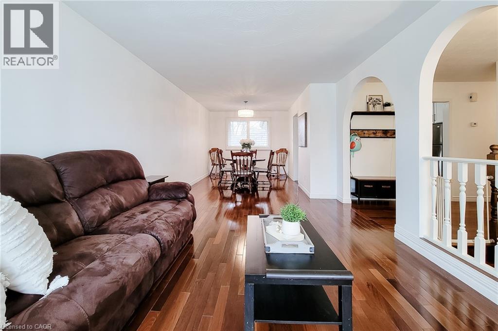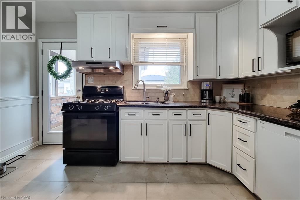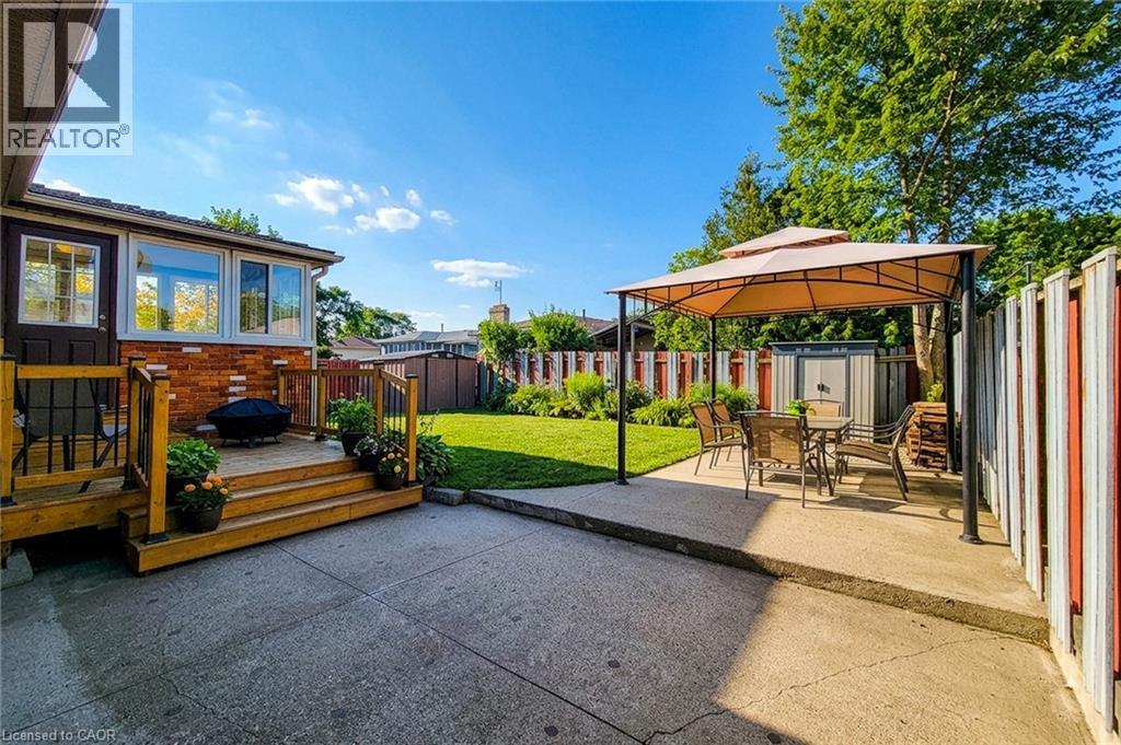 Welcome to this beautifully maintained raised ranch bungalow nestled in a quiet, family-friendly court in desirable Stoney Creek—where kids play, neighbours connect, and lasting memories are made. Offering just over 1,150 sq ft of bright, functional living space, this home features gleaming hardwood floors, California shutters, and a spacious open-concept living and dining area filled with natural light from large windows. The updated kitchen includes a brand new dishwasher and flows seamlessly into a sunroom addition, creating the perfect space to relax and enjoy views of the backyard. The main level offers three generously sized bedrooms and beautifully updated bathrooms finished in a modern white palette with stylish black accents. The raised ranch design provides a bright, fully finished lower level featuring a cozy family room with a wood-burning fireplace, an additional bedroom or office space, laundry, and ample storage. The lower level bedroom offers flexibility and can be converted back to a garage if desired. Step outside to your fully fenced backyard retreat, complete with a gazebo, updated deck, and two storage sheds—perfect for entertaining or relaxing. This home also boasts excellent curb appeal with a durable metal roof, new eavestroughs, and a furnace updated in 2025 for added peace of mind. Located within walking distance to schools, parks, and public transit, and just minutes from highway access, this home offers the perfect blend of comfort, convenience, and community. (id:64974)