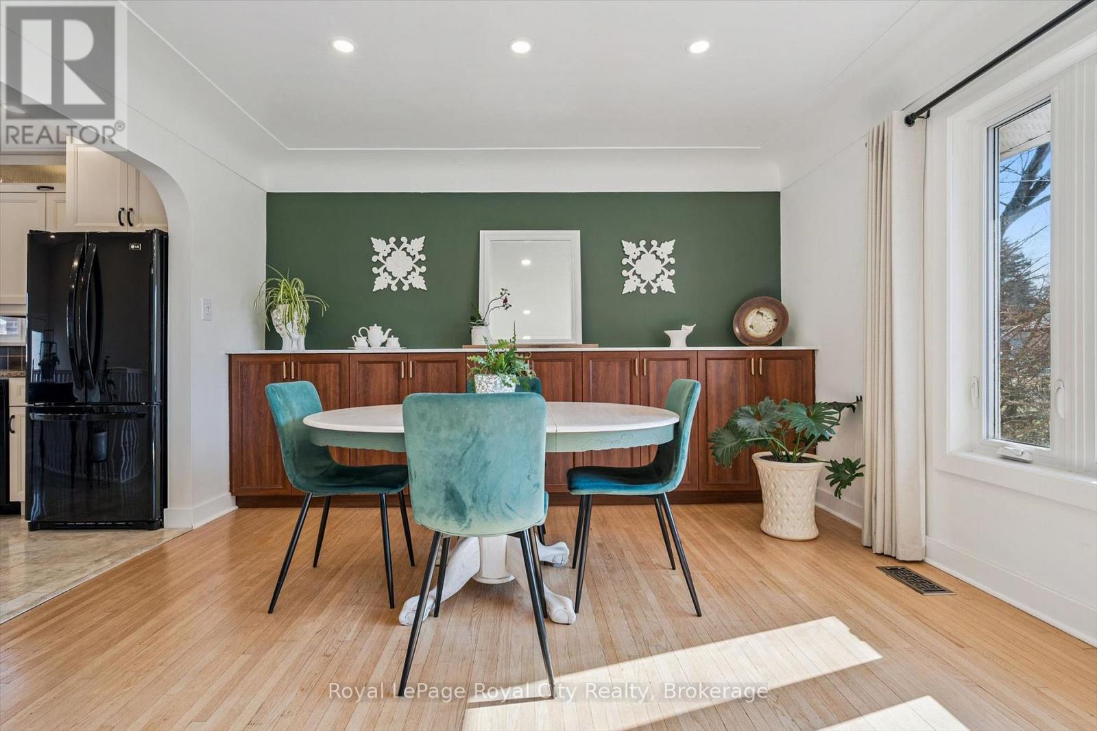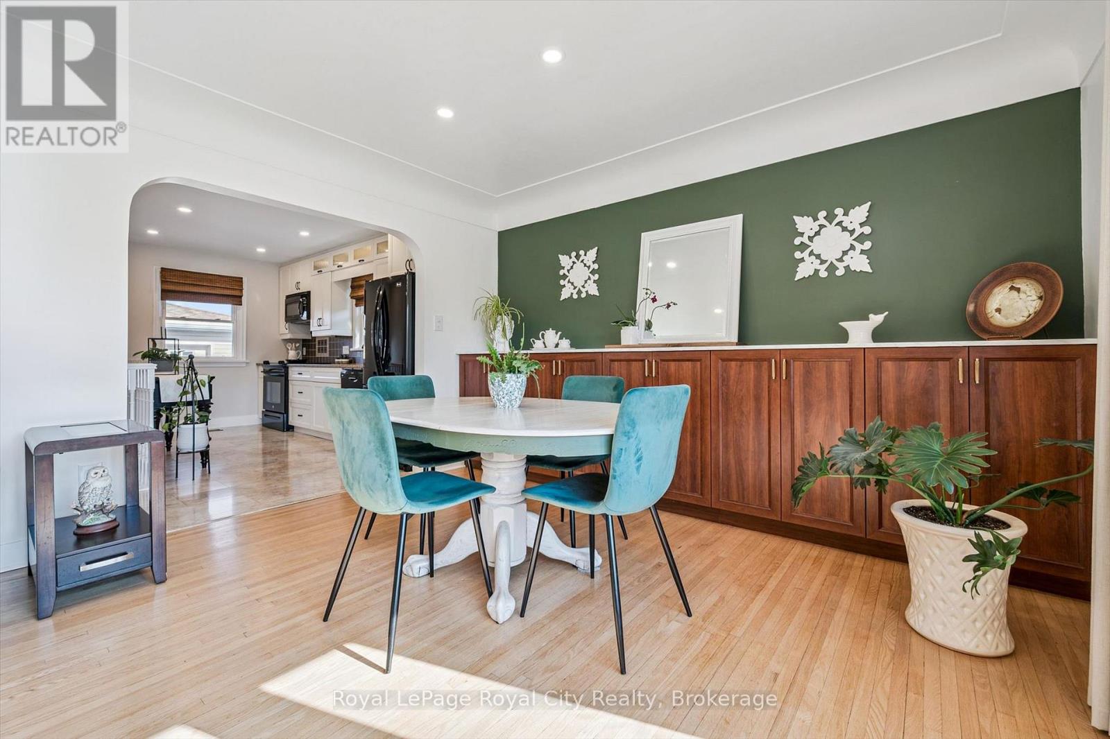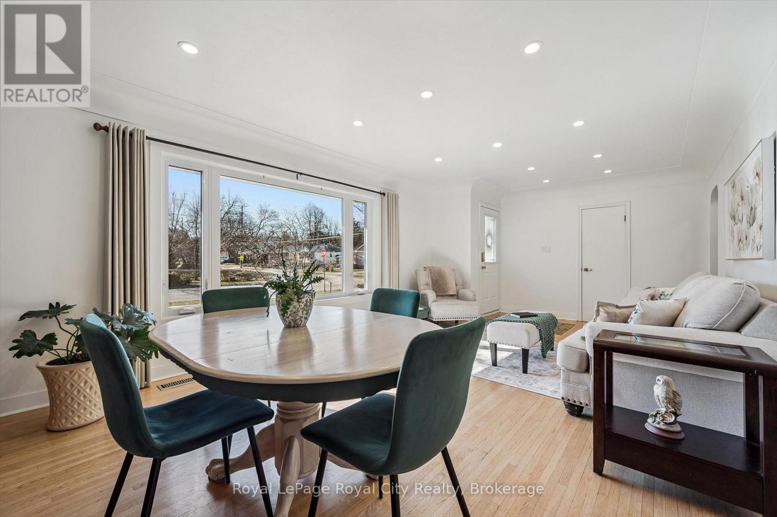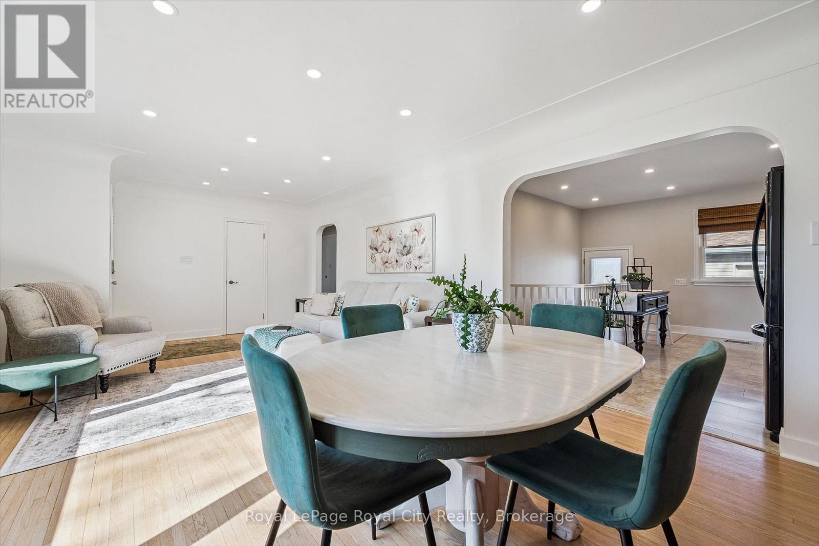 Welcome to this beautifully renovated bungalow, where modern updates meet comfortable family living in a prime location. Step inside to a bright and inviting living room and dining room, featuring elegant hardwood flooring and a large window that fills the space with natural light- perfect for both everyday living and entertaining.The functional kitchen offers ample cabinetry and workspace, making meal preparation a breeze. The main level is thoughtfully laid out with three spacious bedrooms and a well-appointed 4-piece bathroom, ideal for families or those seeking convenient one-level living. Downstairs, the fully finished basement expands your living space with stylish luxury vinyl flooring throughout. The cozy recreation room is anchored by a gas fireplace, creating the perfect setting for relaxing evenings. This level also includes two additional bedrooms and an updated 3-piece bathroom complete with a sleek glass shower- perfect for guests, extended family, or a home office setup. Outside, you will find a double wide concrete driveway, a private concrete patio, and a fully fenced backyard that is perfect for outdoor enjoyment. The detached workshop with hydro offers excellent potential for hobbies, storage, or creative use. Additional highlights include updated plumbing, a 200 Amp electrical service, and a furnace that is ~4 years old, providing added peace of mind. Located within walking distance to excellent schools, St. George's Park, downtown Guelph, Guelph General Hospital, and all essential amenities, this home truly combines style, function, and an unbeatable location. (id:64974)