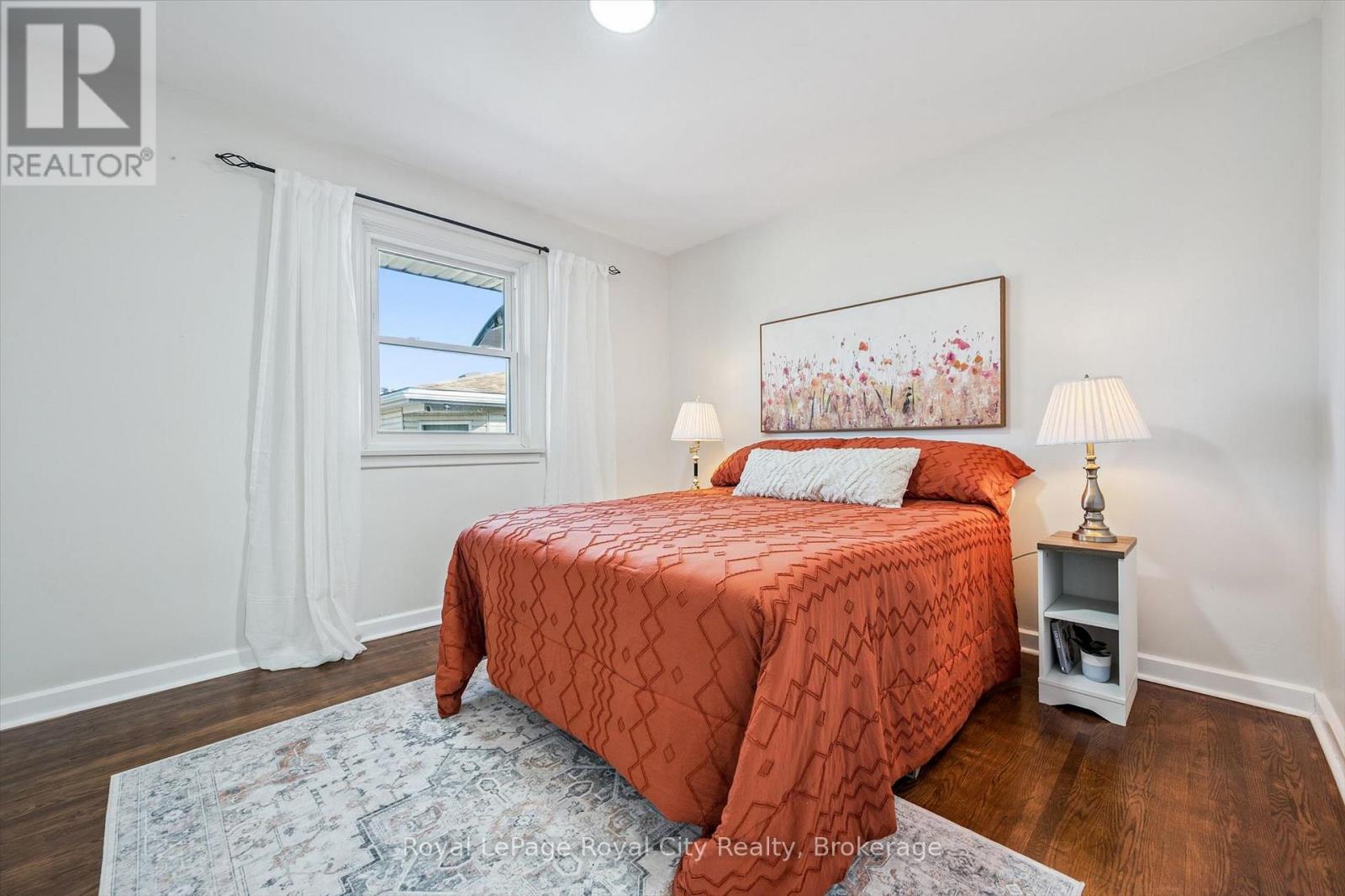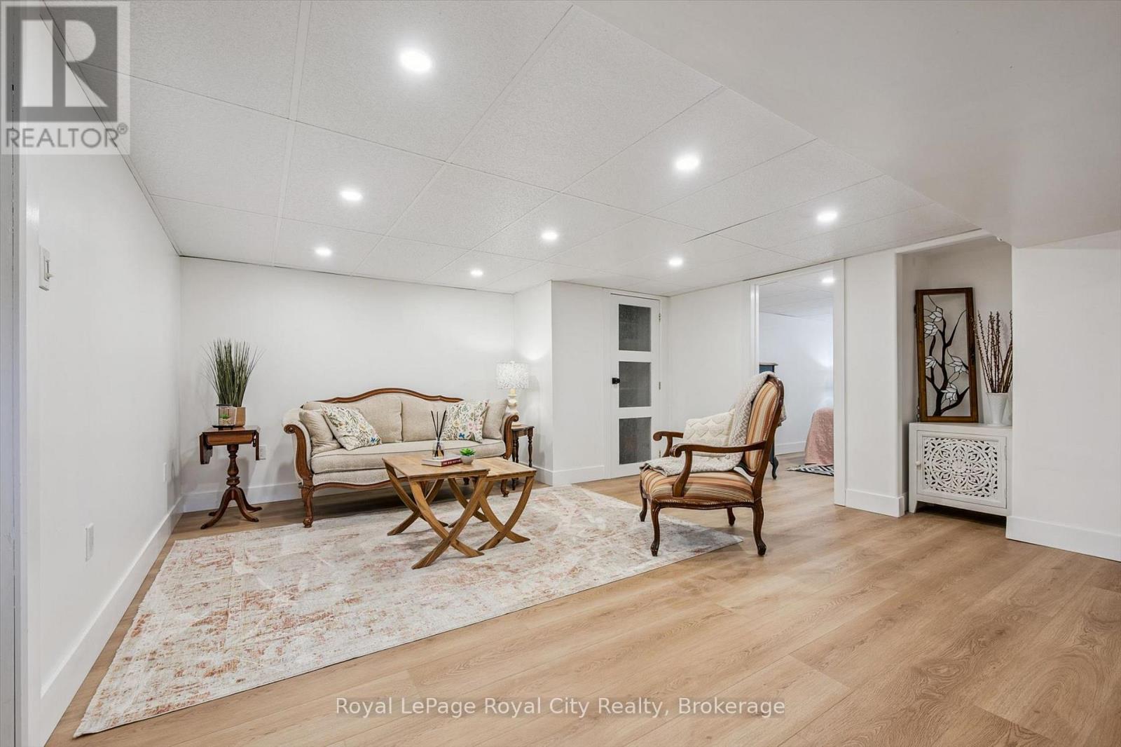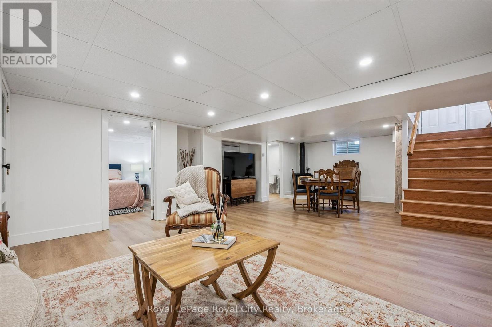 Welcome to this beautifully renovated bungalow, where modern updates meet comfortable family living in a prime location. Step inside to a bright and inviting living room and dining room, featuring elegant hardwood flooring and a large window that fills the space with natural light- perfect for both everyday living and entertaining.The functional kitchen offers ample cabinetry and workspace, making meal preparation a breeze. The main level is thoughtfully laid out with three spacious bedrooms and a well-appointed 4-piece bathroom, ideal for families or those seeking convenient one-level living. Downstairs, the fully finished basement expands your living space with stylish luxury vinyl flooring throughout. The cozy recreation room is anchored by a gas fireplace, creating the perfect setting for relaxing evenings. This level also includes two additional bedrooms and an updated 3-piece bathroom complete with a sleek glass shower- perfect for guests, extended family, or a home office setup. Outside, you will find a double wide concrete driveway, a private concrete patio, and a fully fenced backyard that is perfect for outdoor enjoyment. The detached workshop with hydro offers excellent potential for hobbies, storage, or creative use. Additional highlights include updated plumbing, a 200 Amp electrical service, and a furnace that is ~4 years old, providing added peace of mind. Located within walking distance to excellent schools, St. George's Park, downtown Guelph, Guelph General Hospital, and all essential amenities, this home truly combines style, function, and an unbeatable location. (id:64974)