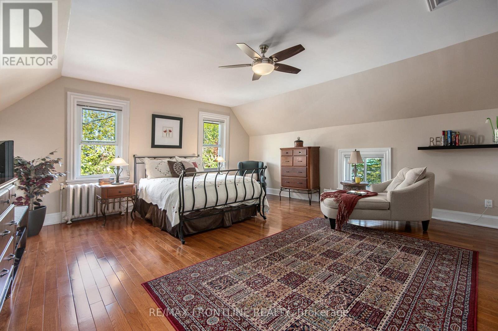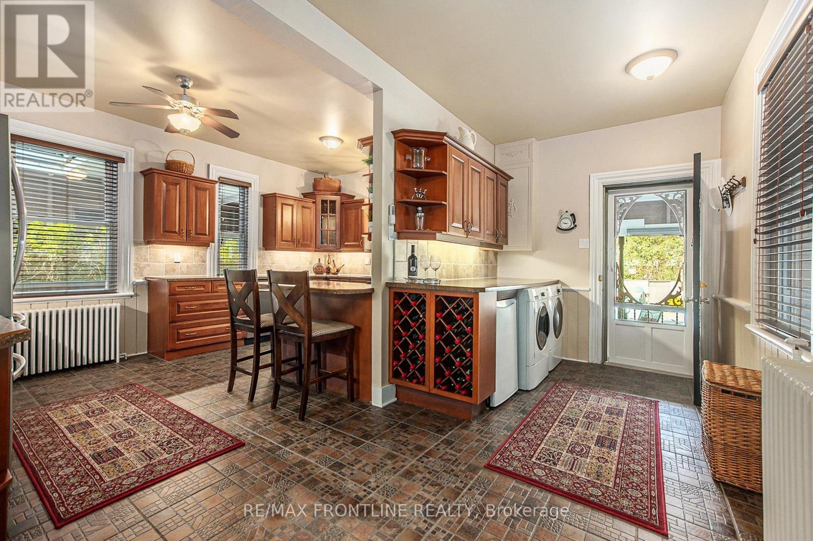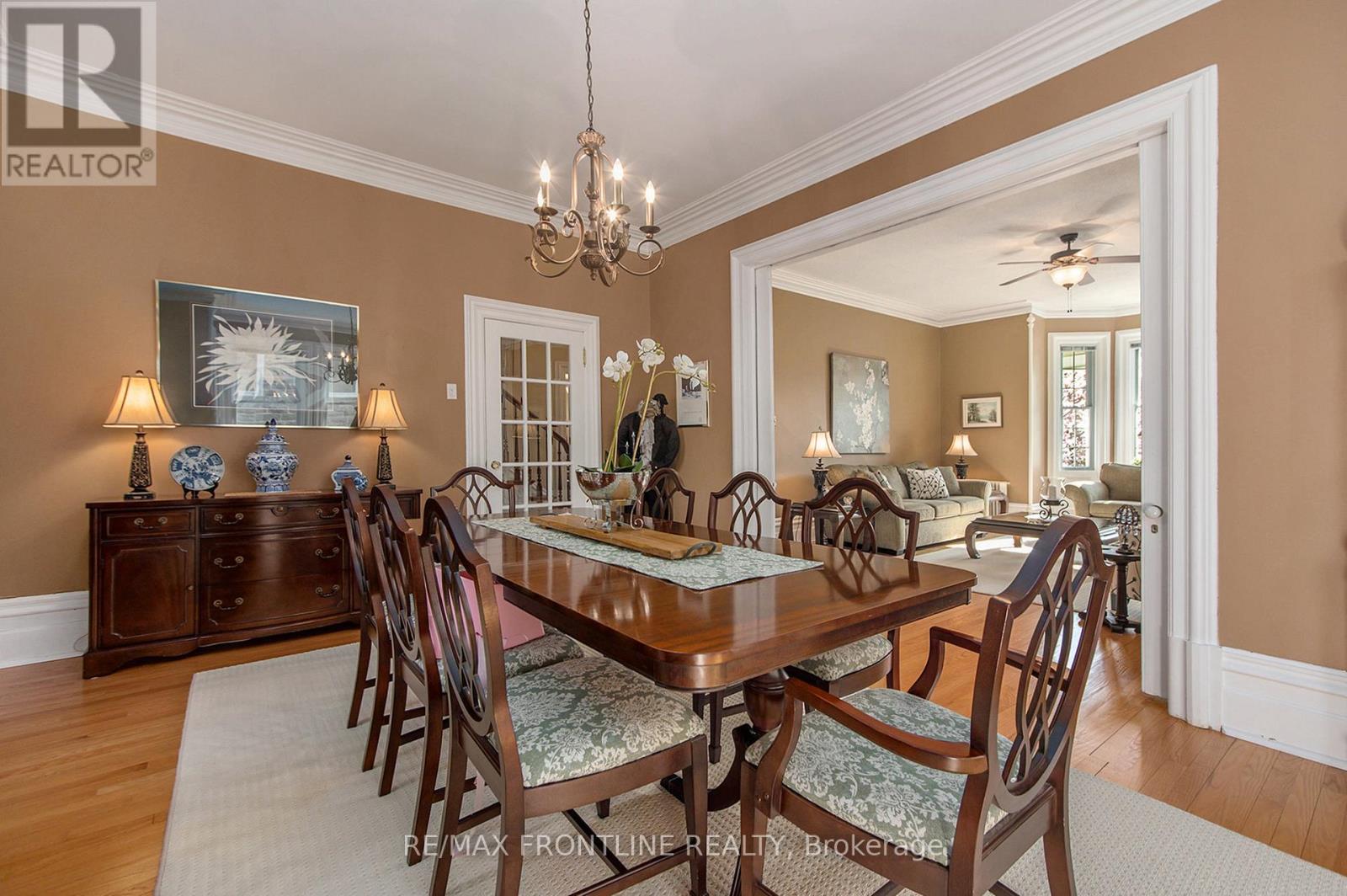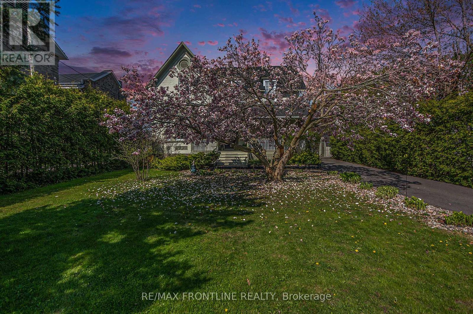 Victorian & First class. A rare find on about a 1/2 acre in town, a few minutes walk to the canal, all amenities and more. This home is set in the midst of award winning gardens with all entertainment essentials imaginable inside fenced and private grounds. This 4 bed, 2 bath home has been meticulously maintained and is also modernized for today's comforts. Enter the oversized foyer with formal living room, separate dining room, breakfast room, family room, laundry and powder room, all on main floor. From the formal dining room enjoy the 'Advent' season with lighting and choirs ringing out from St. John the Evangelist church. Kitchen is grand, a chef's delight. Cabinetry was custom designed with all S/S appliances, looks out to large verandah which opens to private grounds finished with interlock and a small area of lawn. Enjoy the beauty of nature or a symphony of bird songs while right at home. Welcome to a residence where Sir Wilfred Laurier (we are told) was once an invited guest. With new metal 1-car garage built 2025. (id:64974)