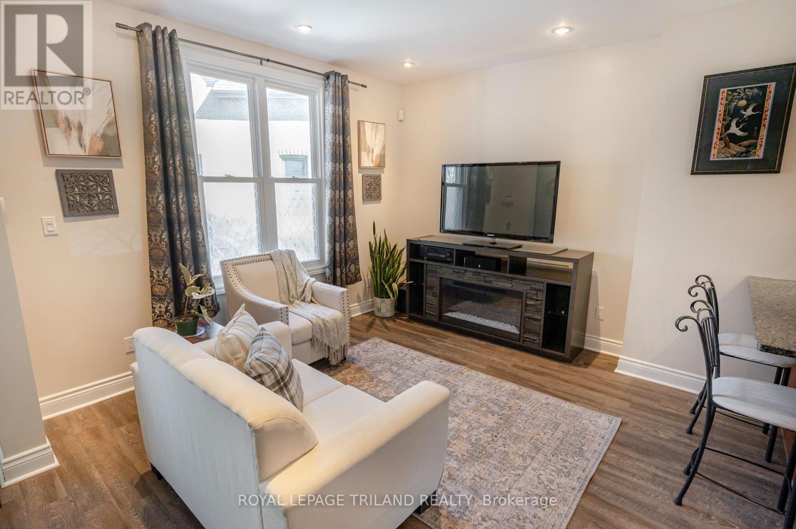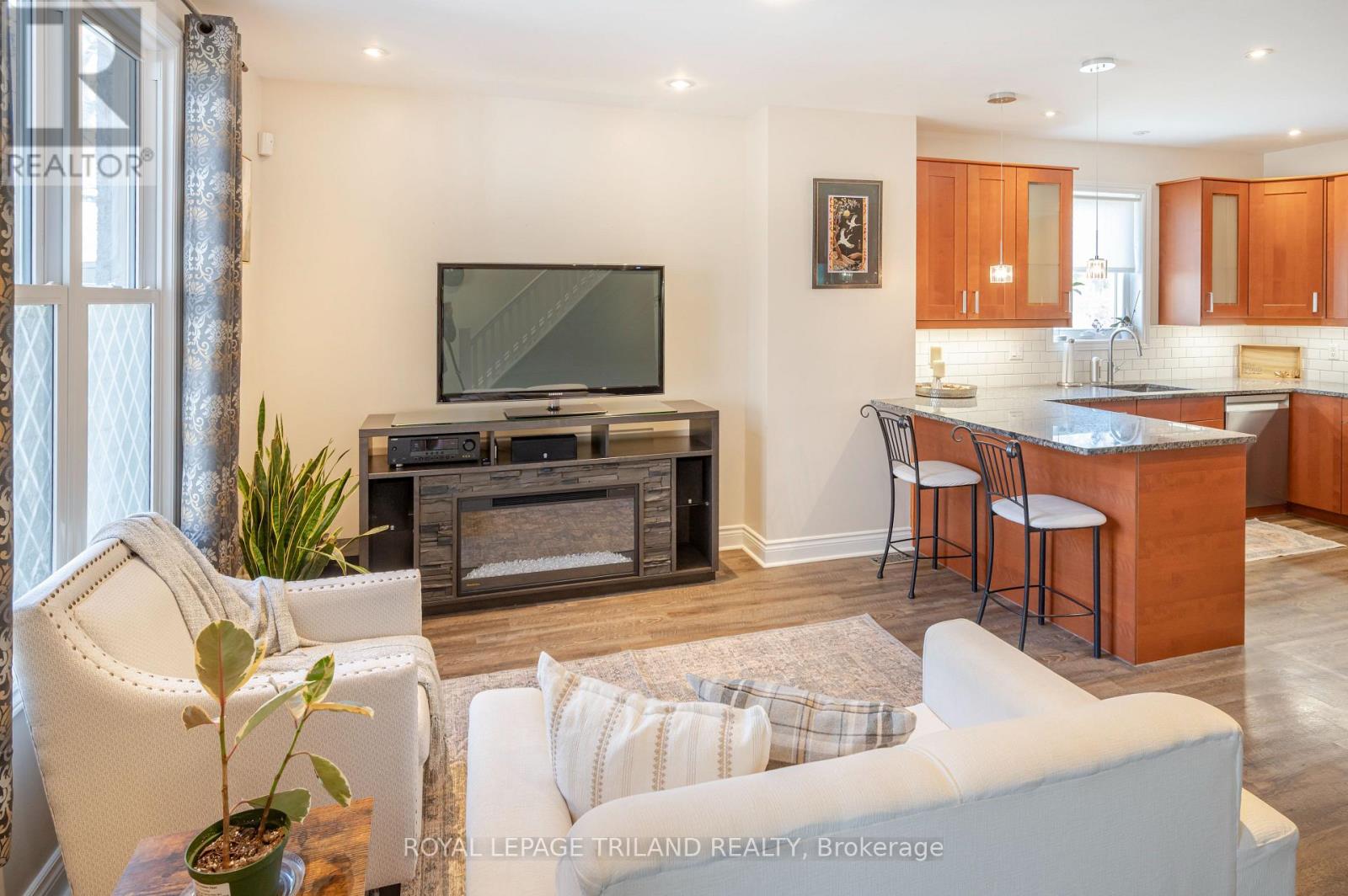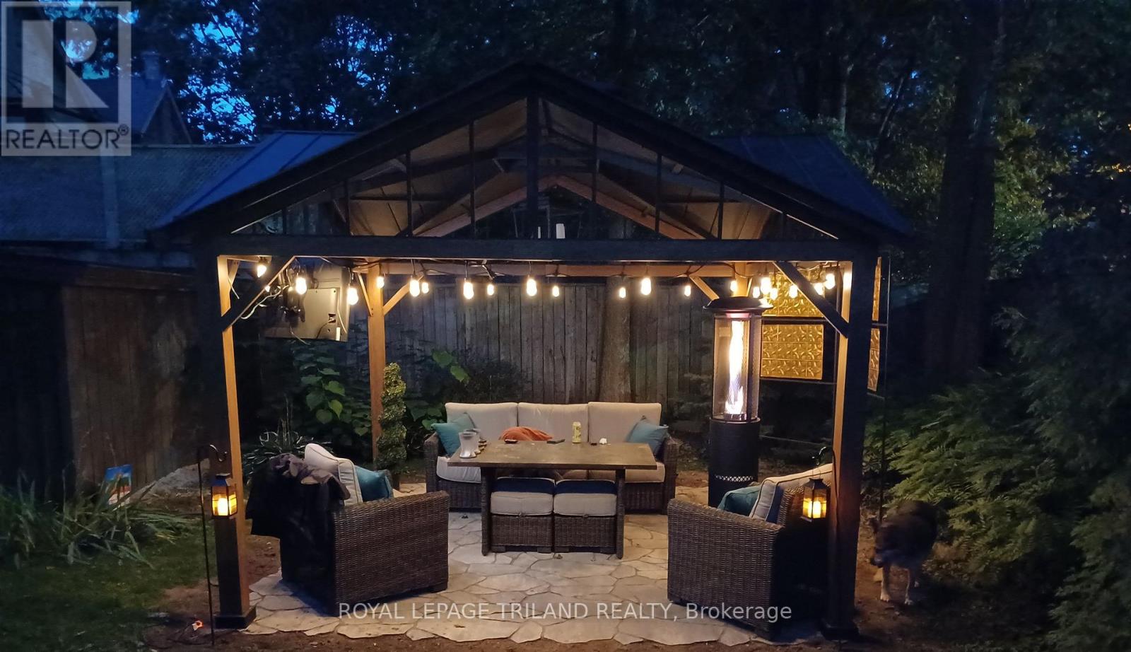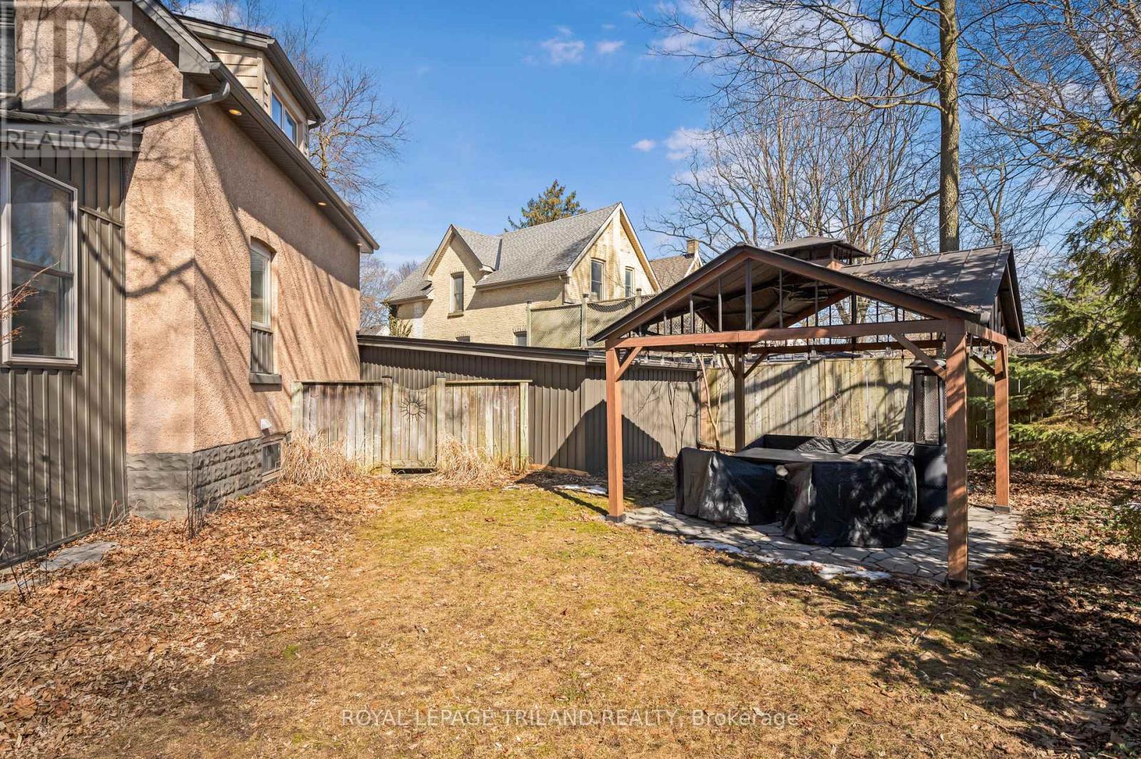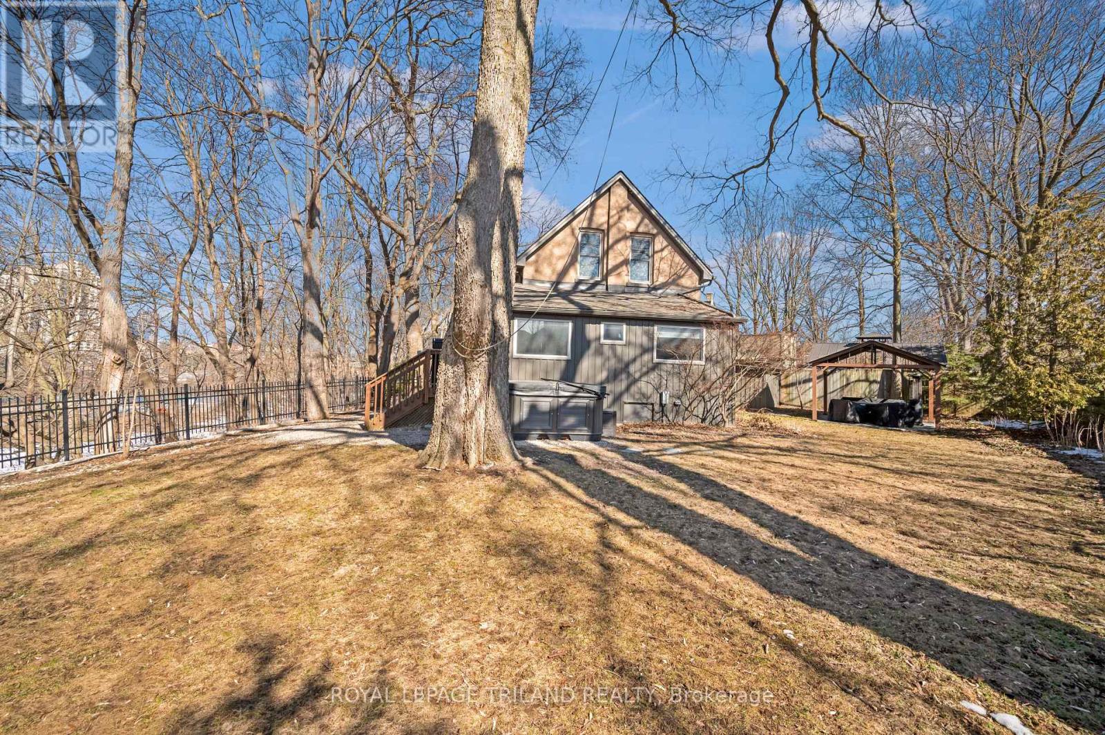 A truly one-of-a-kind Wortley Village home on a large wooded lot that feels like you're in the country, but at the end of a dead end street right next to Thames Park, just a few blocks from the Wortley business district, all of the amenities of Downtown London and with a 1.5 car garage! When you step into this meticulously loved and move-in-ready house, you're welcomed with a bright, open-concept layout with a chef's kitchen, featuring sprawling granite countertops with breakfast bar seating, plenty of cabinets, and It's flooded with natural light by day and a ceiling full of pot lighting by night. Perfect for entertaining, the kitchen overlooks the front living area, and the flow continues into a stunning rear sunroom with high ceilings, beautiful exposed brick that adds a layer of historic character to the spacious and bright living space that leads to a beautifully updated bathroom. Upstairs, the primary bedroom that fits a king-size bed, has two large windows and a custom closet for two. The upper bathroom is exquisite, perfect for sipping wine in a tub, and the second bedroom is big enough to have a small workspace in it. There is no shortage of storage thanks to a spacious basement and a 1.5 car deep garage. A highlight "wow factor" for sure is the backyard that is thick with mature trees and perennial gardens that you'll feel like you're camping in a forest, despite being just minutes from the action. Whether you're hosting friends around the fire pit on a starry night, unwinding in the hot tub, or enjoying a morning coffee in the super-cute gazebo, this zen oasis provides unparalleled privacy. A very short walk to the Wortley business district, Canada Life Place, downtown festivals and Thames Park right next door with three lit tennis courts, a community garden, large playground, and soon to come pickleball courts, the lifestyle here is unmatched. This is a very rare opportunity to own a piece of the city that feels worlds away. (id:64974)