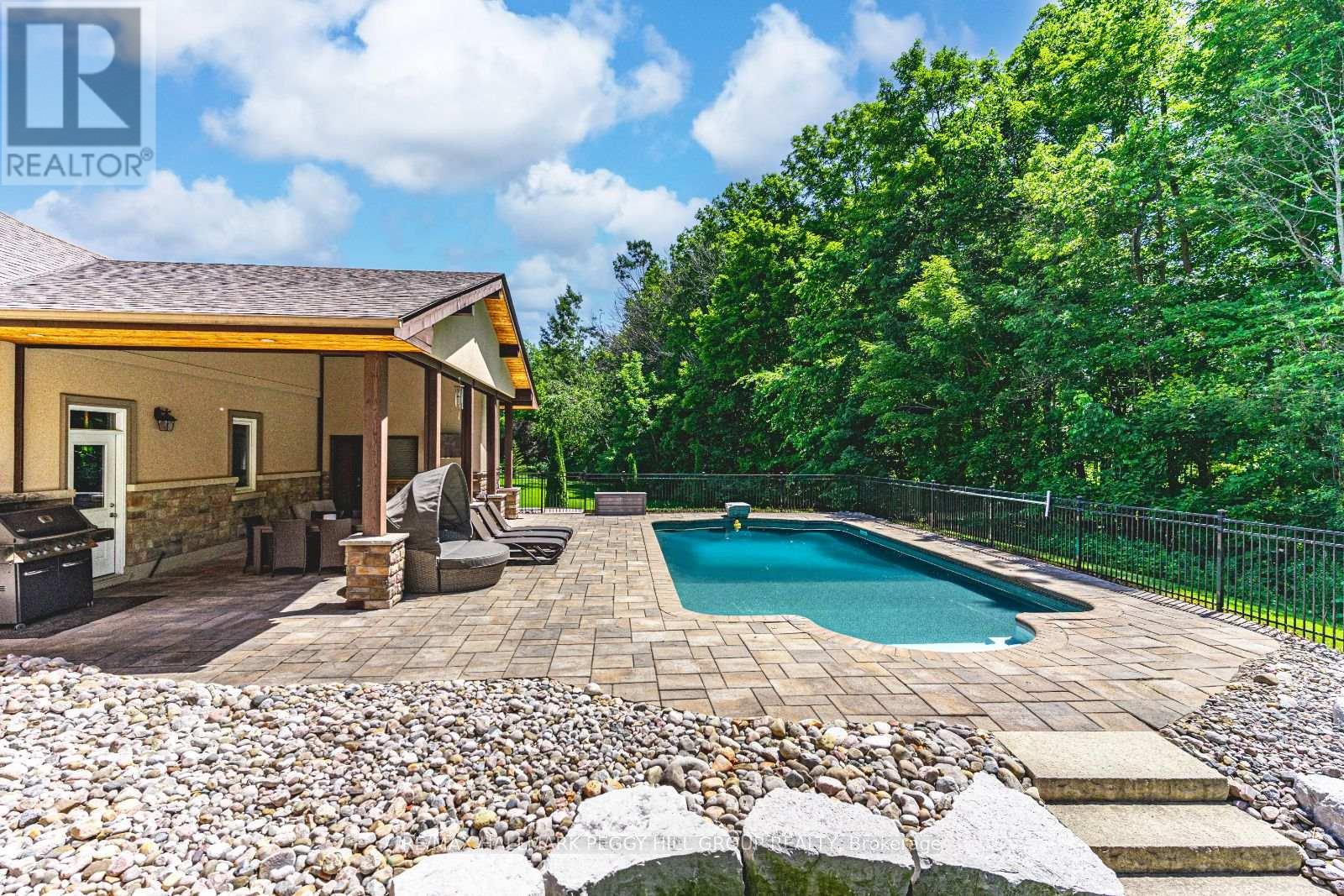 PRESTIGIOUS 2 + ACRE ESTATE WITH OVER 5,200 SQ FT, RESORT-STYLE BACKYARD & A PRIME CUL-DE-SAC SETTING! This extraordinary residence is situated in the highly coveted Wasaga Sands Estates on a private 2.12-acre estate lot with no homes directly behind, backing onto McIntyre Creek and the former Wasaga Sands Golf Course. Nestled at the end of a quiet cul-de-sac, it offers a peaceful setting just minutes from shopping, dining and daily essentials. Curb appeal presents a stone and stucco exterior, a three-car garage, manicured landscaping and a commanding architectural presence. Outdoor living is exceptional, with a heated 18 x 36 ft saltwater pool, a stone interlock patio, a pool house with a bathroom and outdoor shower, and a covered entertaining area. A composite back deck with a hot tub overlooks a private treed yard, while a fire pit, invisible pet fence, and garden shed add further charm. Over 5,200 sq ft of beautifully finished living space includes a gourmet kitchen showcasing white cabinetry, granite countertops, a centre island with a second sink, a pantry, a breakfast bar and stainless steel appliances. The open-concept dining room leads to the great room boasting expansive windows, a gas fireplace and a soaring vaulted ceiling. The main floor primary bedroom features dual walk-in closets, a walkout to the backyard and a spa-like ensuite with a soaker tub and glass shower. An elegant office with built-ins and a vaulted shiplap ceiling, a laundry room with cabinets and sink, and a mudroom with built-in bench, hooks and storage enhance main floor functionality. Upstairs, a sitting area overlooks the great room and connects to three generously sized bedrooms and a well-appointed bathroom. The finished basement, accessible via a separate entrance, adds even more space with a large rec room, two bedrooms, bonus room, and full bathroom. Designed for refined living in a tranquil setting, this remarkable #HomeToStay brings together space, comfort and elegance! (id:64974)