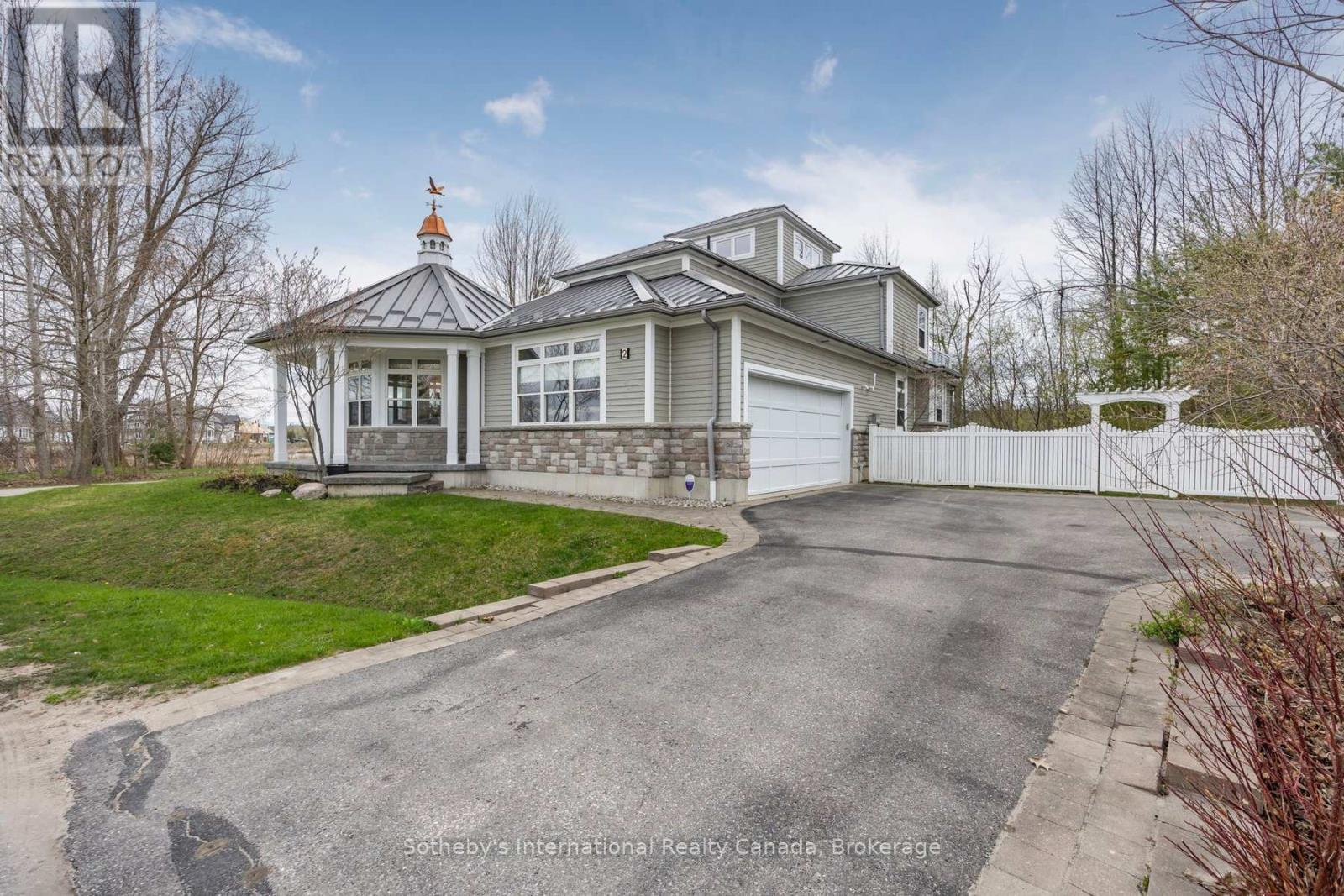 With its cupola, refined rooflines, and inviting front porch, the home makes a striking first impression.. Tucked at the end of a quiet cul-de-sac in a gated waterfront community in Port McNicoll, this Cape Cod-inspired home offers over 3,000 sq ft of light-filled living space. Inside, the layout flows beautifully from the welcoming foyer to a bright, hexagon-shaped dining room overlooking the porch, an ideal space to host dinners or sip your morning coffee. Vaulted ceilings and oversized windows create a sense of openness in the main living area, where a gas fireplace and walkout to the screened-in porch set the tone for relaxed comfort. The main-floor primary suite includes a walk-in closet and 4-piece ensuite, while a nearby home office offers a quiet and inspiring place to work from home. The centrally located kitchen is designed for ease and connection, opening into the heart of the house. Upstairs, two bedrooms share a full bath. One of the bedrooms connects to a balcony, while the second enjoys its own private balcony, perfect for morning sun or quiet moments with a book. Built-in floor-to-ceiling shelving in the hallway offers the ideal space for a personal library or curated display. A loft overlooks the living room and opens to a shared balcony, blending style with function. At the top, a lookout sitting room with transom windows offers treetop views and a peaceful space for reading, reflection, or stargazing. The basement provides ample storage, while the large double garage adds practical convenience. Outdoors, enjoy evenings around the stone fire pit or listen to birdsong from the comfort of your screened-in porch. A public walking trail runs along the northern side of the property. With multiple marinas just minutes away, this property is perfectly situated for boaters seeking quick access to launch points on Georgian Bay. Just a short drive to Midland for shopping, dining, and essential amenities, this home offers a refined four-season lifestyle. (id:64974)