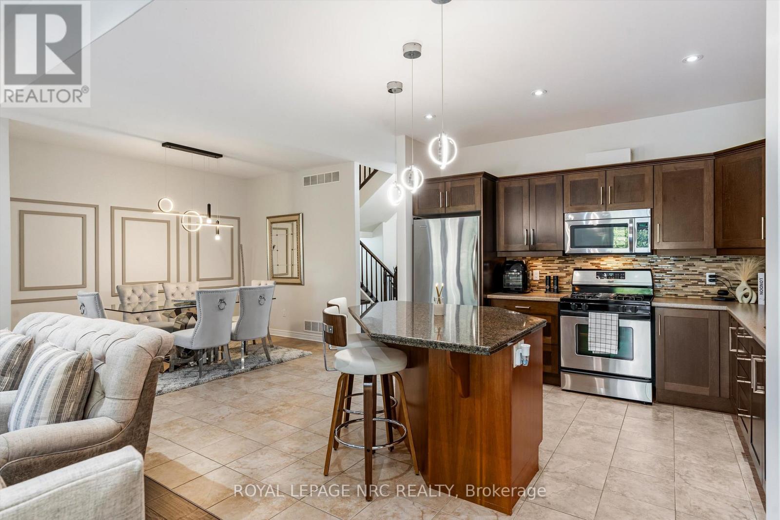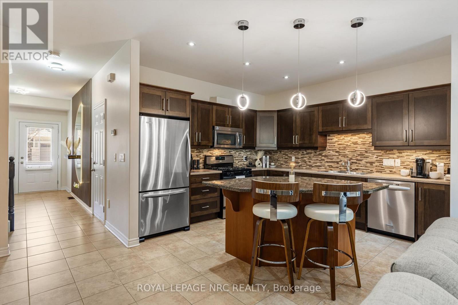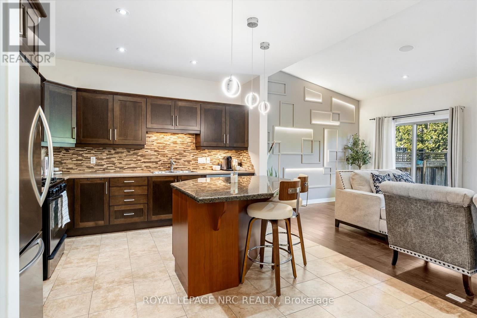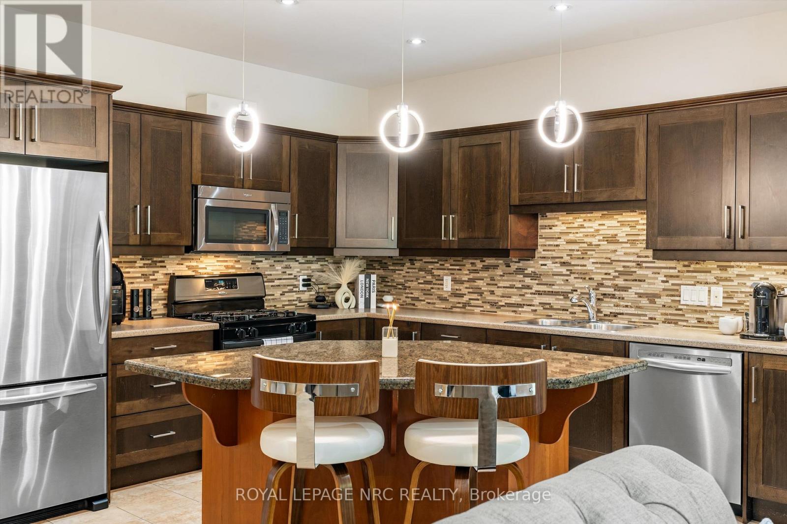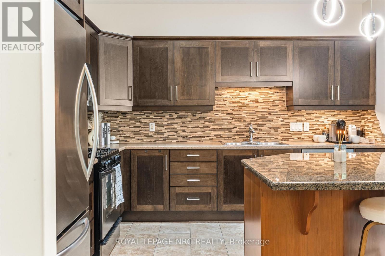 Welcome to Victory Garden in the heart of Fonthill. This home is ideally located within walking distance to restaurants, shopping, the library, and the Farmer's Market, making it easy to enjoy everything the area has to offer. The neighbourhood is well cared for, and it shows as soon as you arrive. Inside, the home has been thoughtfully laid out and well-maintained. You're greeted by a spacious foyer with a convenient main floor powder room. The kitchen offers plenty of storage, a stylish backsplash, under-cabinet lighting, and a large island, all open to the dining area and great room. The great room spans the full width of the home and features pot lights, built-in speakers, and a gas fireplace, creating a comfortable space for everyday living. Upstairs, you'll find three bedrooms, two full bathrooms, and the added convenience of second-floor laundry. The primary bedroom includes a walk-in closet and a private ensuite with a soaker tub. Recent updates include: luxury vinyl plank flooring on second level (2024), illuminated accent walls (2024), and a new garage door (2019). Out back, enjoy a private deck and a tree-lined yard. As part of condo living, lawn maintenance is handled for you, making it easy to enjoy the space without the extra work. This is more than a home, it's a lifestyle you won't want to miss. (id:64974)