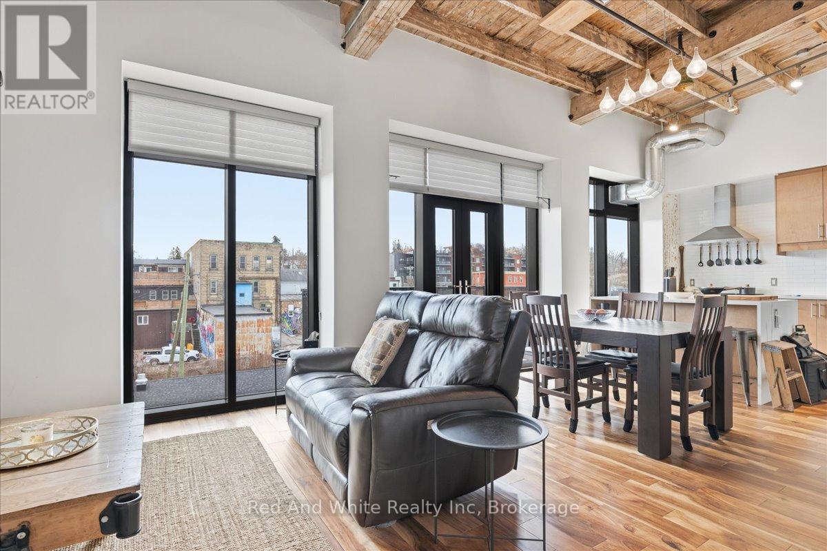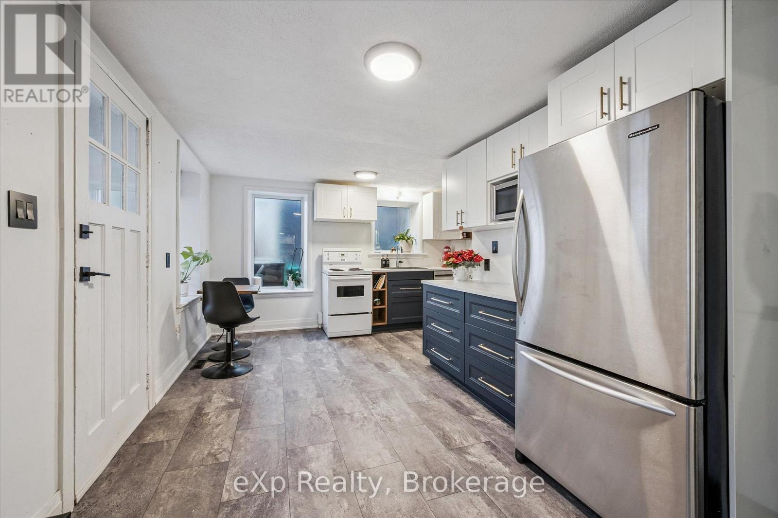 This beautiful century home w/loft is priced competitively to many condos, but comes with the perks of a single-family home including a private backyard and dry basement storage. The kitchen is re-modeled with newer cabinetry, counters, sink, and flooring. The living room has vintage pine flooring with a modern black accent wall and built-in fireplace w/mantle. Upstairs you'll find more pine flooring in the cozy bedroom and den (which can easily be transformed into another bedroom). The bathroom has been updated with a walk-in tiled shower and heated flooring! Downstairs provides an adequate laundry area (washer/dryer) and ample storage. Step into the private fully-fenced backyard with poured concrete sitting area, covered roof, and turf grass for minimal maintenance. Just a stroll away from downtown picturesque Hespeler with easy access to the 401, central to Cambridge, Guelph and Kitchener. All electrical updated, gas furnace and newer A/C, Ecobee, water softener (2024), water heater (rented - 2024), kitchen flooring (2025). (id:64974)