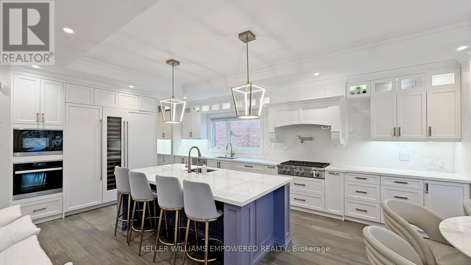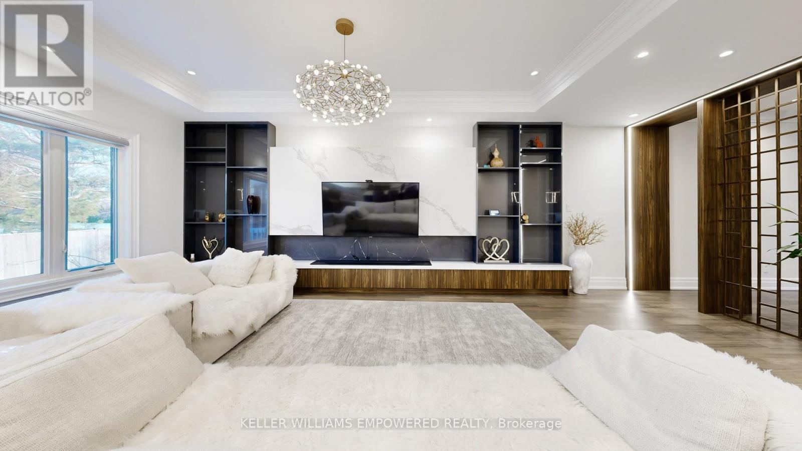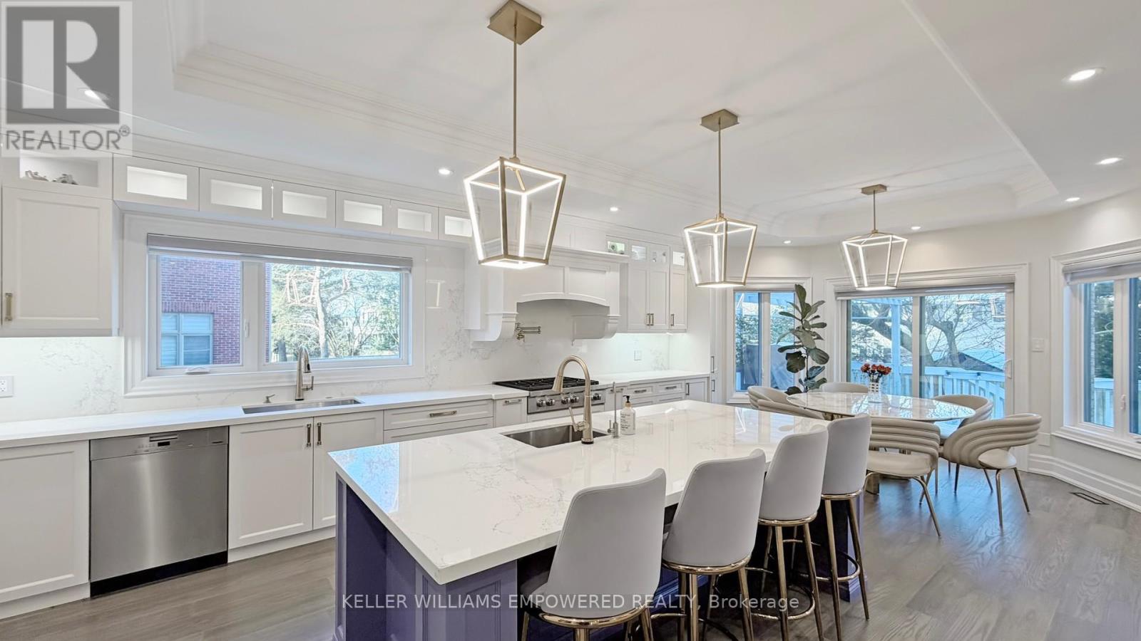 Exceptional fully renovated luxury home in prestigious Banbury-Don Mills on a prime 62 x 140 ft corner lot. Offering over 7,000 sq. ft. of finished living space, this grand detached 2-storey residence was renovated top to bottom in 2022 and features 5 bedrooms, 7 full bathrooms, an open-to-above foyer, elegant spiral staircase, expansive principal rooms, large windows, and skylights. The gourmet eat-in kitchen includes a pantry, breakfast area with walk-out to deck that leads to the side garden, and premium appliances including Wolf, Sub-Zero, Vent-A-Hood, and Miele. Main floor office/library with French doors and built-in shelves. Luxurious primary retreat with sitting area, custom dressing room, and spa-like 5-piece ensuite. Fully finished basement with home theatre, gym, sauna, second kitchen, and walk-up. Includes 2 laundry areas, 2 furnaces, 2 A/Cs, 3-car garage, circular driveway, and parking for up to 15 cars. Close to Edwards Gardens, Granite Club, and top private schools including Crescent, Crestwood, and TFS. (id:64974)