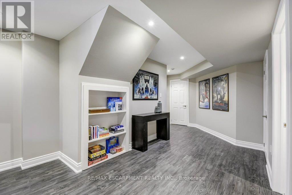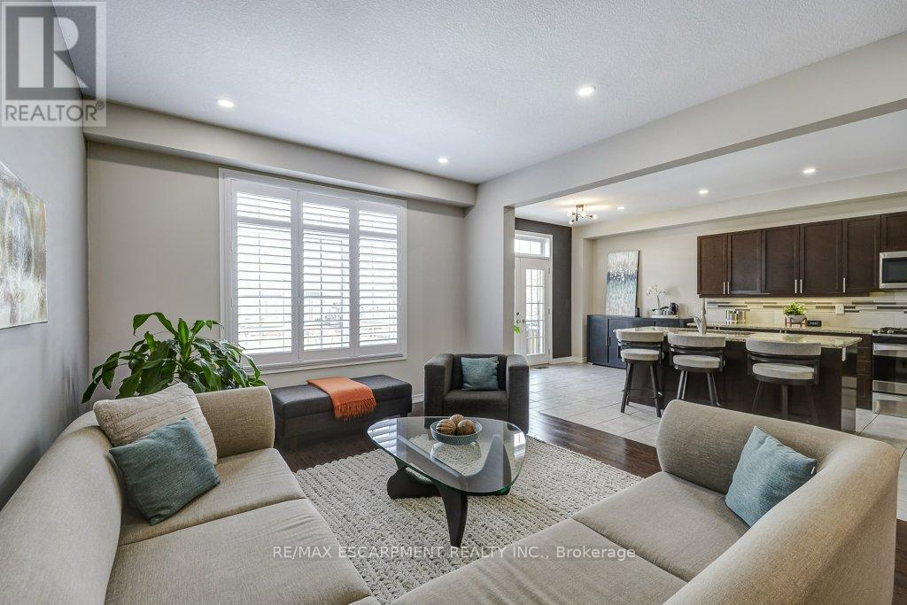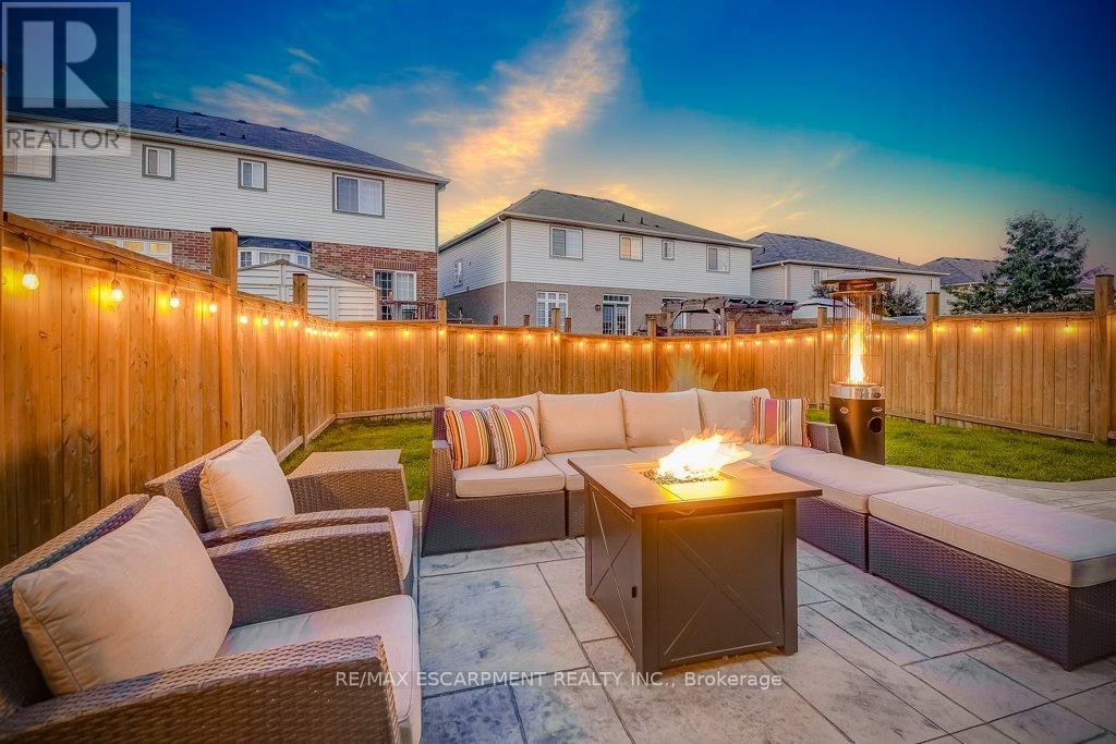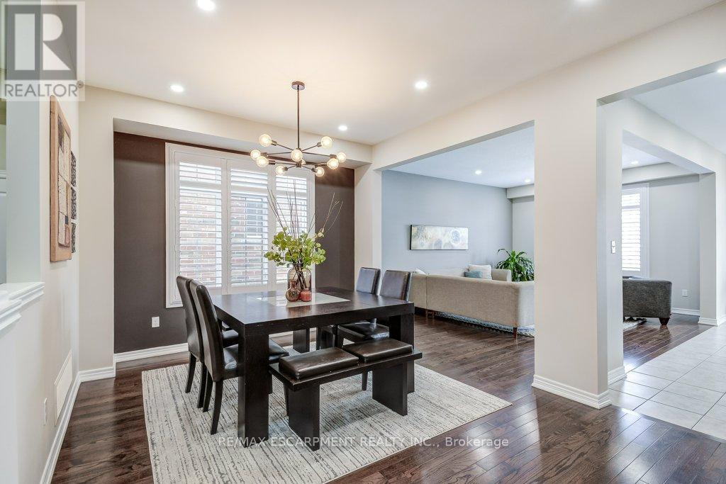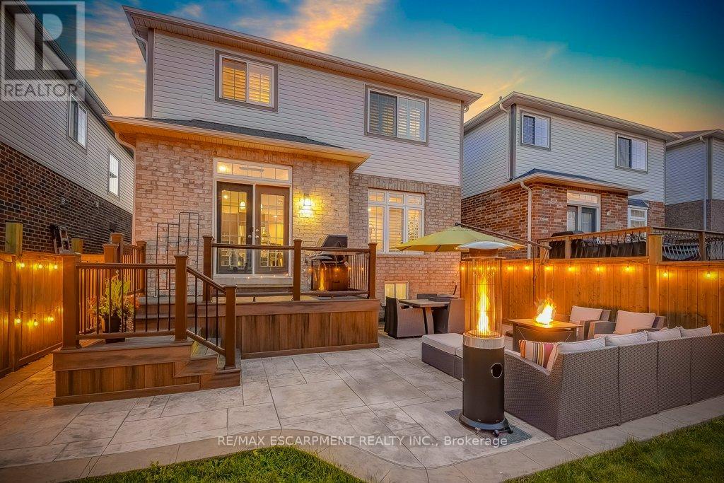Turnkey detached home on a rare cul-de-sac. Tucked away on a quiet, child-friendly court, this gorgeous, detached home is in one of the lucky few newer subdivisions with a park, playground and basketball court. Set on a pool-size lot, the backyard features a maintenance-free composite deck, a stunning stamped concrete patio with space for both dining and lounging, plus plenty of grassy area for kids and pets to play. Inside, the bright, carpet-free layouts how cases upgraded oversized windows with transoms and California shutters throughout. The open-concept main floor offers a spacious dining room, great room and eat-in kitchen with direct backyard access, ideal for everyday living and entertaining. Escape to the oversized Primary Suite with private ensuite, double sinks, large shower and walk-in closet. The professionally finished lower level makes an ideal teenage retreat, featuring a 5th bedroom, spacious family room, gym area, study, and full bathroom. Close to schools, YMCA, trails, golf courses, everyday amenities, and offering quick access to Aldershot GO, Hwy 6, 403, 407 and the QEW. Truly a move-in ready home in a family-friendly neighbourhood. (id:64974)