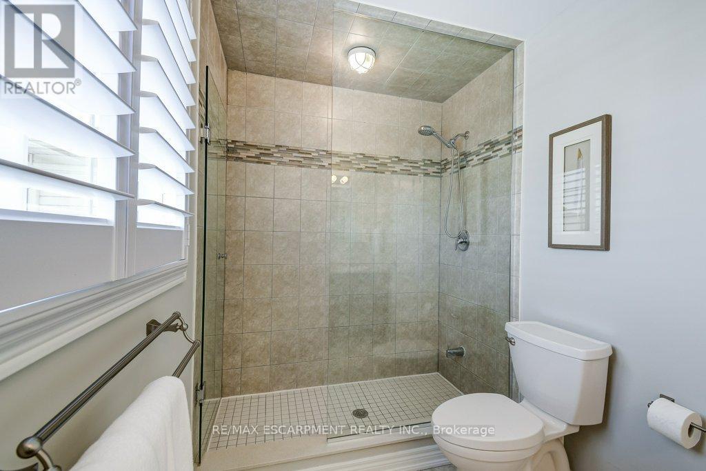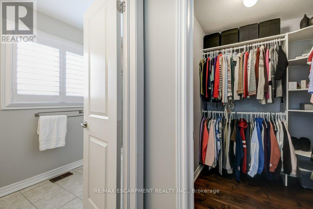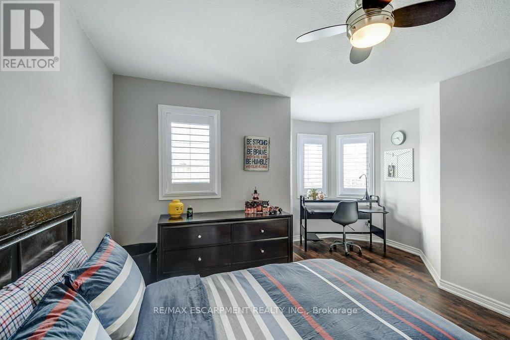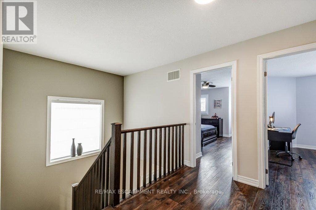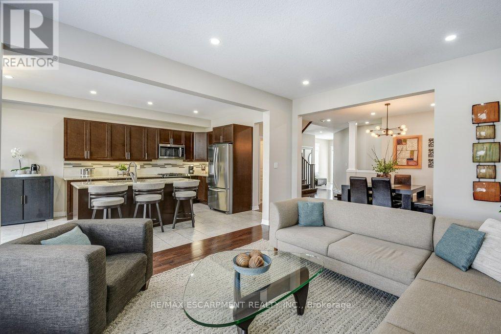Turnkey detached home on a rare cul-de-sac. Tucked away on a quiet, child-friendly court, this gorgeous, detached home is in one of the lucky few newer subdivisions with a park, playground and basketball court. Set on a pool-size lot, the backyard features a maintenance-free composite deck, a stunning stamped concrete patio with space for both dining and lounging, plus plenty of grassy area for kids and pets to play. Inside, the bright, carpet-free layouts how cases upgraded oversized windows with transoms and California shutters throughout. The open-concept main floor offers a spacious dining room, great room and eat-in kitchen with direct backyard access, ideal for everyday living and entertaining. Escape to the oversized Primary Suite with private ensuite, double sinks, large shower and walk-in closet. The professionally finished lower level makes an ideal teenage retreat, featuring a 5th bedroom, spacious family room, gym area, study, and full bathroom. Close to schools, YMCA, trails, golf courses, everyday amenities, and offering quick access to Aldershot GO, Hwy 6, 403, 407 and the QEW. Truly a move-in ready home in a family-friendly neighbourhood. (id:64974)