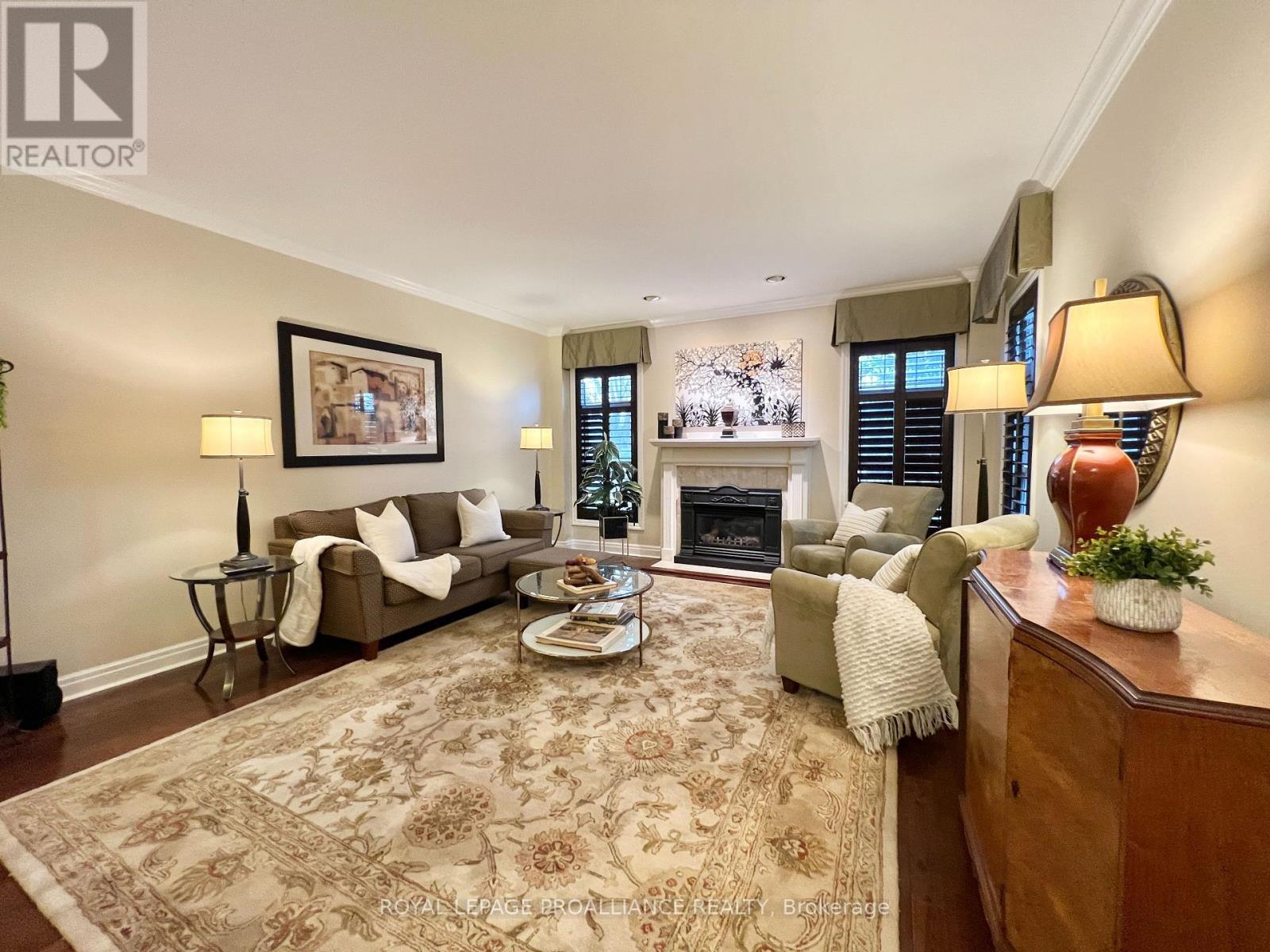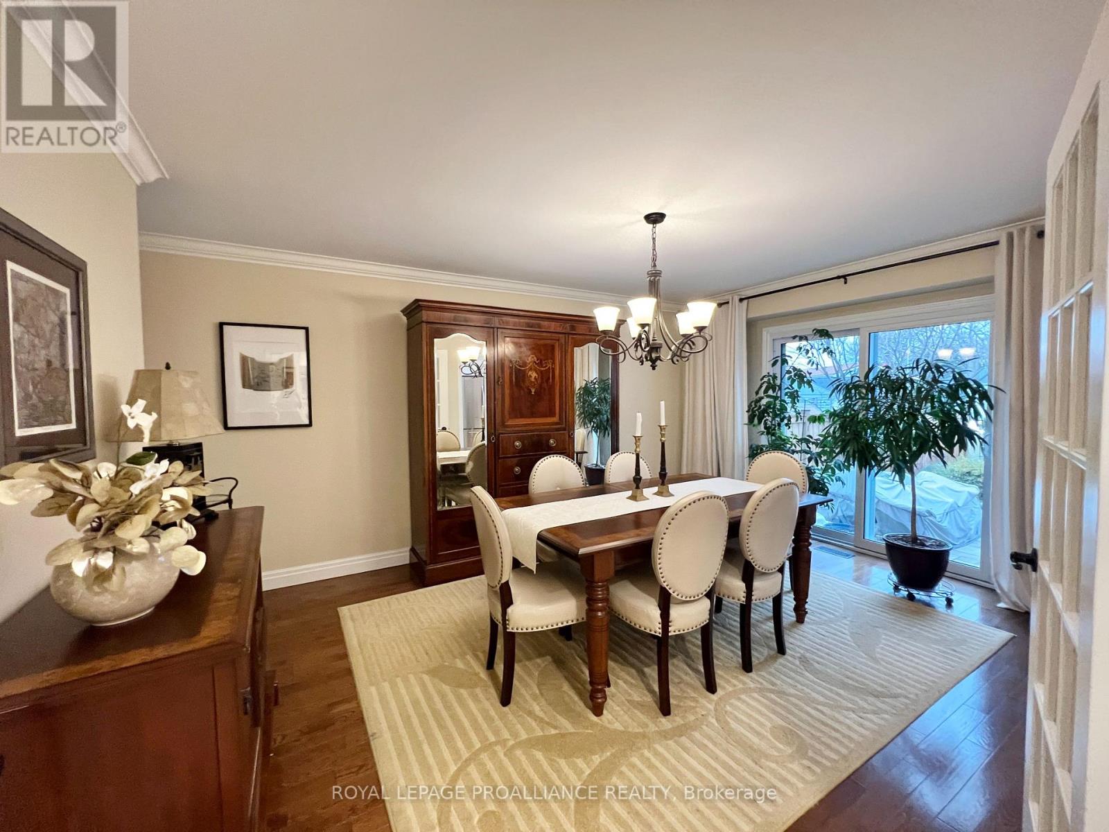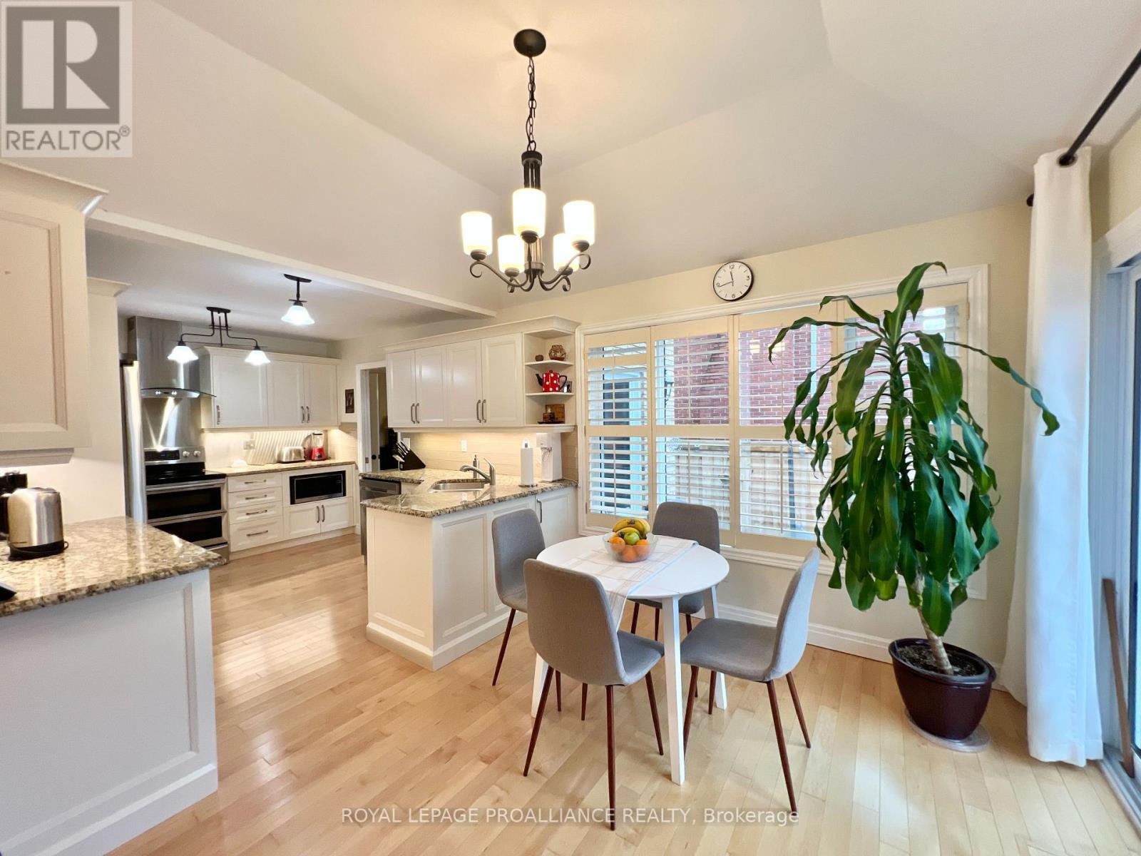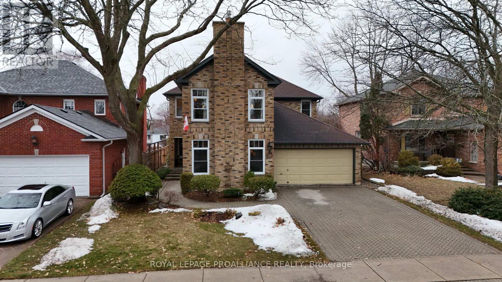 Putting the Georgian in Georgian Crt, this stately brick home showcases unique yet classic architecture. Offering over 2,500 sq ft plus a finished basement, the home includes 4 bedrooms and 4 bathrooms, with large, light-filled rooms throughout. Located on a quiet, tree-lined cul-de-sac of just 15 homes in one of Belleville's most desirable east end neighbourhoods, this home is within walking distance to groceries, the hospital and waterfront trails. Pride of ownership is evident throughout, with thoughtful efficiency upgrades including newer windows and doors, a furnace and heat pump installed in 2023, and soffit, fascia and eavestrough with leaf guards all updated within the last five years. Step inside to a welcoming foyer leading to a sunken formal living room and an elegant dining room, each finished with rich solid oak flooring. The kitchen offers an ideal work triangle and opens seamlessly to the breakfast area and family room, creating a warm gathering space. Gas fireplaces in both the living and family rooms add comfort and charm. The main level is completed with a convenient laundry room and 2-piece bath. Six-foot patio doors from the dining and family rooms lead directly to the patio and backyard. Upstairs, the primary suite is generously sized with room for a king bed and features his and hers walk-in closets. The ensuite includes a double shower with dual rain heads, stylish soaker tub, heated towel bar and double vanity. Three additional bedrooms-one currently used as a home office-are all spacious enough for queen beds and are served by a bright family bathroom. The finished basement offers a large recreation area with broadloom throughout-ideal for a bedroom, office, music room, or games area with a pool or ping-pong table. A bright workshop adds extra versatility. Landscaped front and rear gardens with an in-ground sprinkler system lead to a private patio with separate lounging and dining areas, plus a natural gas hookup for grilling. (id:64974)
