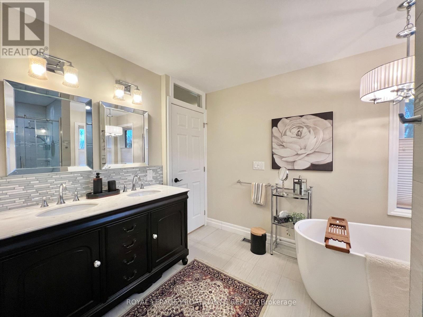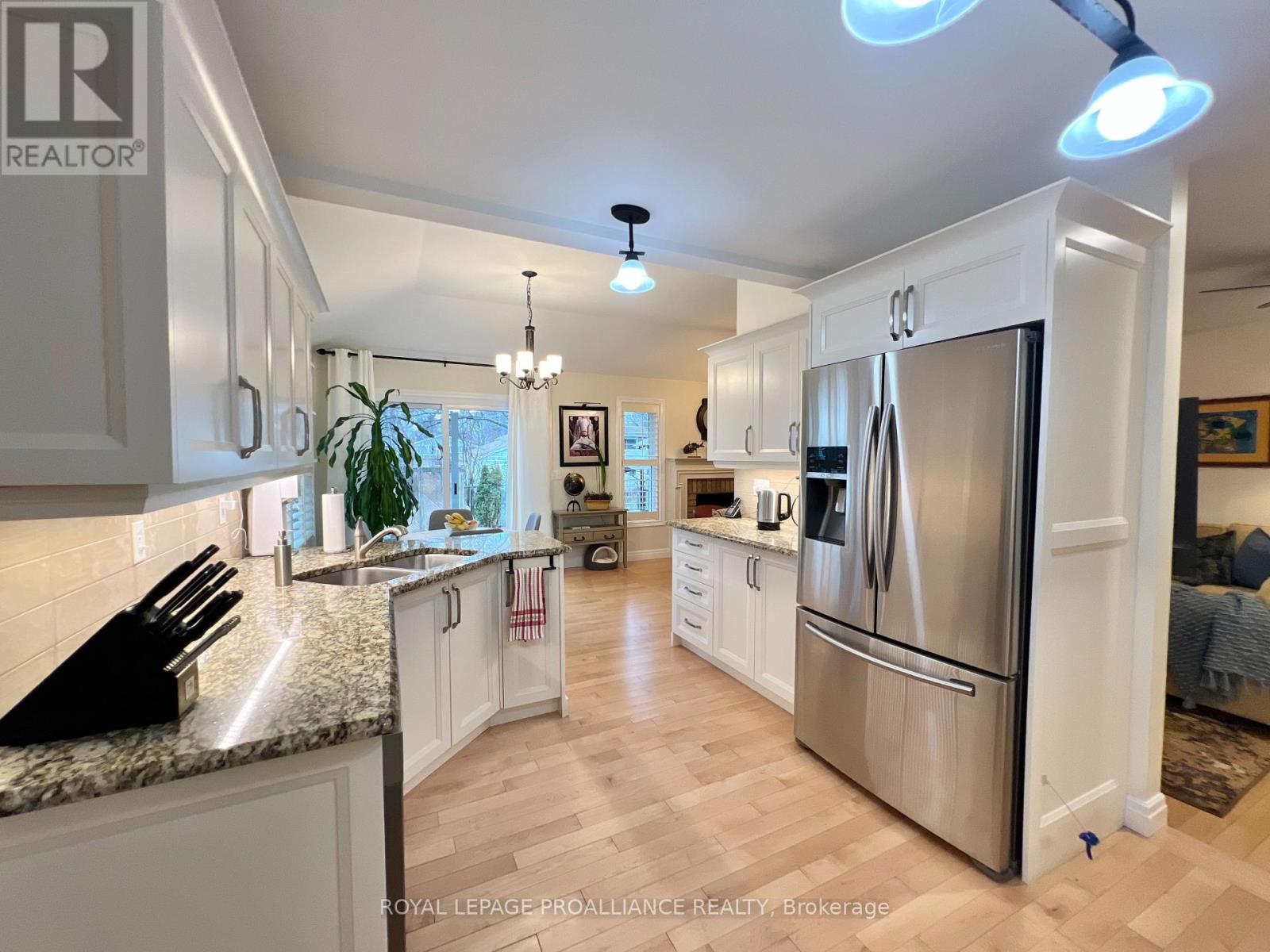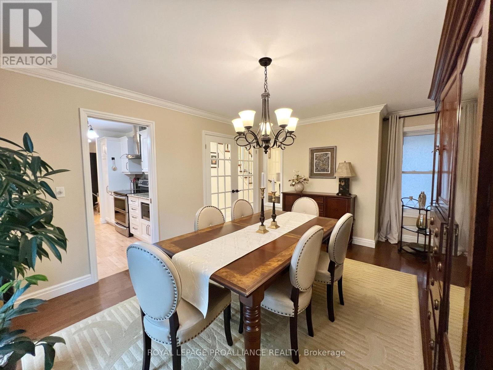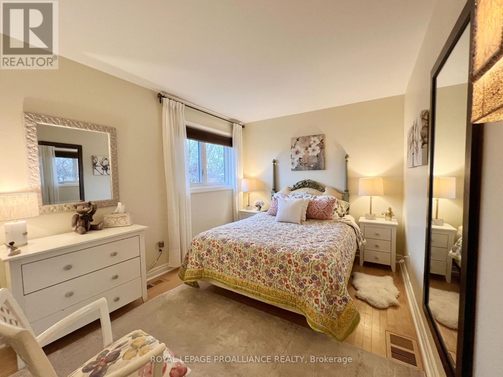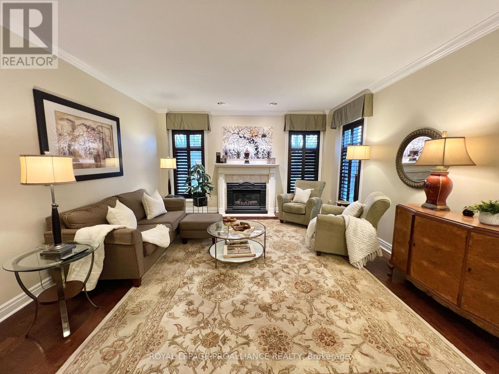 Putting the Georgian in Georgian Crt, this stately brick home showcases unique yet classic architecture. Offering over 2,500 sq ft plus a finished basement, the home includes 4 bedrooms and 4 bathrooms, with large, light-filled rooms throughout. Located on a quiet, tree-lined cul-de-sac of just 15 homes in one of Belleville's most desirable east end neighbourhoods, this home is within walking distance to groceries, the hospital and waterfront trails. Pride of ownership is evident throughout, with thoughtful efficiency upgrades including newer windows and doors, a furnace and heat pump installed in 2023, and soffit, fascia and eavestrough with leaf guards all updated within the last five years. Step inside to a welcoming foyer leading to a sunken formal living room and an elegant dining room, each finished with rich solid oak flooring. The kitchen offers an ideal work triangle and opens seamlessly to the breakfast area and family room, creating a warm gathering space. Gas fireplaces in both the living and family rooms add comfort and charm. The main level is completed with a convenient laundry room and 2-piece bath. Six-foot patio doors from the dining and family rooms lead directly to the patio and backyard. Upstairs, the primary suite is generously sized with room for a king bed and features his and hers walk-in closets. The ensuite includes a double shower with dual rain heads, stylish soaker tub, heated towel bar and double vanity. Three additional bedrooms-one currently used as a home office-are all spacious enough for queen beds and are served by a bright family bathroom. The finished basement offers a large recreation area with broadloom throughout-ideal for a bedroom, office, music room, or games area with a pool or ping-pong table. A bright workshop adds extra versatility. Landscaped front and rear gardens with an in-ground sprinkler system lead to a private patio with separate lounging and dining areas, plus a natural gas hookup for grilling. (id:64974)