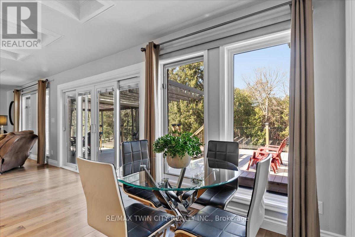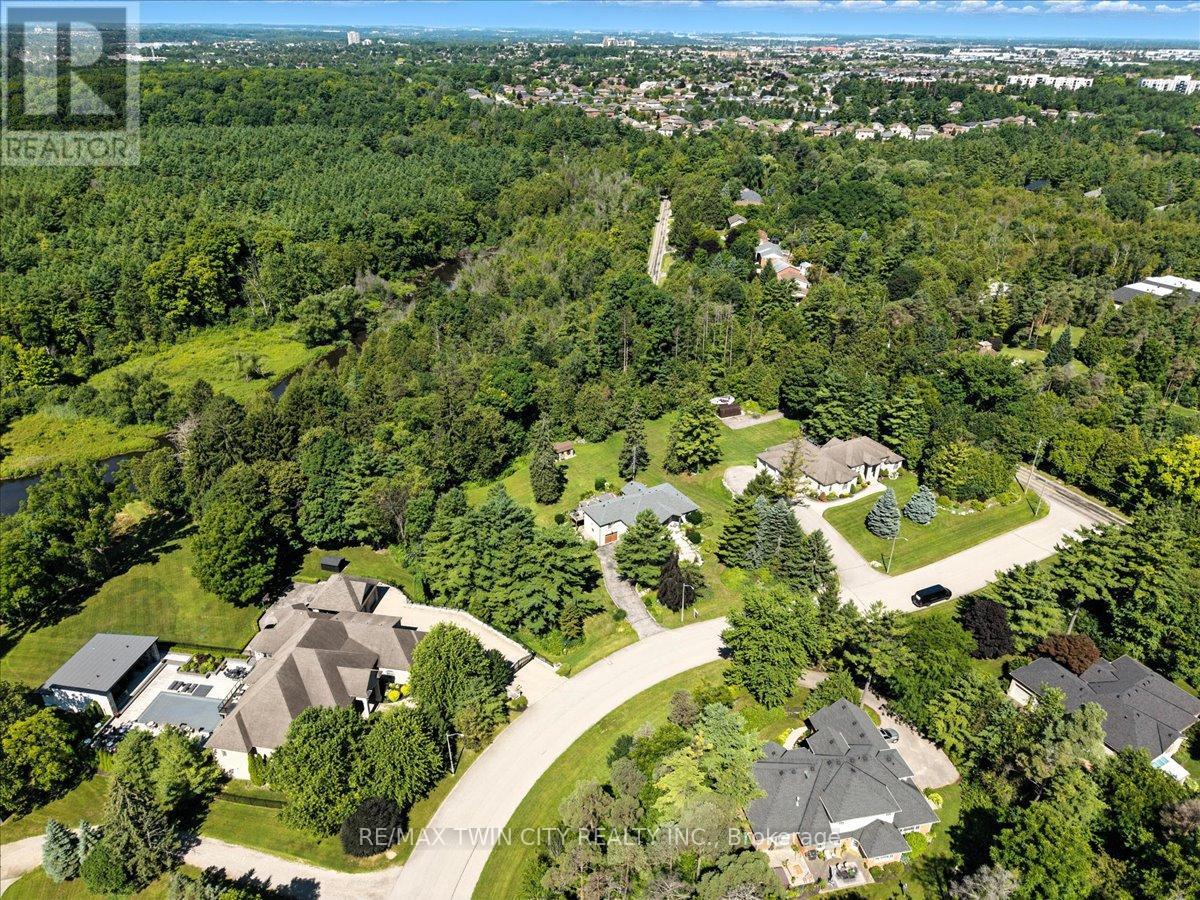 RARE OPPORTUNITY! Custom built raised bungalow on a 1.04-acre lot, offering court location surrounded by protected greenspace. This exclusive, 10 estate court rarely has homes come up for sale and 20 Grandy lane is one that takes full advantage of the natural features, completely backing onto mature forest with direct access to Millcreek conservation land. The home features a stunning all stone exterior with a beautiful retaining wall and carefully set natural stone steps, leading to the front door. The main level layout is wide open with large windows, designed to overlook the backyard from anywhere within the open space and providing access to the elevated multi-level deck completed with composite decking and glass rails. A rich, maple raised panel kitchen sits central with an oversized quartz countertop and raised bar sitting area; elegant crown molding finishes the cabinets to the ceiling with built-in stainless-steel appliances, gas cooktop. Equal in elegance is the built-in family room wall unit featuring gas fireplace insert. A three-sided fireplace separates the dining room from a sunken sitting area providing for an elevated view of the backyard; coffered ceiling accents and hardwood flooring span the space. Completing the space is a large bedroom, laundry, 2-piece bathroom, and the primary suite, complete with walk in closet and recently renovated(2023) 5-piece spa like ensuite. A hardwood staircase leads to the lower level which is still completely above grade; the home was strategically placed to take full advantage of the walkout. Lower level gives access to the oversized, staggered double car garage. Perfectly suited as a multi-generational home, offering three bedrooms, a recently renovated (2023) 4-piece bathroom, recreation room with gas fireplace, and kitchenette along with wet bar. Roof(2024), Additional oversized garden shed for equipment storage. Minutes from the 401, amenities, and schools. Don't miss this truly beautiful property! (id:64974)
