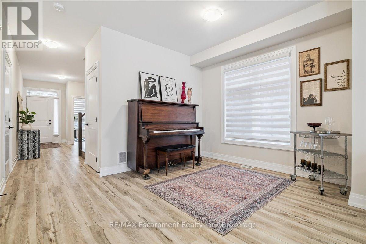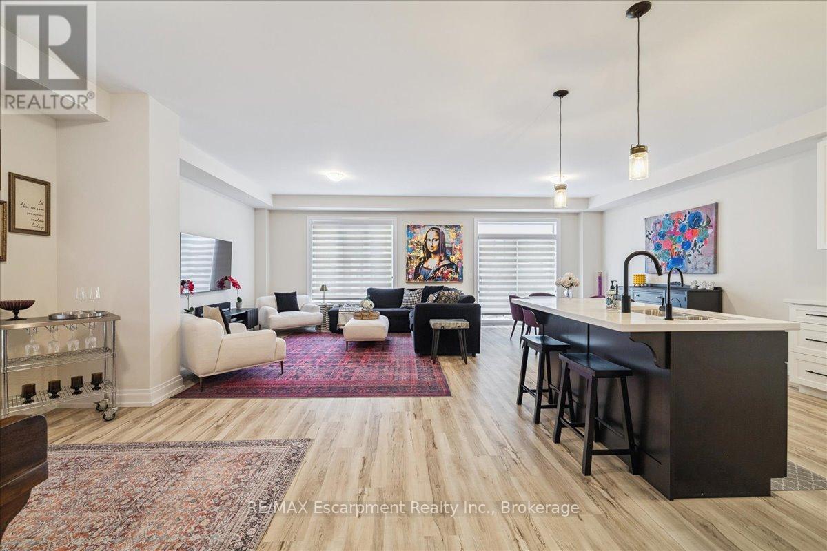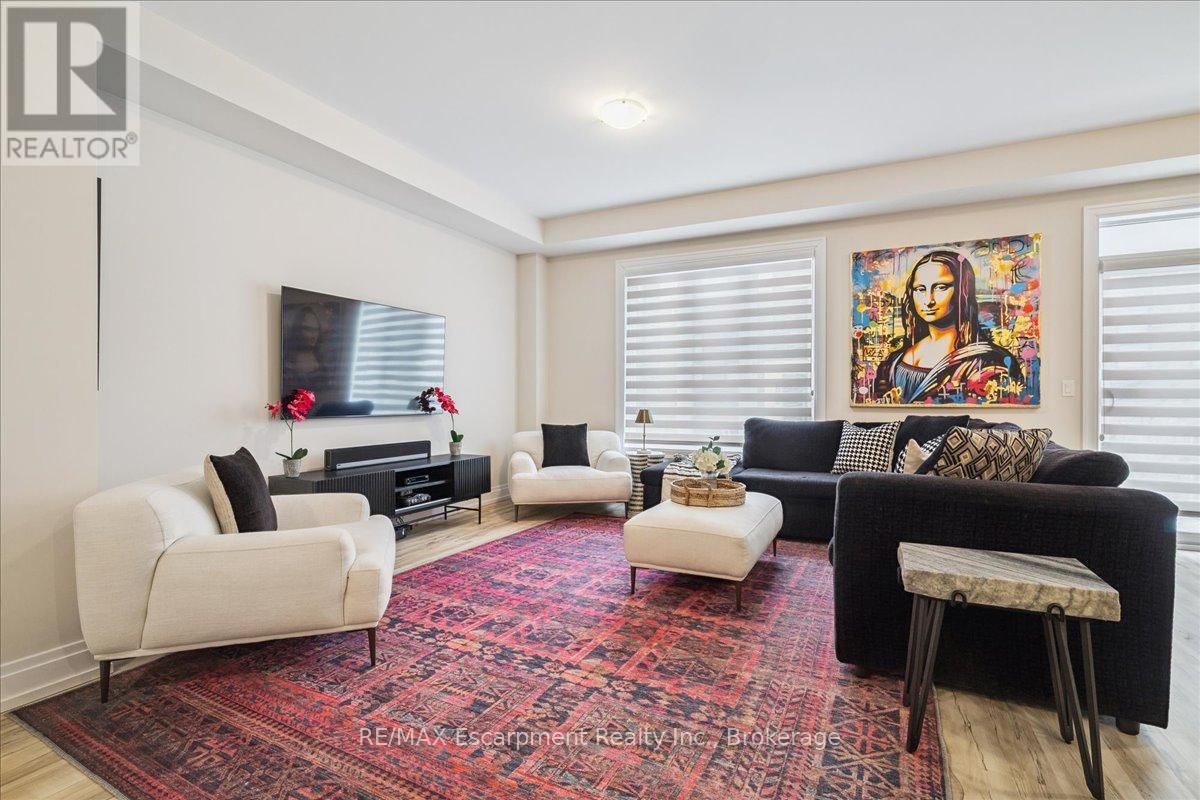 Extensively upgraded, spacious 4 bedroom end unit, 3.5 bathroom townhome in beautiful Waterdown. From the moment you enter, you are welcomed by a seamless open concept layout that flows beautifully between the kitchen, dining and living areas. Main floor comes with 9ft ceilings, oak staircase, smooth ceilings throughout, white kitchen, vinyl plank to entire main floor and upper hallway. The custom kitchen includes S.S. appliances, quartz countertop, matte black fixtures and hardware throughout the home. Main floor also features a versatile den perfect for a private office for those who work from home. Upstairs features four generously sized bedrooms, Berber carpet, 3 full bathrooms including 2 ensuites, laundry, and an oversized walk-in closet. The primary ensuite offers a double vanity with quartz counters and a custom glass shower door. Minutes from Hwy's, Go Station, shopping, schools, trails. This home is thoughtfully designed with quality modern upgrades for both everyday living and refined entertaining. A rare opportunity to own a beautifully upgraded home! (id:64974)
