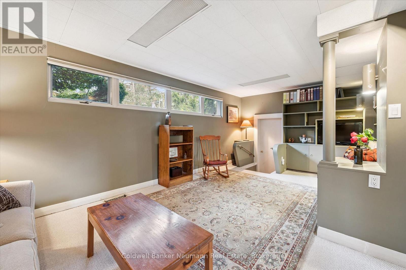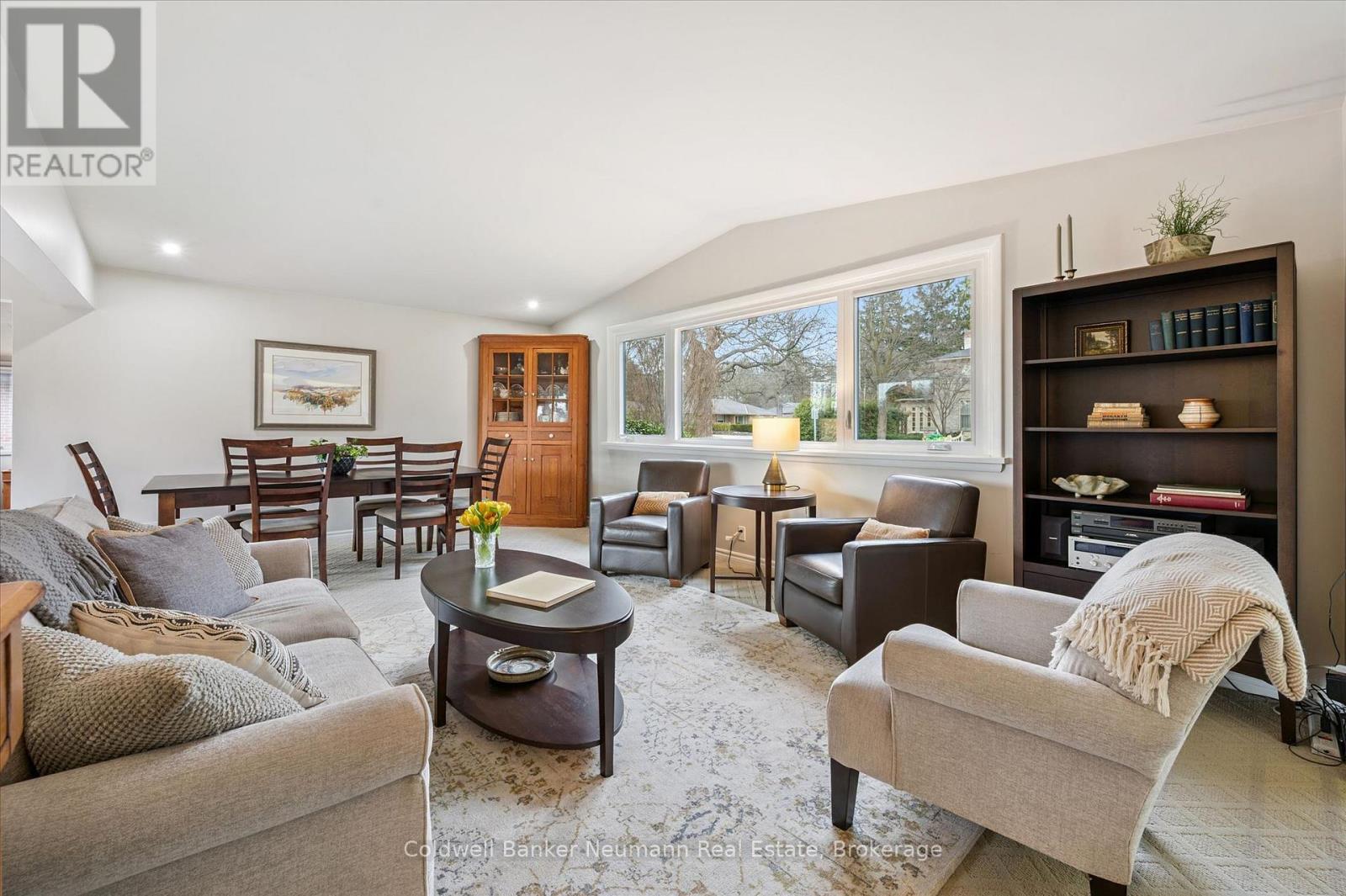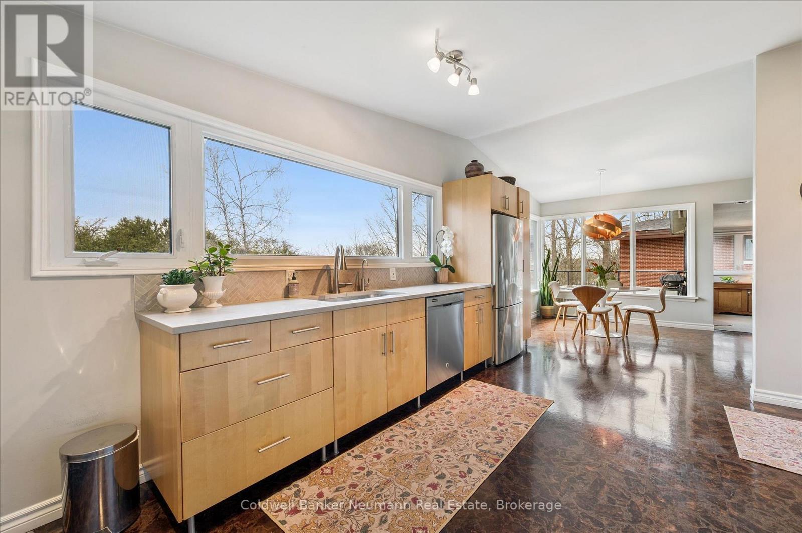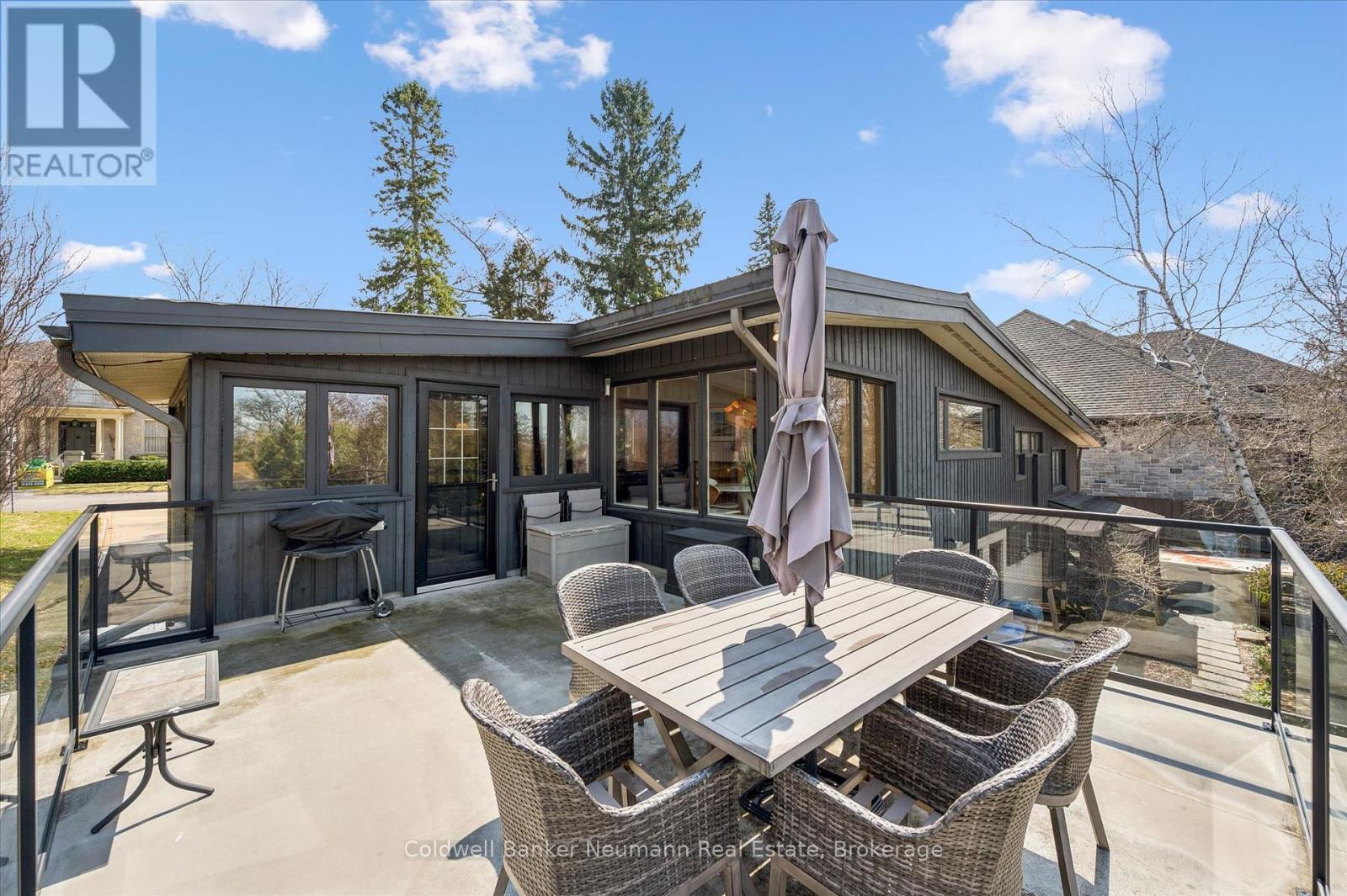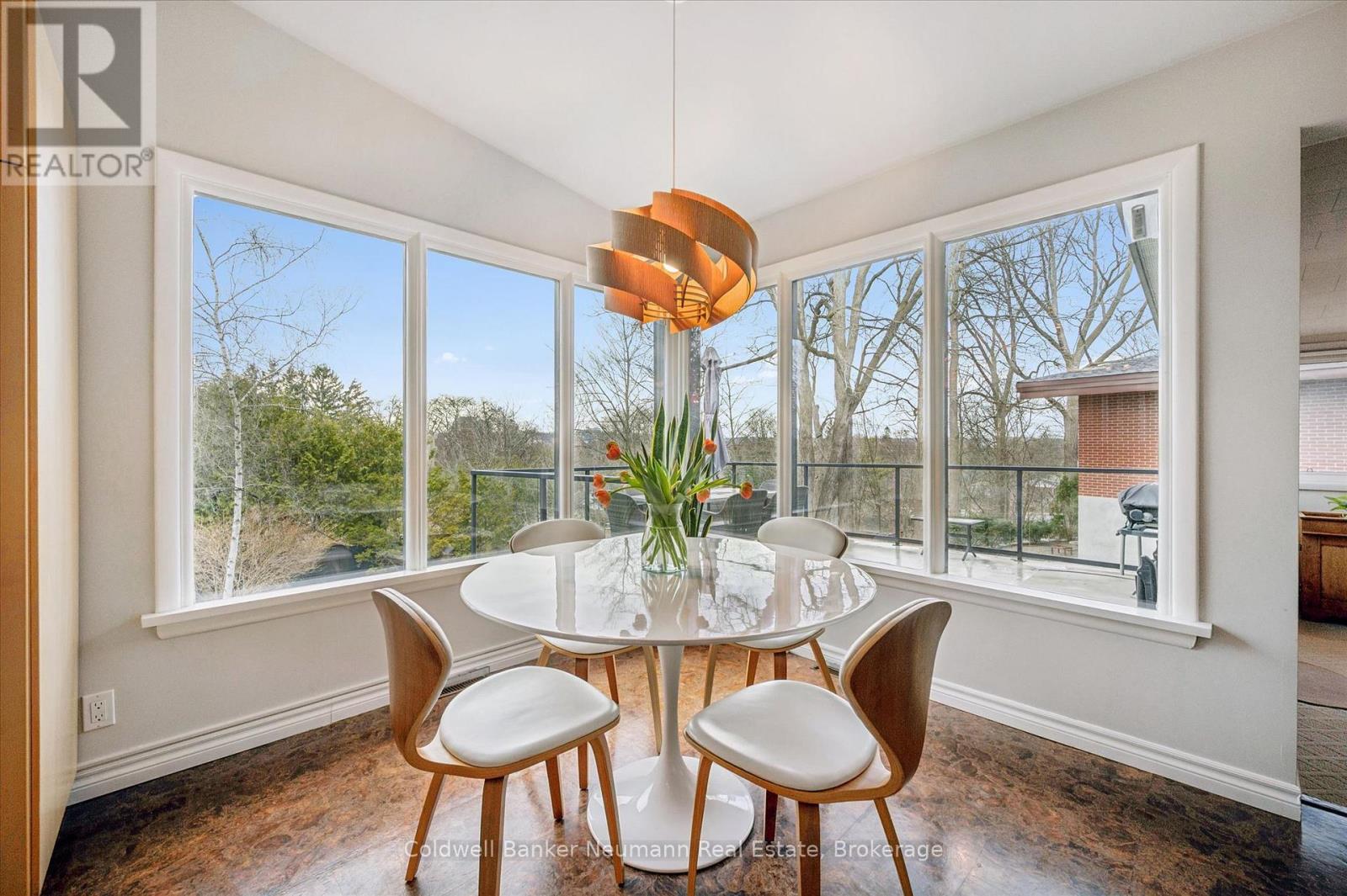 Welcome to this architectural gem, nestled in Guelph's coveted Old University neighbourhood. This mid-century modern home commands panoramic views of downtown Guelph, proudly perched atop Gordon Street hill.Upon entry, a striking corner fireplace pays homage to classic mid-century design, immediately setting the tone for the home's timeless character and warmth. Thoughtfully designed for both everyday living and effortless entertaining, the home features an open-concept kitchen with an eat-in dining area framed by floor-to-ceiling windows overlooking the private backyard. This space flows smoothly into a sunlit living and dining room, where expansive front-facing views create an inviting atmosphere-ideal for hosting and relaxing. Adjacent to the kitchen, a beautifully appointed TV room is surrounded by windows on three sides, immersing the space in natural light and offering direct access to the deck. This private outdoor retreat overlooks the meticulously manicured yard and faces west-delivering unobstructed views and sunsets, all year-round.The primary bedroom enjoys peaceful views over the front yard, while the second bedroom overlooks the lush backyard. Both rooms feature generous built-in storage and ample closet space accompanied by a well-appointed four-piece bathroom. The lower-level walkout features a third bedroom which provides flexibility for growing families or guests, complemented by a three-piece bathroom. Additionally, there is a versatile space offering both an office and guest sleeping quarters. This walkout level connects seamlessly to the backyard and includes a mudroom with access to the laundry area and garage, offering both functionality and convenience. The backyard is exceptional, showcasing mature evergreens and meticulously maintained garden beds within a fully fenced setting. Lovingly maintained and thoughtfully cared for, this is a once-in-a-lifetime opportunity to own a distinctive piece of Guelph's architectural heritage. (id:64974)