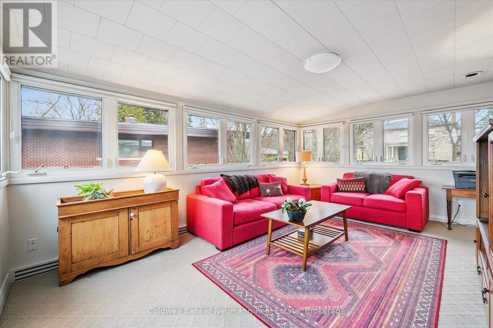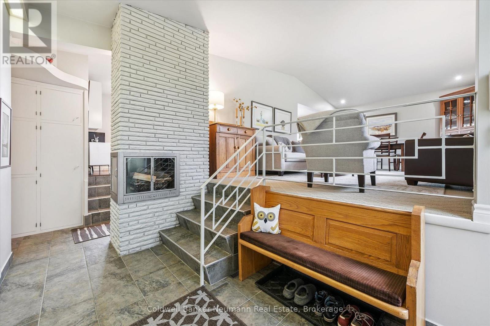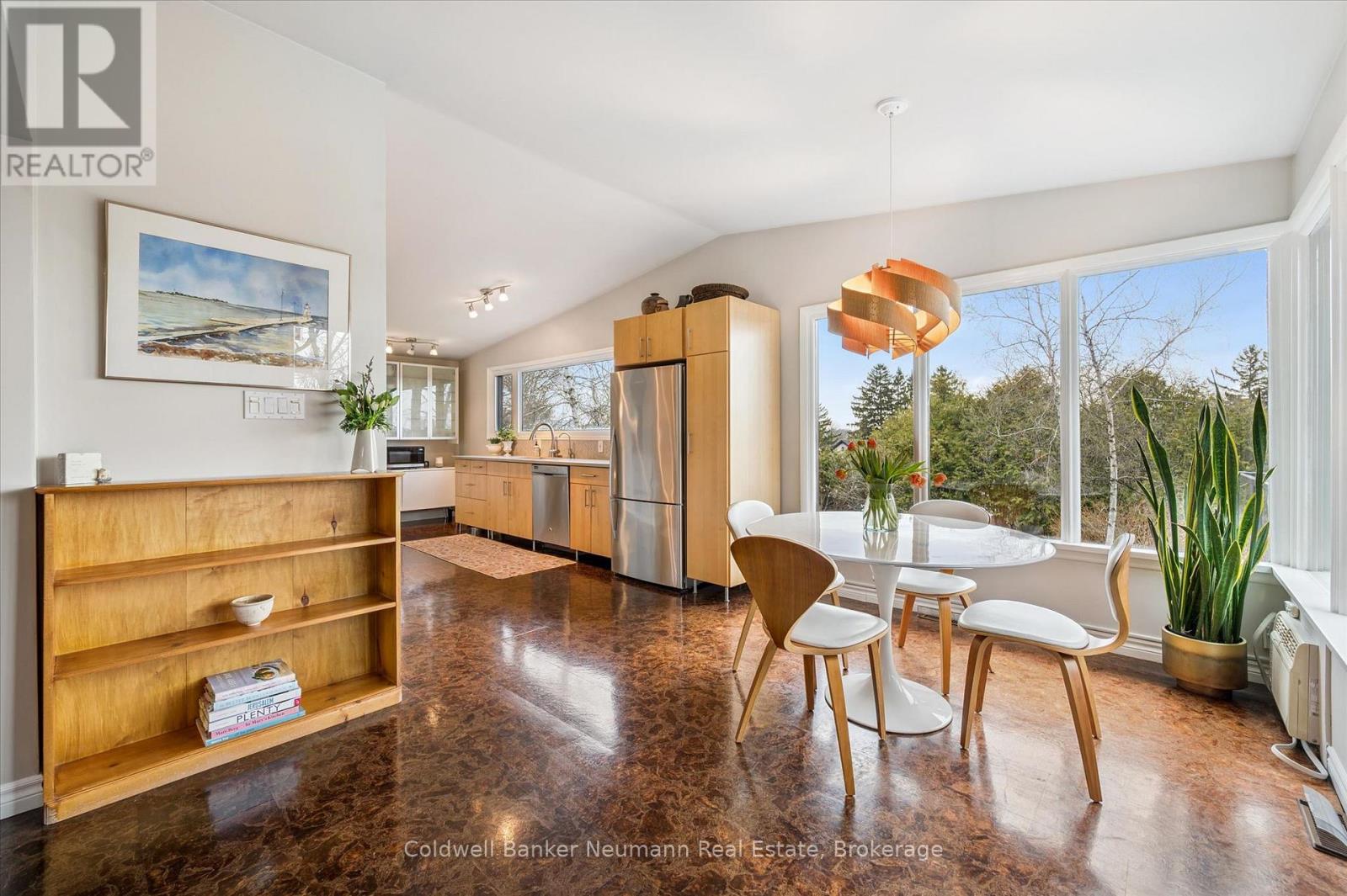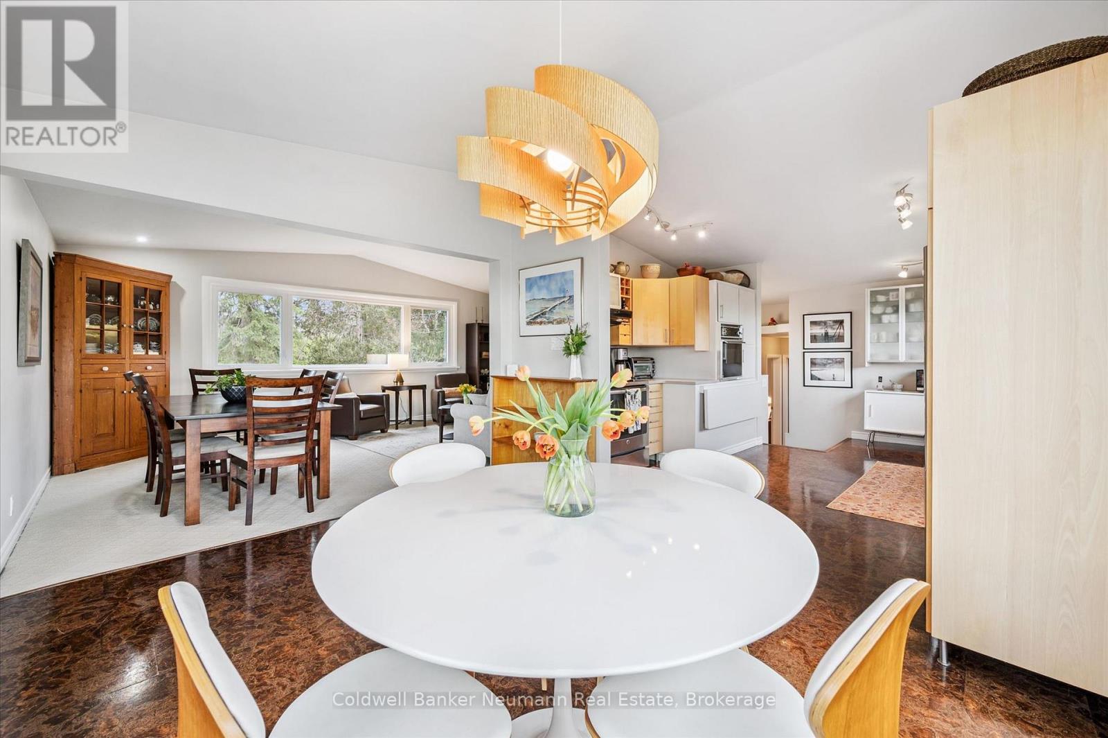 Welcome to this architectural gem, nestled in Guelph's coveted Old University neighbourhood. This mid-century modern home commands panoramic views of downtown Guelph, proudly perched atop Gordon Street hill.Upon entry, a striking corner fireplace pays homage to classic mid-century design, immediately setting the tone for the home's timeless character and warmth. Thoughtfully designed for both everyday living and effortless entertaining, the home features an open-concept kitchen with an eat-in dining area framed by floor-to-ceiling windows overlooking the private backyard. This space flows smoothly into a sunlit living and dining room, where expansive front-facing views create an inviting atmosphere-ideal for hosting and relaxing. Adjacent to the kitchen, a beautifully appointed TV room is surrounded by windows on three sides, immersing the space in natural light and offering direct access to the deck. This private outdoor retreat overlooks the meticulously manicured yard and faces west-delivering unobstructed views and sunsets, all year-round.The primary bedroom enjoys peaceful views over the front yard, while the second bedroom overlooks the lush backyard. Both rooms feature generous built-in storage and ample closet space accompanied by a well-appointed four-piece bathroom. The lower-level walkout features a third bedroom which provides flexibility for growing families or guests, complemented by a three-piece bathroom. Additionally, there is a versatile space offering both an office and guest sleeping quarters. This walkout level connects seamlessly to the backyard and includes a mudroom with access to the laundry area and garage, offering both functionality and convenience. The backyard is exceptional, showcasing mature evergreens and meticulously maintained garden beds within a fully fenced setting. Lovingly maintained and thoughtfully cared for, this is a once-in-a-lifetime opportunity to own a distinctive piece of Guelph's architectural heritage. (id:64974)