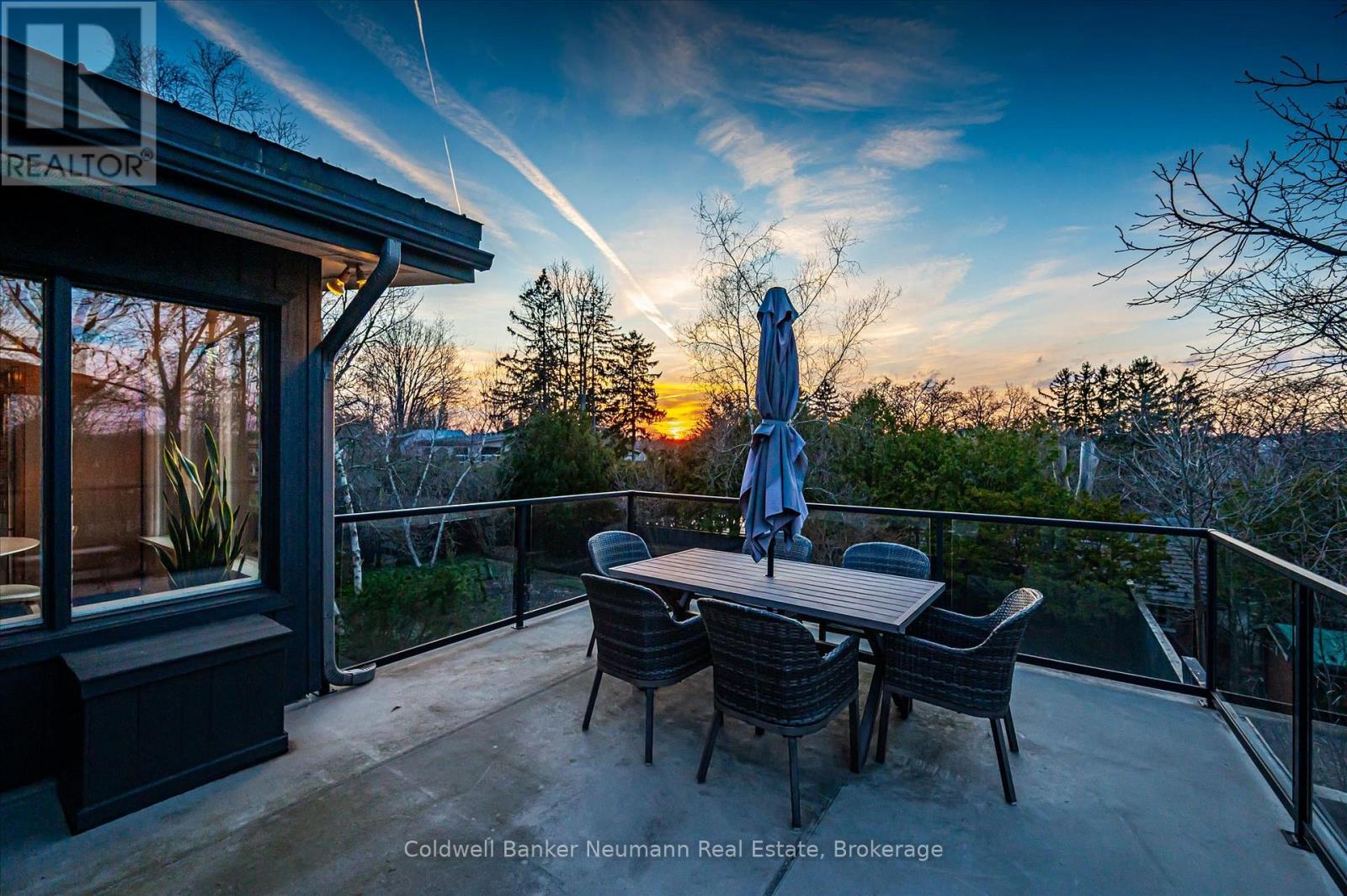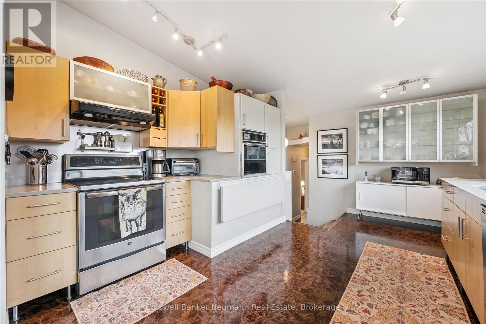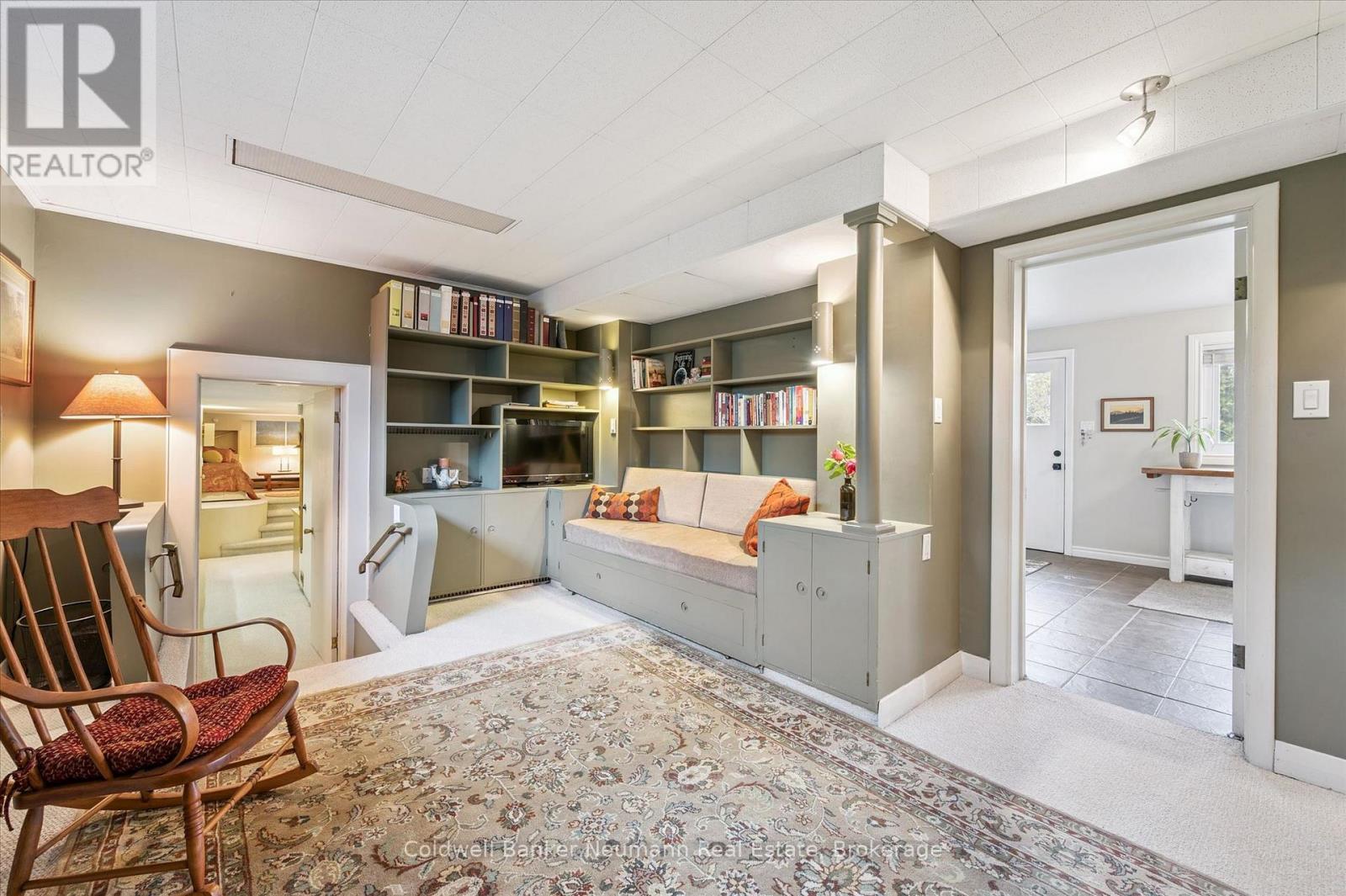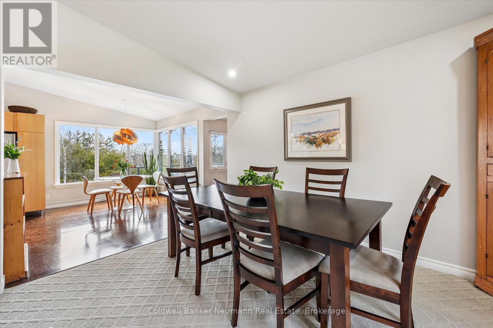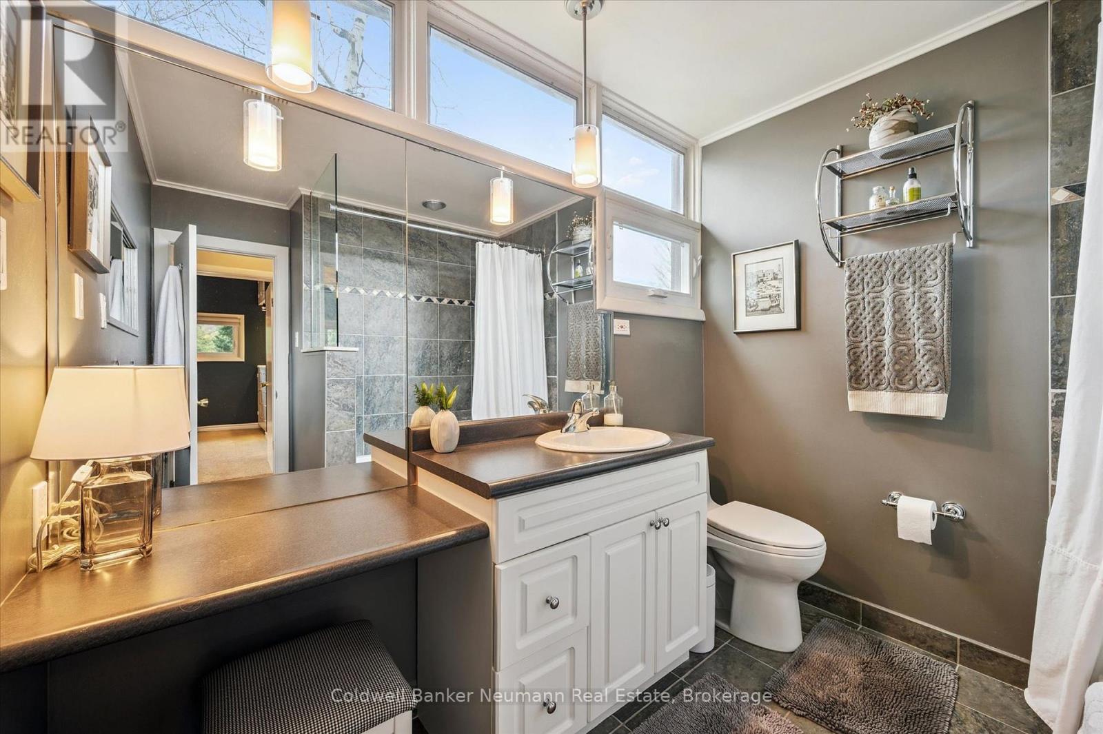 Welcome to this architectural gem, nestled in Guelph's coveted Old University neighbourhood. This mid-century modern home commands panoramic views of downtown Guelph, proudly perched atop Gordon Street hill.Upon entry, a striking corner fireplace pays homage to classic mid-century design, immediately setting the tone for the home's timeless character and warmth. Thoughtfully designed for both everyday living and effortless entertaining, the home features an open-concept kitchen with an eat-in dining area framed by floor-to-ceiling windows overlooking the private backyard. This space flows smoothly into a sunlit living and dining room, where expansive front-facing views create an inviting atmosphere-ideal for hosting and relaxing. Adjacent to the kitchen, a beautifully appointed TV room is surrounded by windows on three sides, immersing the space in natural light and offering direct access to the deck. This private outdoor retreat overlooks the meticulously manicured yard and faces west-delivering unobstructed views and sunsets, all year-round.The primary bedroom enjoys peaceful views over the front yard, while the second bedroom overlooks the lush backyard. Both rooms feature generous built-in storage and ample closet space accompanied by a well-appointed four-piece bathroom. The lower-level walkout features a third bedroom which provides flexibility for growing families or guests, complemented by a three-piece bathroom. Additionally, there is a versatile space offering both an office and guest sleeping quarters. This walkout level connects seamlessly to the backyard and includes a mudroom with access to the laundry area and garage, offering both functionality and convenience. The backyard is exceptional, showcasing mature evergreens and meticulously maintained garden beds within a fully fenced setting. Lovingly maintained and thoughtfully cared for, this is a once-in-a-lifetime opportunity to own a distinctive piece of Guelph's architectural heritage. (id:64974)