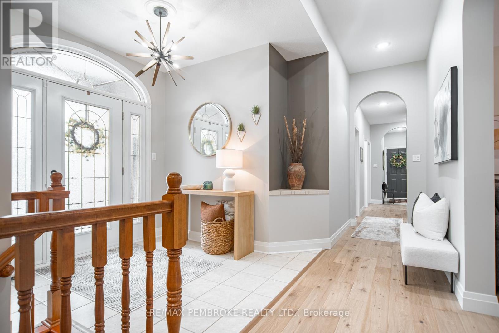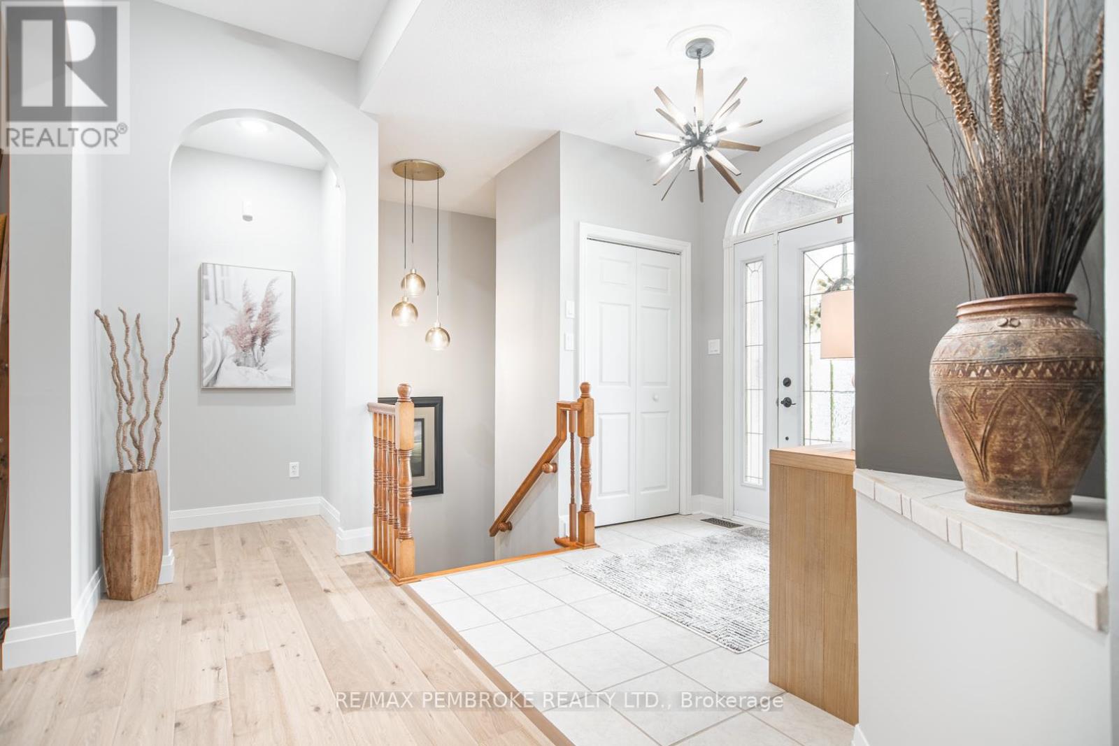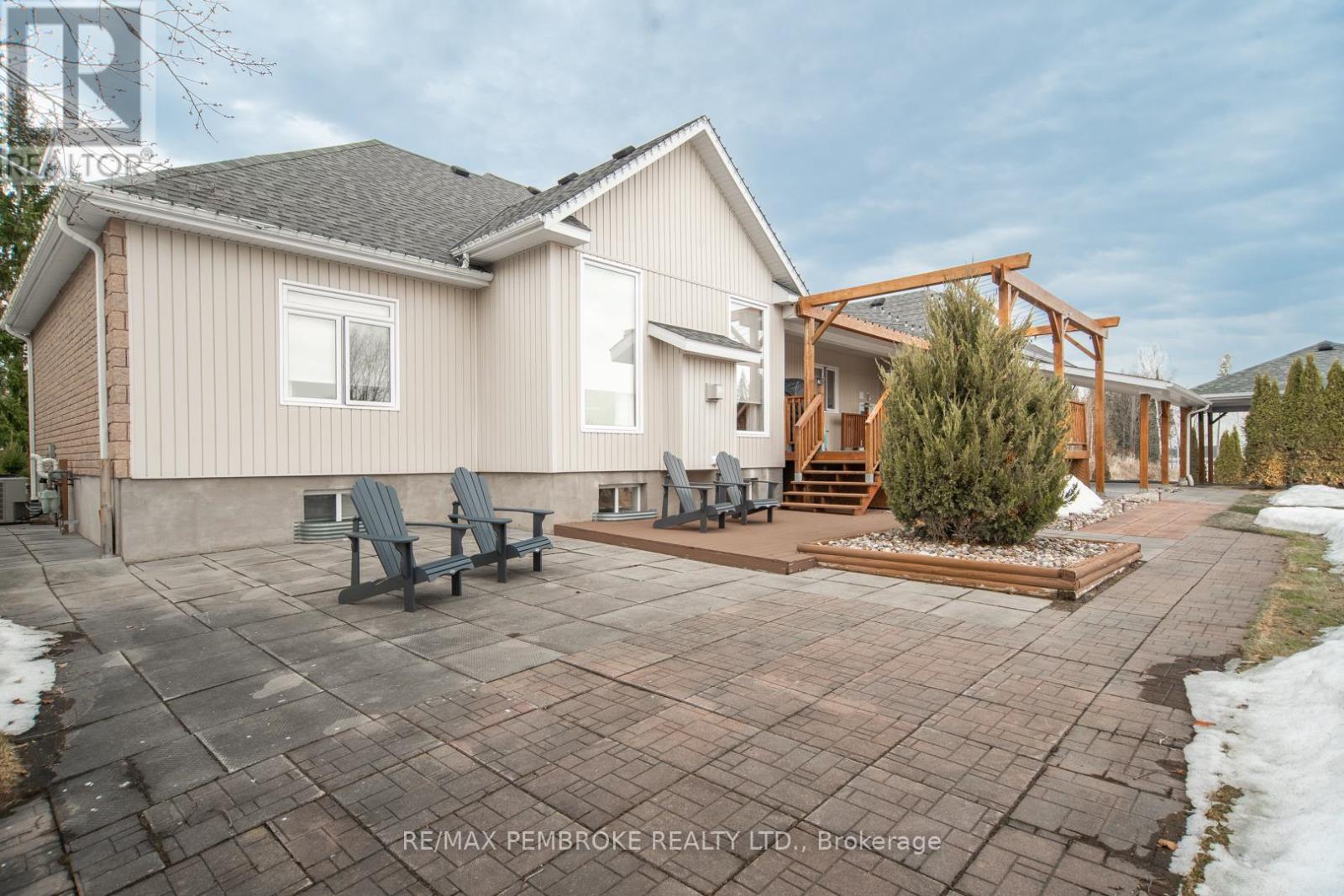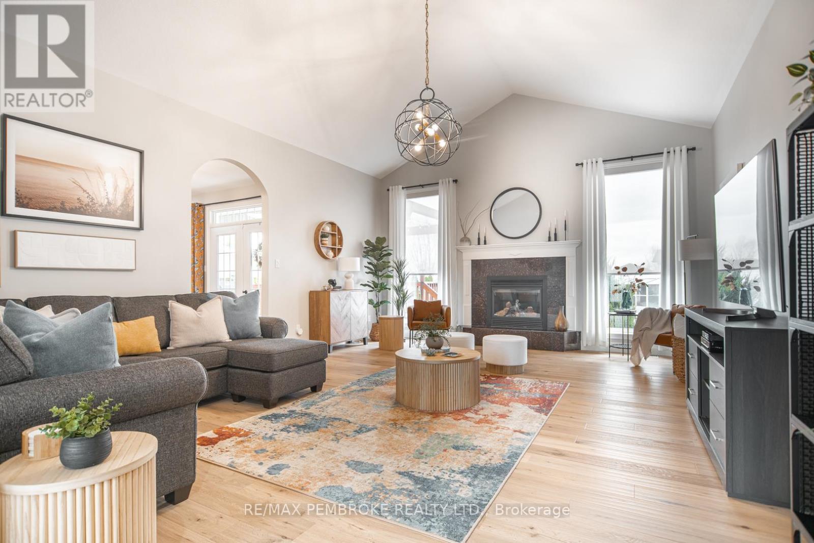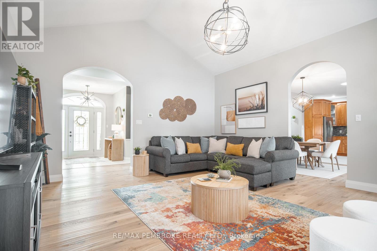 Stunning executive 3+1 bedroom, 3 bathroom home set in a prestigious neighbourhood ideally located between Petawawa and Pembroke, offering breathtaking views of the Ottawa River and deeded water access-perfect for kayaking, paddleboarding, and seadooing. This stately, meticulously maintained home boasts impressive high ceilings. The spectacular living room offers a gas fireplace and vaulted ceiling that creates a warm and inviting focal point. The bright open kitchen features remote-controlled blinds (also in living room) quartz counters, all appliances and flows seamlessly into the main living space-ideal for both everyday living and entertaining.The spacious primary suite offers a private retreat complete with a walk through closet and ensuite bath. The main bathroom has been tastefully updated and includes a jet tub/shower combo.The finished lower level expands your living space with a fourth bedroom, additional bathroom, large family room, theatre room and a dedicated gym area-perfect for growing families, guests, or multi-functional living. Car enthusiasts and hobbyists will appreciate the attached insulated triple car garage with hot and cold water, along with a convenient double carport. Step outside to a large back deck or hang out in the gazebo, perfect for relaxing or hosting, surrounded by a beautifully maintained yard featuring a patio and full irrigation system installed in 2024.This immaculate home has been lovingly cared for and extensively updated, including shingles on the house (2021), carport shingles (2025), water softener (2022), hot water tank (2022), duct cleaning (2022), well pump (2024), gas furnace (2024), and updated main floor window panes (2022), along with new lighting and fresh paint throughout. A rare opportunity to own a turn-key home with upscale features, exceptional maintenance, and deeded access to the Ottawa River in one of the area's most sought-after communities. (id:64974)