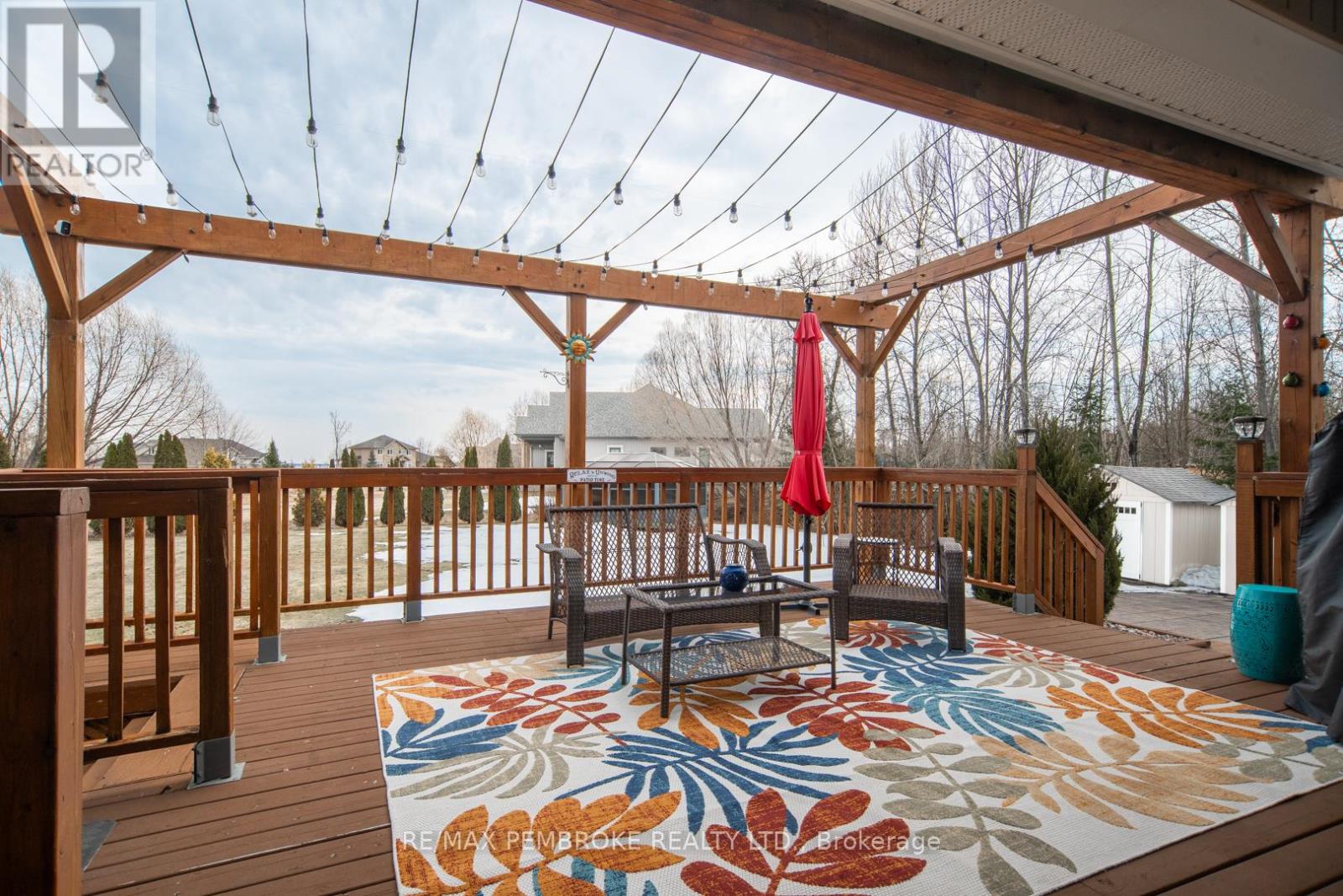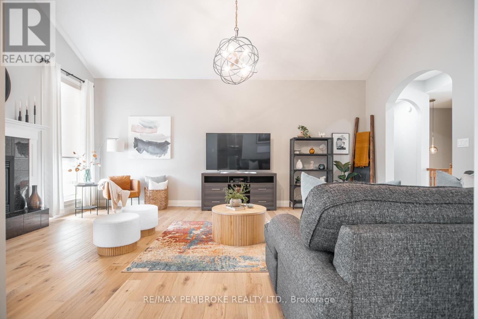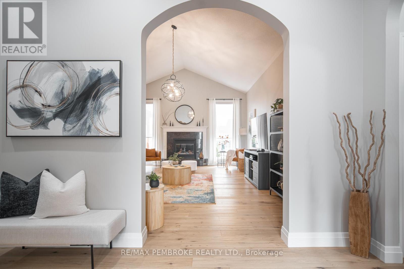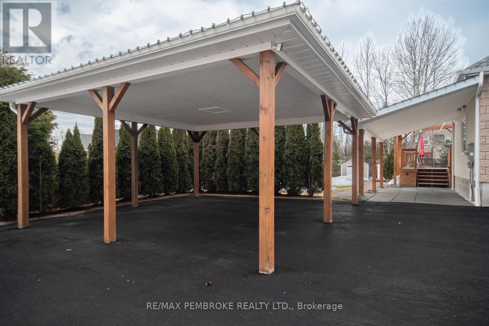 Stunning executive 3+1 bedroom, 3 bathroom home set in a prestigious neighbourhood ideally located between Petawawa and Pembroke, offering breathtaking views of the Ottawa River and deeded water access-perfect for kayaking, paddleboarding, and seadooing. This stately, meticulously maintained home boasts impressive high ceilings. The spectacular living room offers a gas fireplace and vaulted ceiling that creates a warm and inviting focal point. The bright open kitchen features remote-controlled blinds (also in living room) quartz counters, all appliances and flows seamlessly into the main living space-ideal for both everyday living and entertaining.The spacious primary suite offers a private retreat complete with a walk through closet and ensuite bath. The main bathroom has been tastefully updated and includes a jet tub/shower combo.The finished lower level expands your living space with a fourth bedroom, additional bathroom, large family room, theatre room and a dedicated gym area-perfect for growing families, guests, or multi-functional living. Car enthusiasts and hobbyists will appreciate the attached insulated triple car garage with hot and cold water, along with a convenient double carport. Step outside to a large back deck or hang out in the gazebo, perfect for relaxing or hosting, surrounded by a beautifully maintained yard featuring a patio and full irrigation system installed in 2024.This immaculate home has been lovingly cared for and extensively updated, including shingles on the house (2021), carport shingles (2025), water softener (2022), hot water tank (2022), duct cleaning (2022), well pump (2024), gas furnace (2024), and updated main floor window panes (2022), along with new lighting and fresh paint throughout. A rare opportunity to own a turn-key home with upscale features, exceptional maintenance, and deeded access to the Ottawa River in one of the area's most sought-after communities. (id:64974)