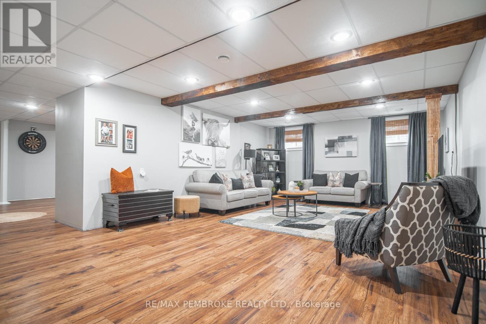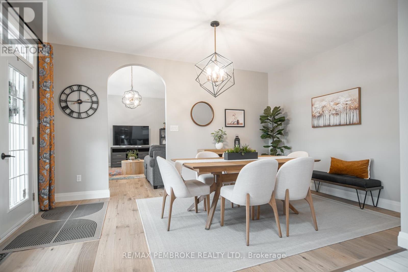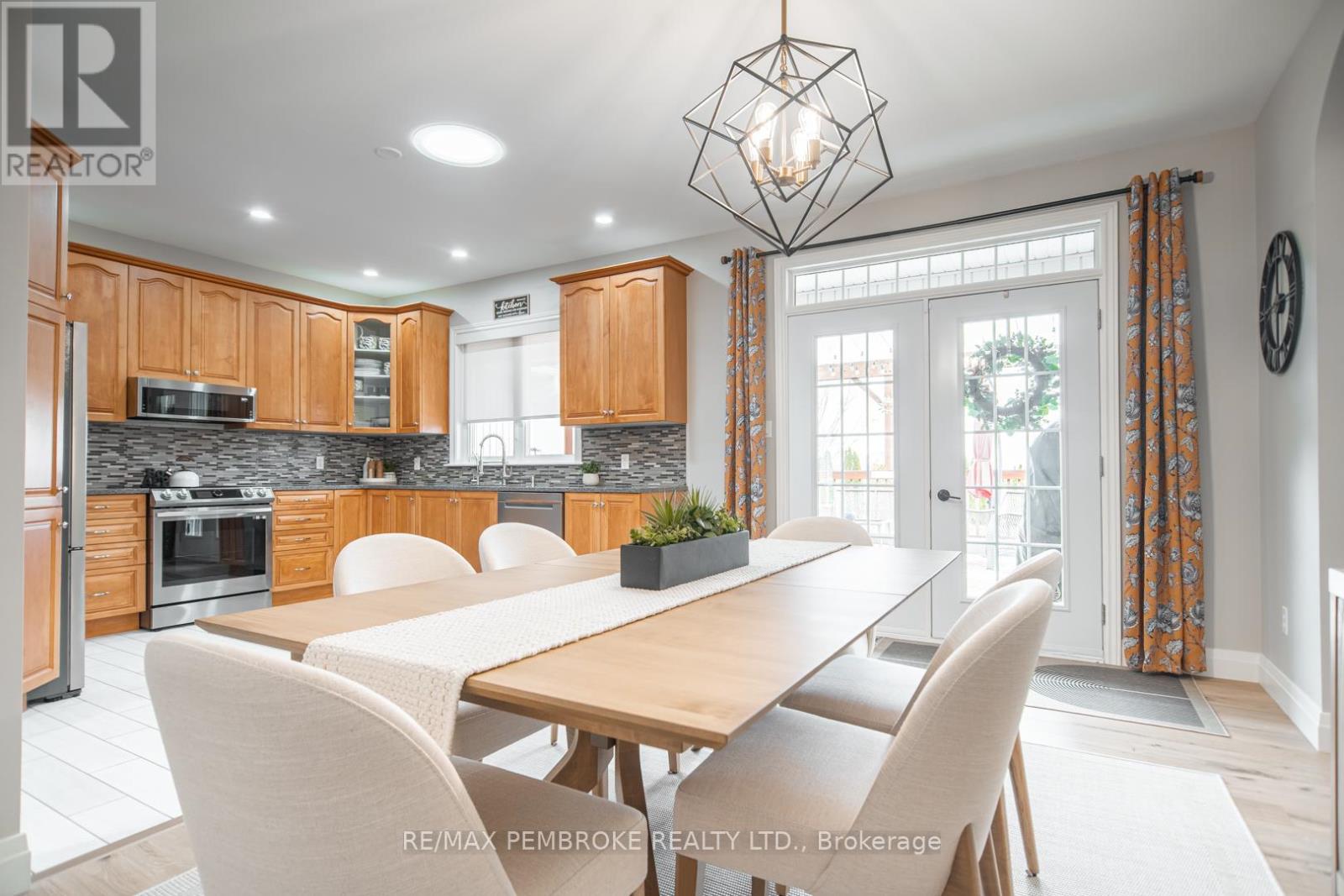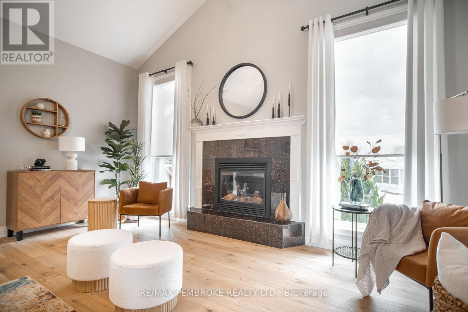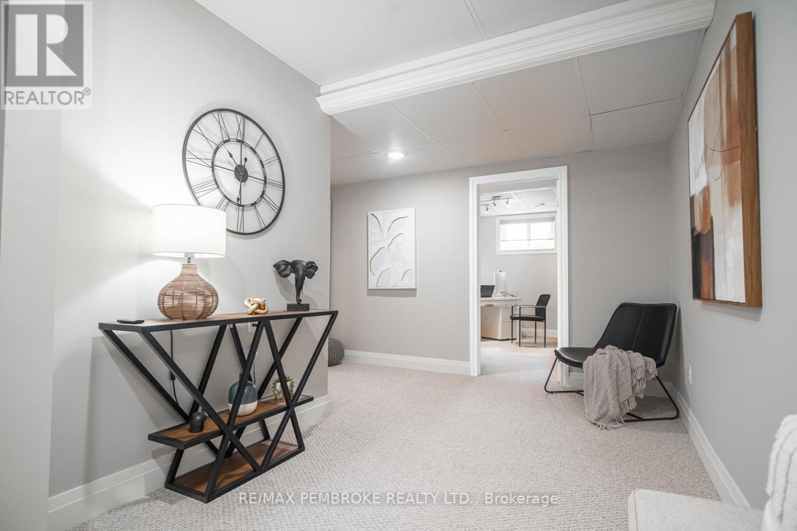 Stunning executive 3+1 bedroom, 3 bathroom home set in a prestigious neighbourhood ideally located between Petawawa and Pembroke, offering breathtaking views of the Ottawa River and deeded water access-perfect for kayaking, paddleboarding, and seadooing. This stately, meticulously maintained home boasts impressive high ceilings. The spectacular living room offers a gas fireplace and vaulted ceiling that creates a warm and inviting focal point. The bright open kitchen features remote-controlled blinds (also in living room) quartz counters, all appliances and flows seamlessly into the main living space-ideal for both everyday living and entertaining.The spacious primary suite offers a private retreat complete with a walk through closet and ensuite bath. The main bathroom has been tastefully updated and includes a jet tub/shower combo.The finished lower level expands your living space with a fourth bedroom, additional bathroom, large family room, theatre room and a dedicated gym area-perfect for growing families, guests, or multi-functional living. Car enthusiasts and hobbyists will appreciate the attached insulated triple car garage with hot and cold water, along with a convenient double carport. Step outside to a large back deck or hang out in the gazebo, perfect for relaxing or hosting, surrounded by a beautifully maintained yard featuring a patio and full irrigation system installed in 2024.This immaculate home has been lovingly cared for and extensively updated, including shingles on the house (2021), carport shingles (2025), water softener (2022), hot water tank (2022), duct cleaning (2022), well pump (2024), gas furnace (2024), and updated main floor window panes (2022), along with new lighting and fresh paint throughout. A rare opportunity to own a turn-key home with upscale features, exceptional maintenance, and deeded access to the Ottawa River in one of the area's most sought-after communities. (id:64974)